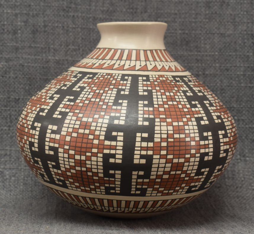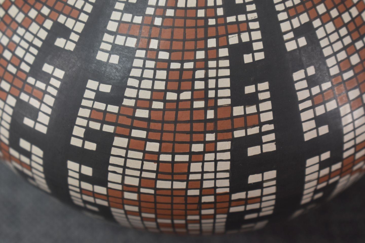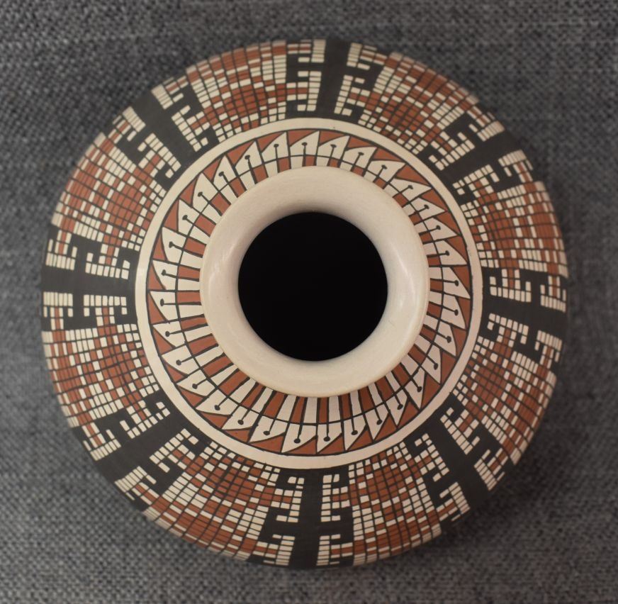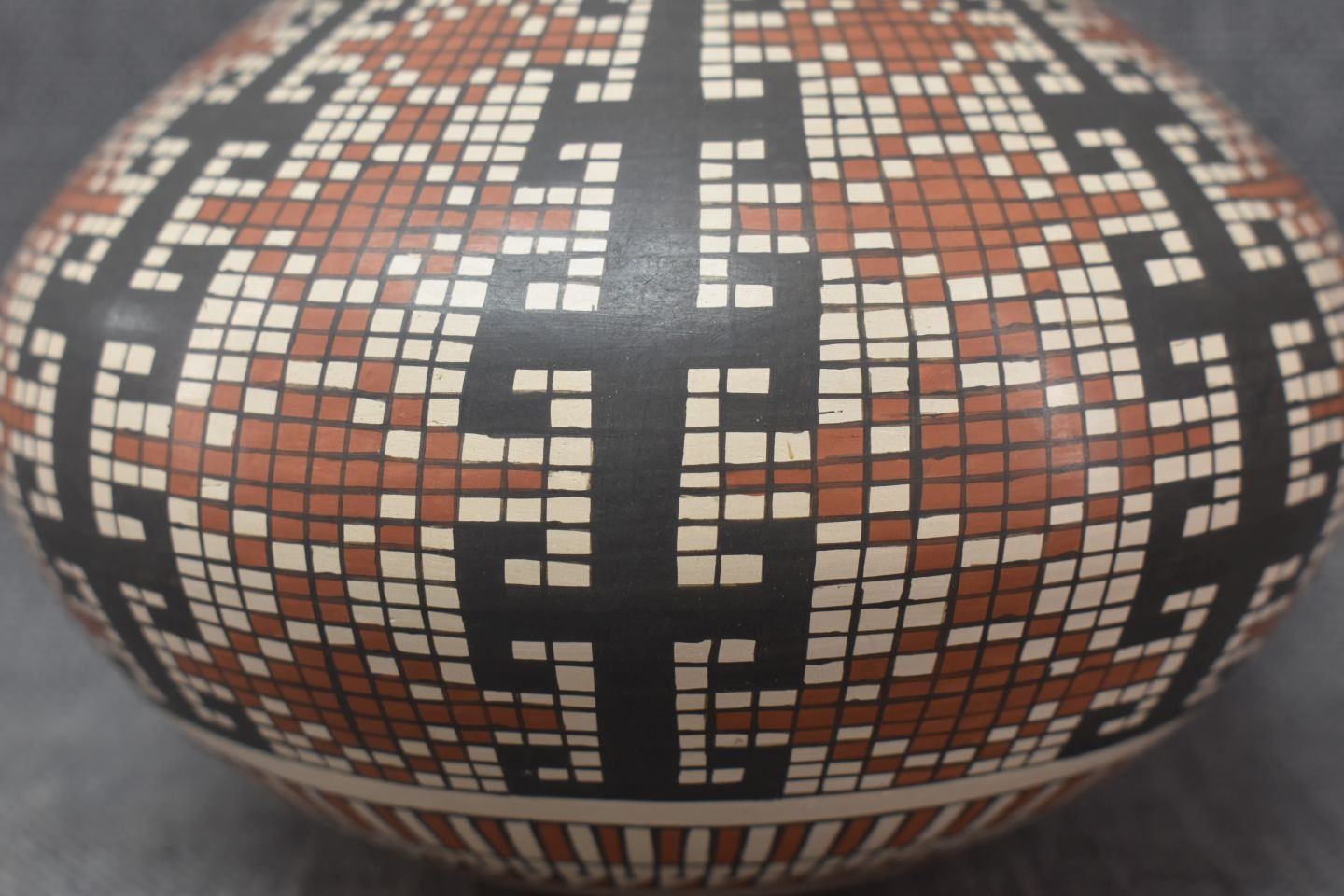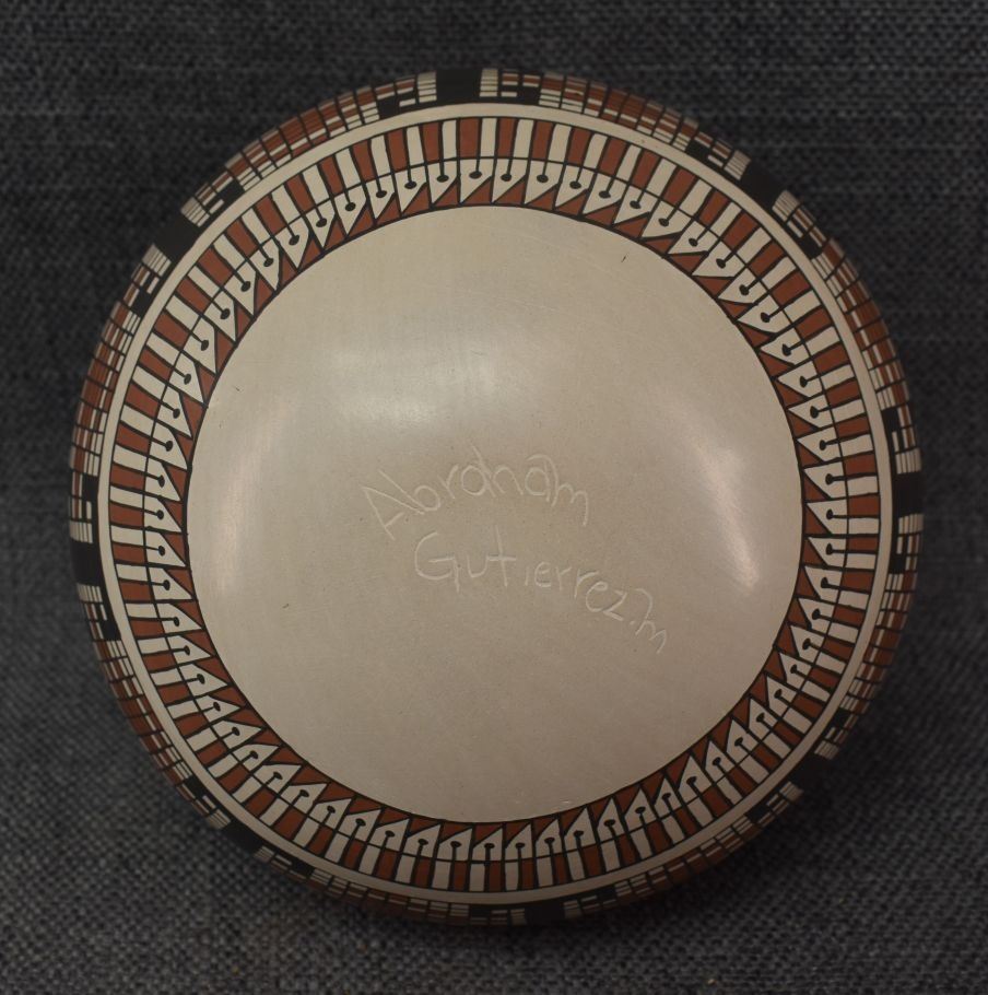 1980-90's Mata Ortiz, hand made with polychrome painted geometric design singed Abraham Gutierrez 5.25" x 6"