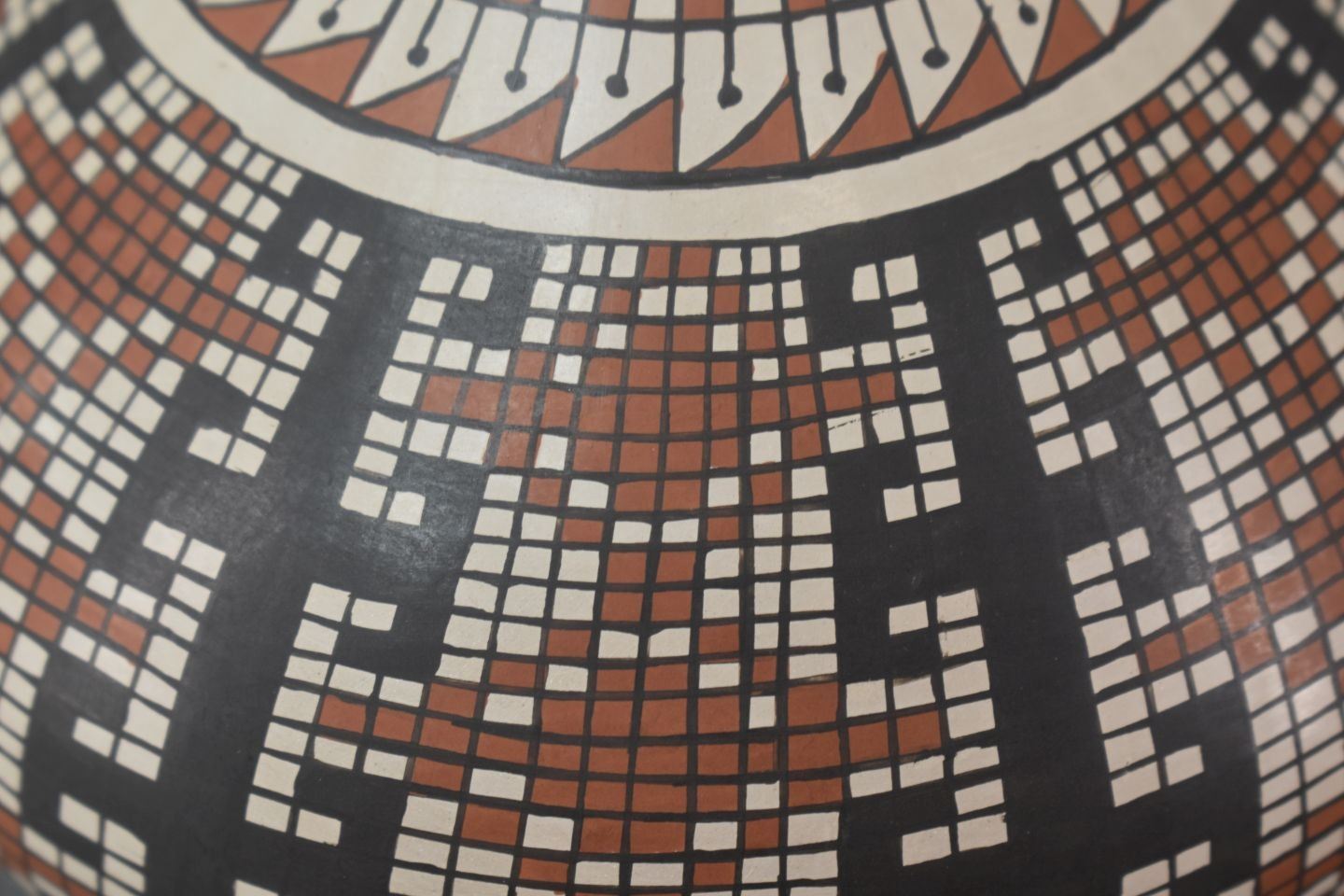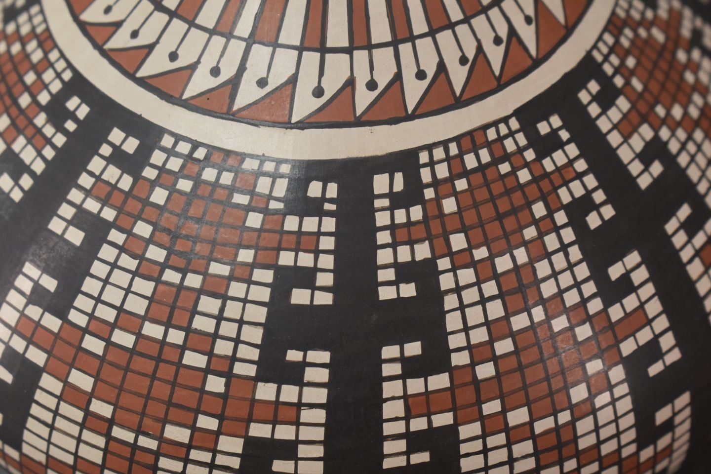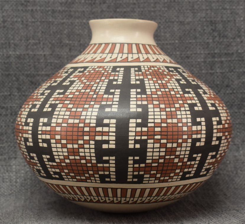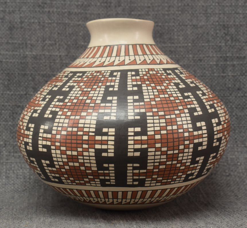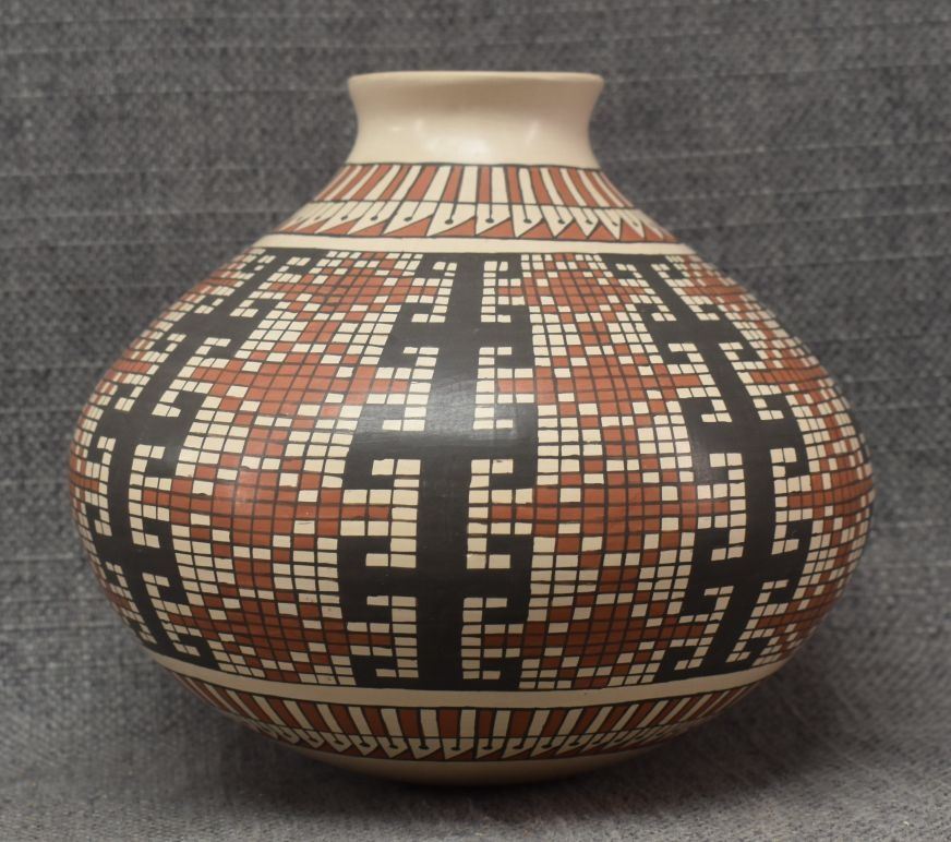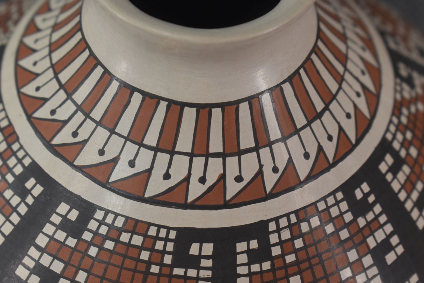 1980-90's Mata Ortiz, hand made with polychrome painted geometric design singed Abraham Gutierrez 5.25" x 6"