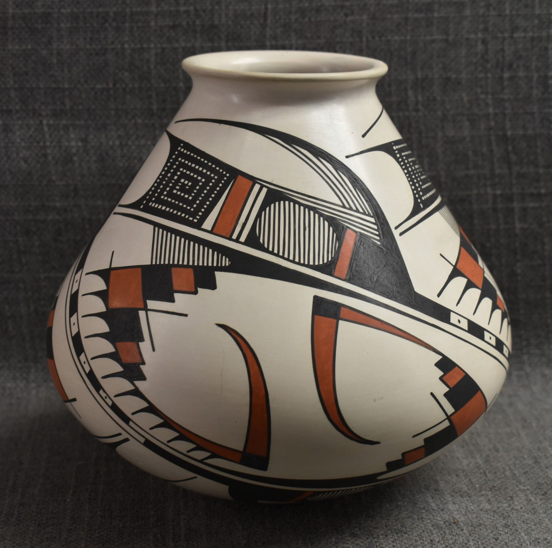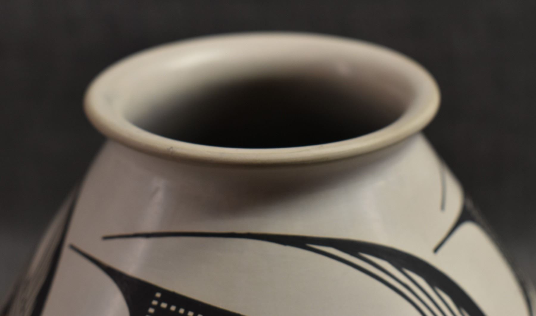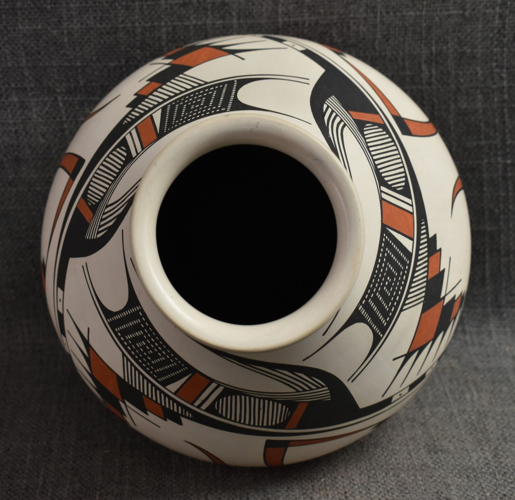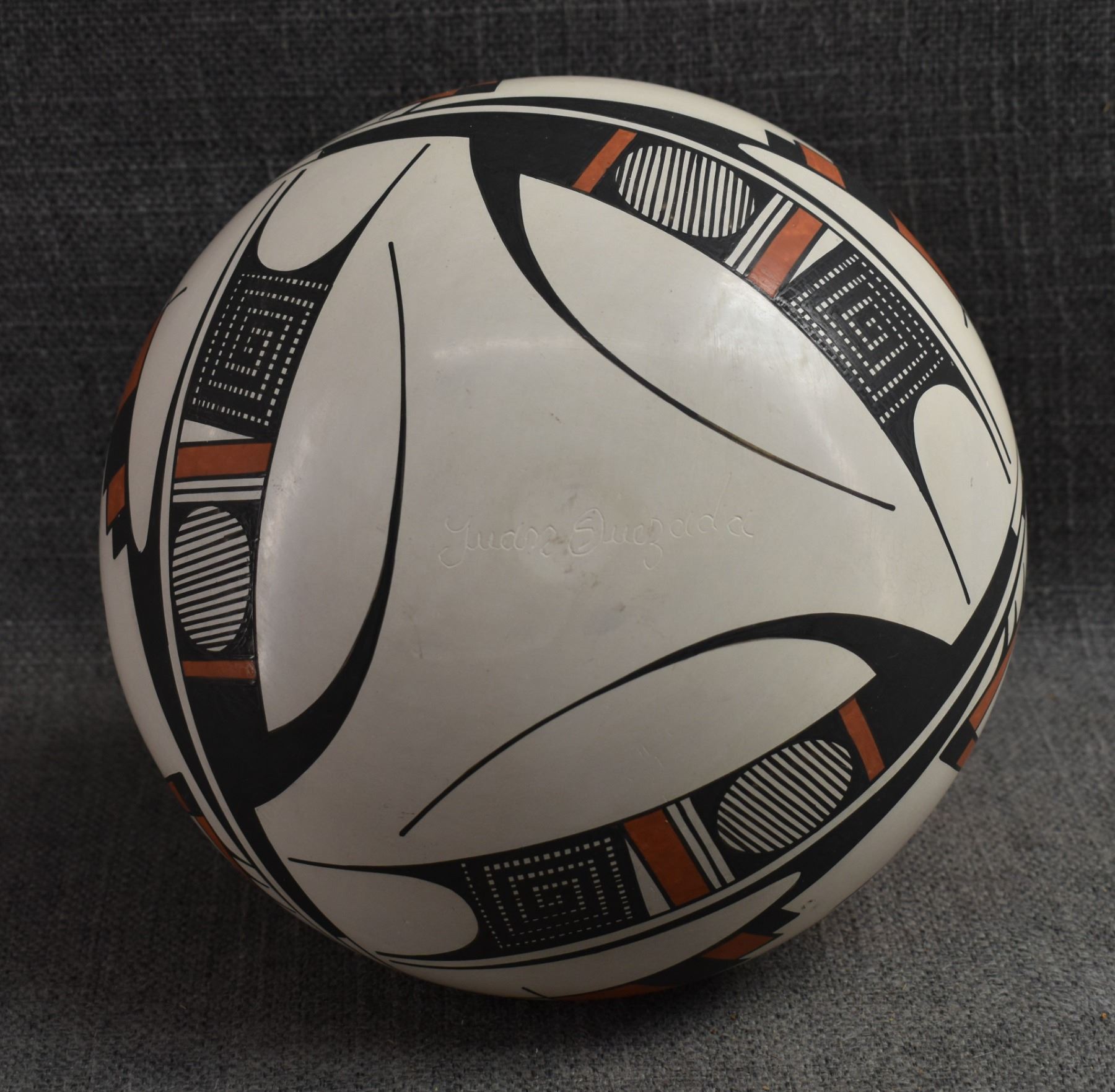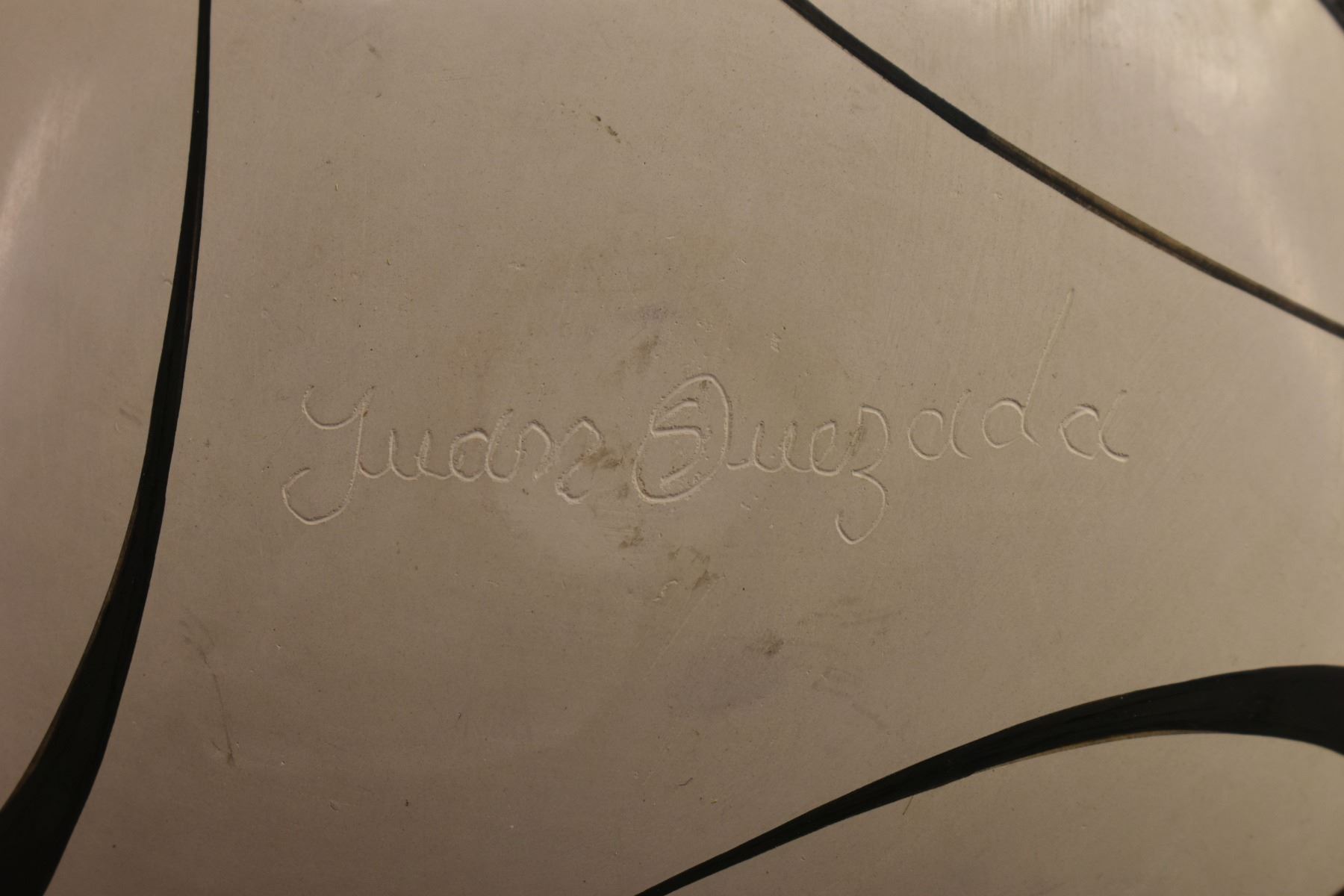 1990's Mata Ortiz. Hand coiled an painted polychrome design pottery olla. Signed Juan Quezada. 6.5'' x 7.5''