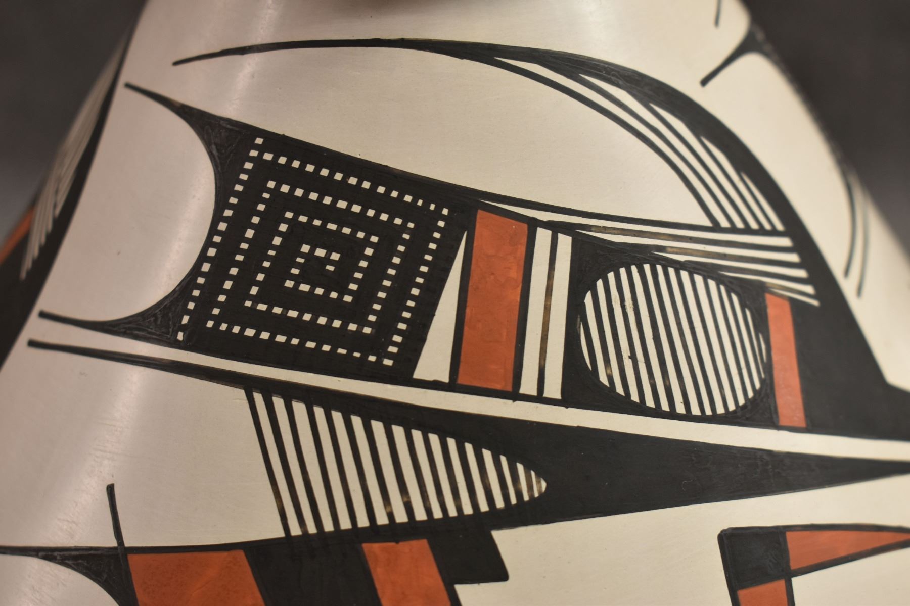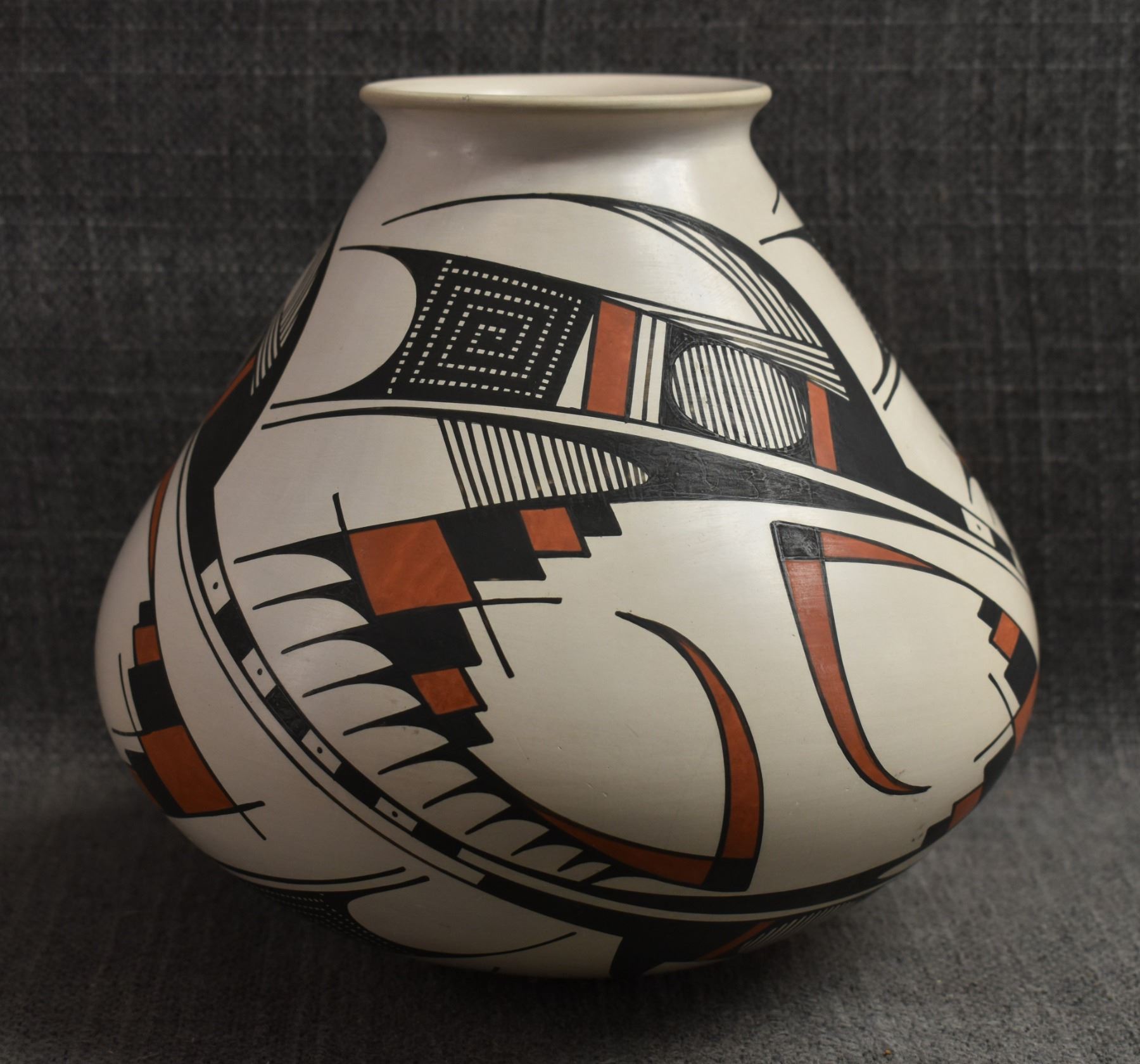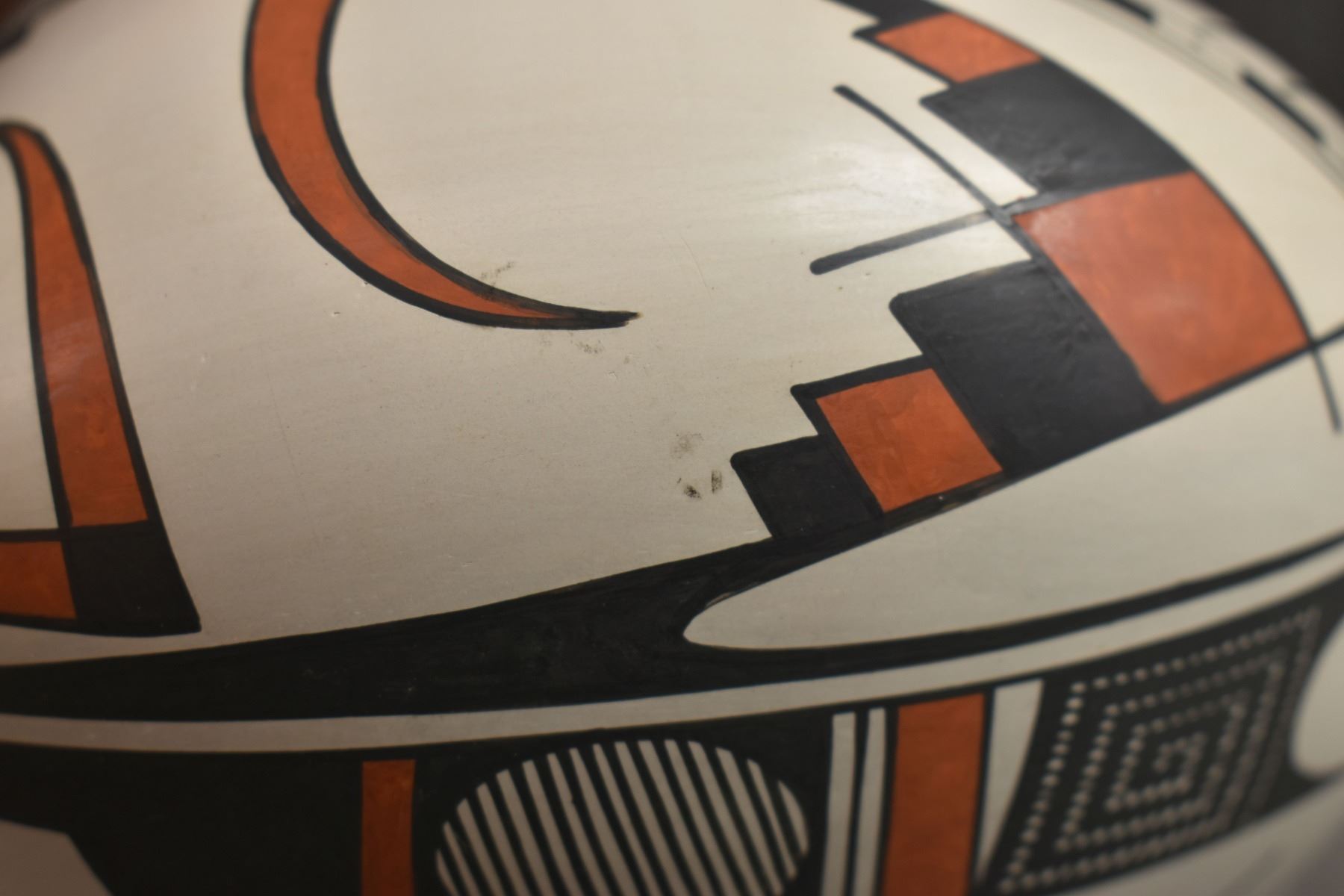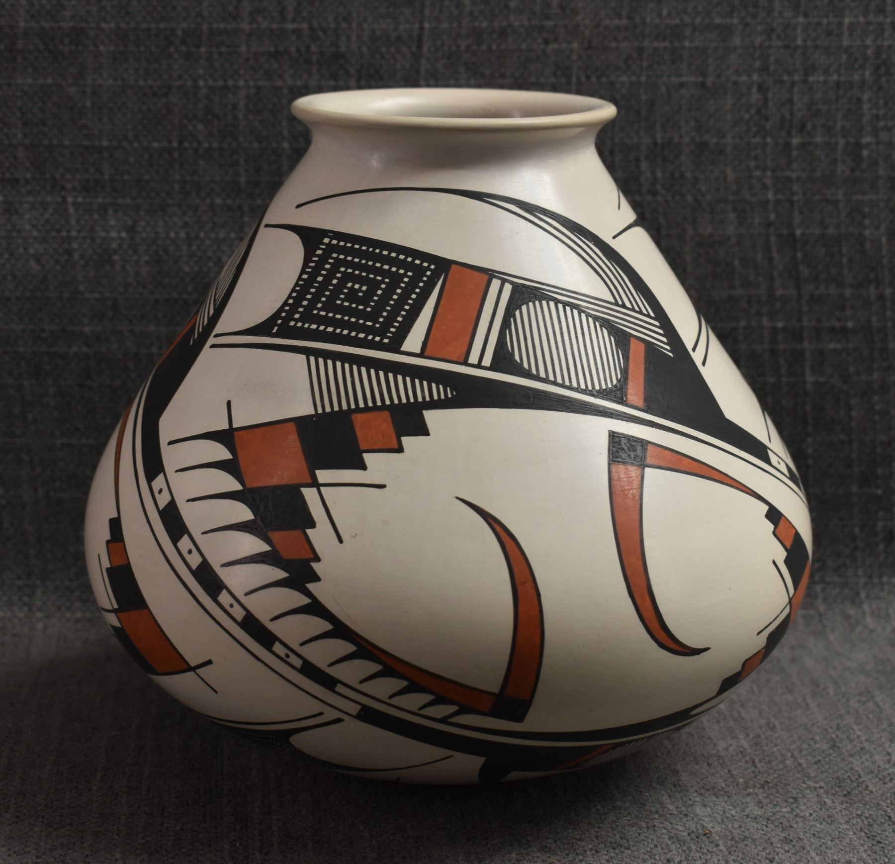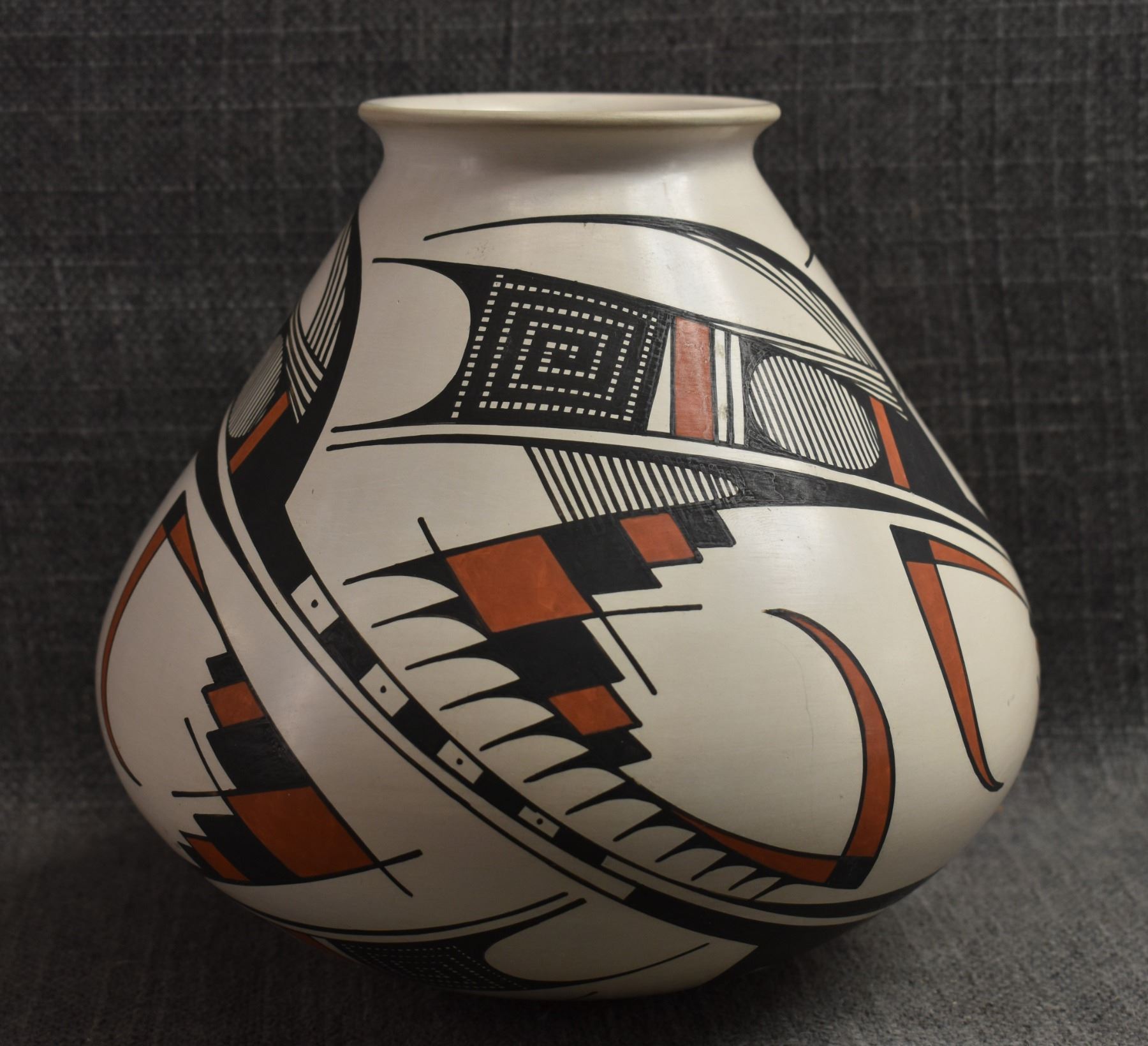 1990's Mata Ortiz. Hand coiled an painted polychrome design pottery olla. Signed Juan Quezada. 6.5'' x 7.5''