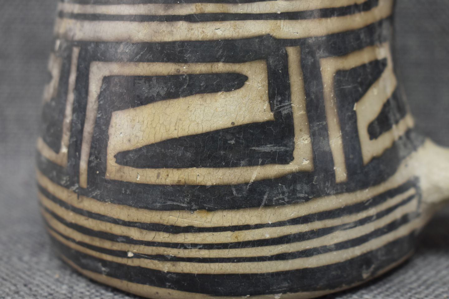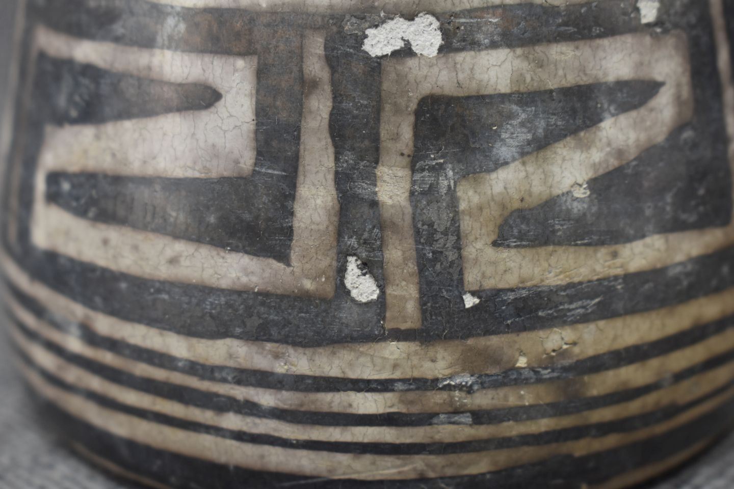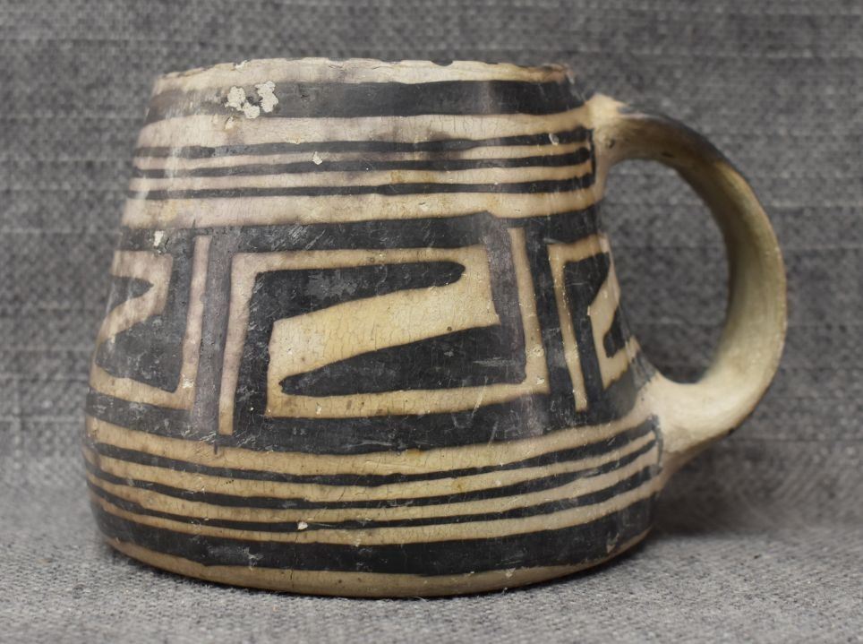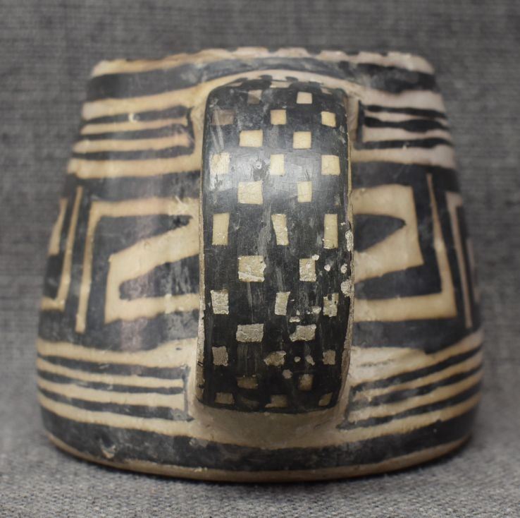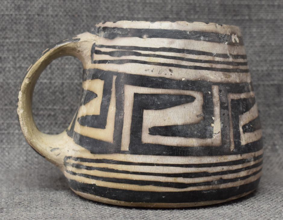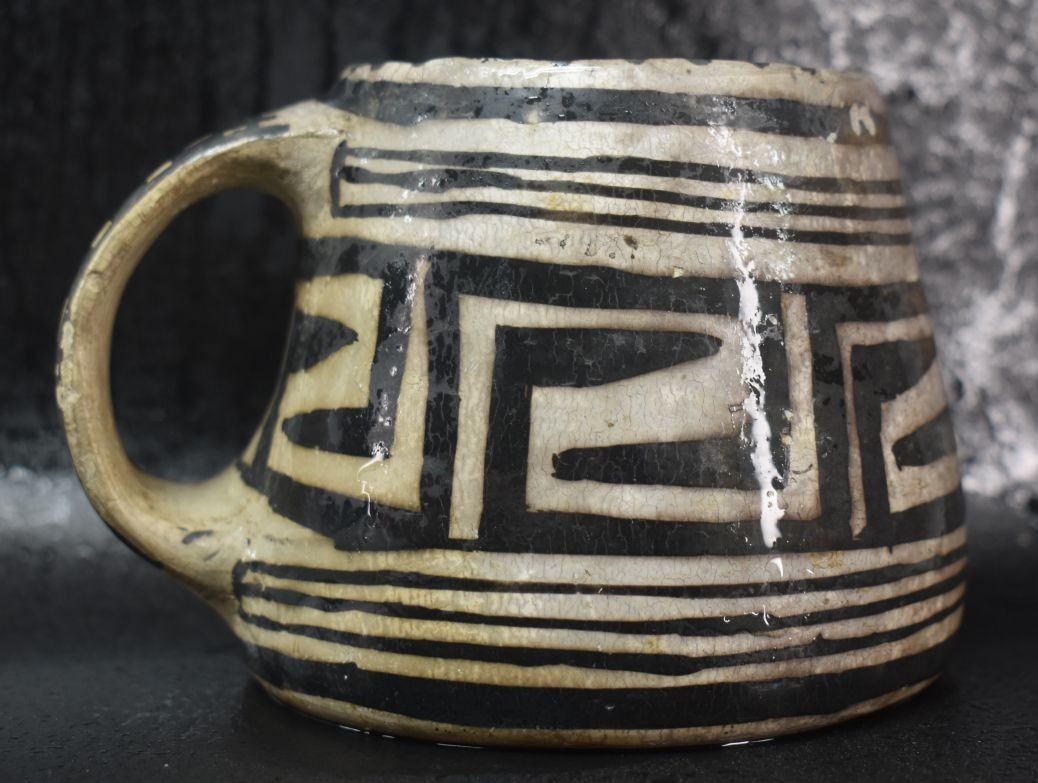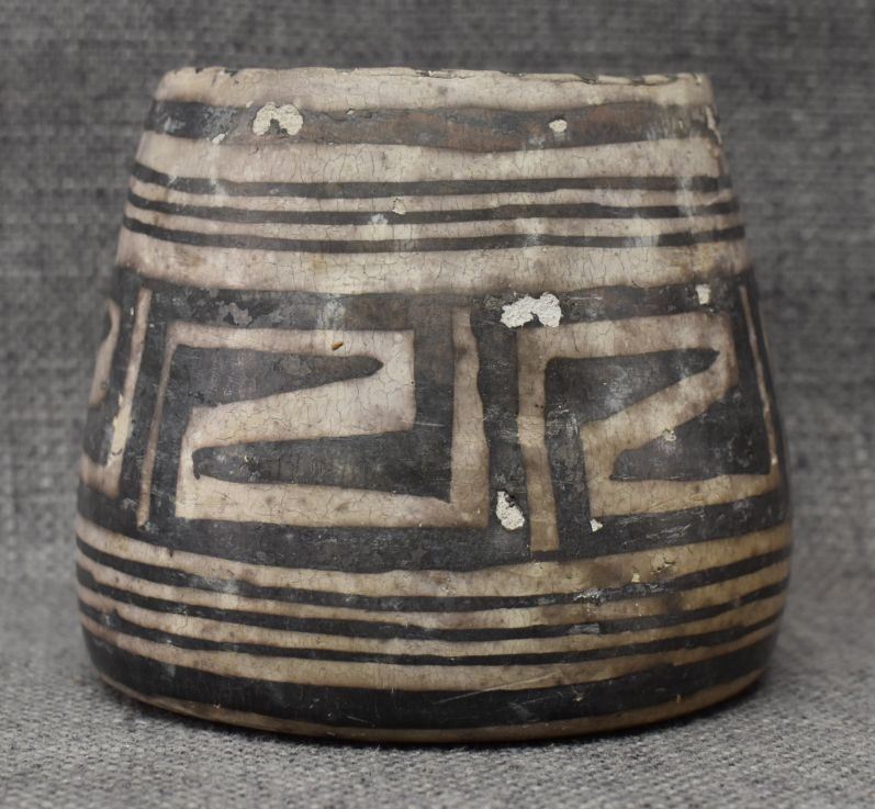 prehistoric Mesa Verde, hand made and painted with black on white geometric design 3.5" x 5.25" x 4" as found condition