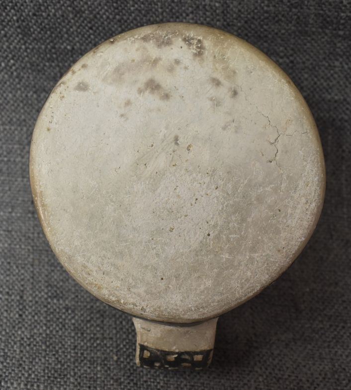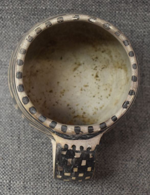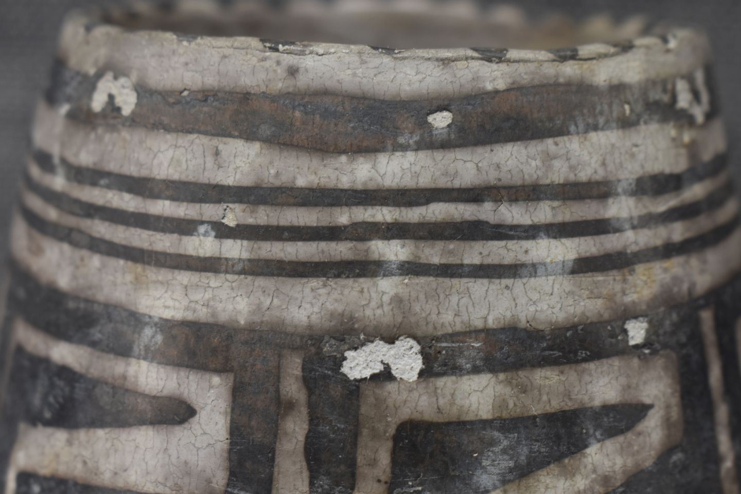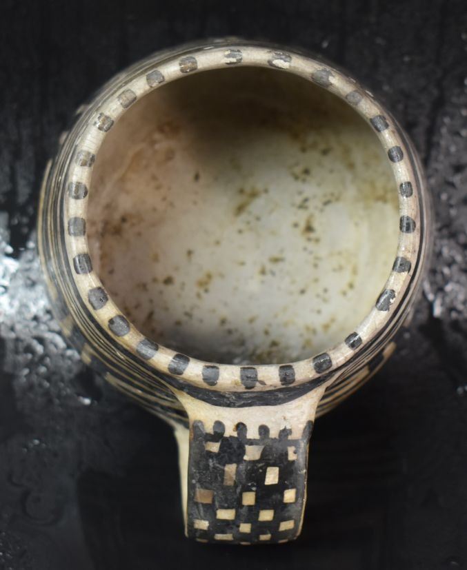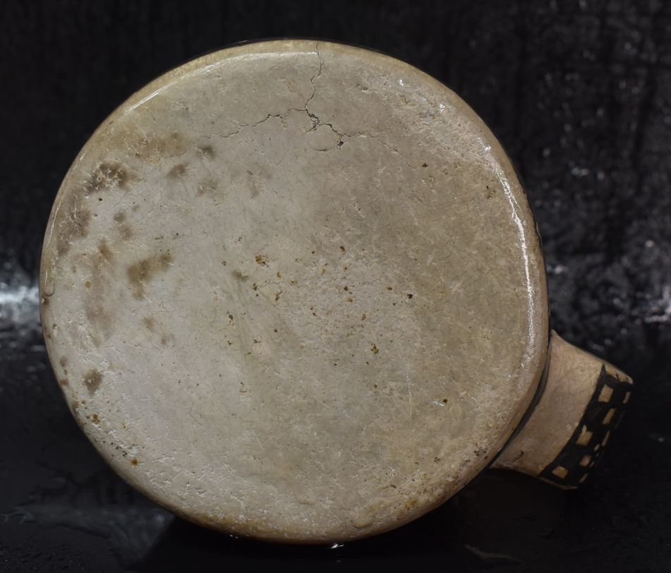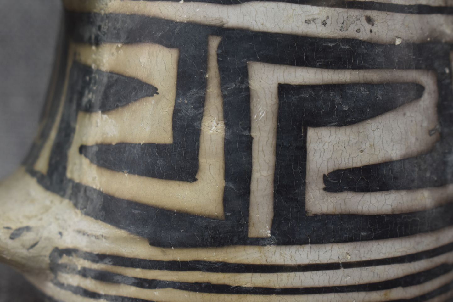 prehistoric Mesa Verde, hand made and painted with black on white geometric design 3.5" x 5.25" x 4" as found condition