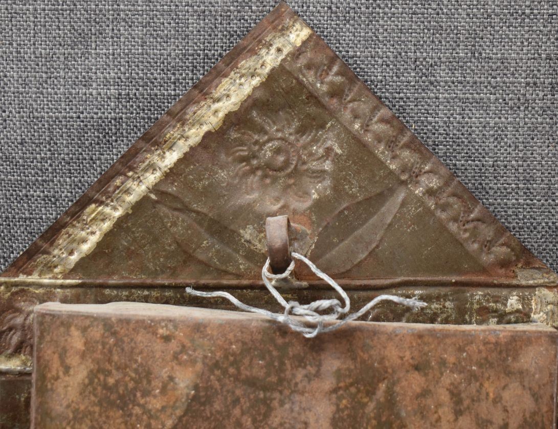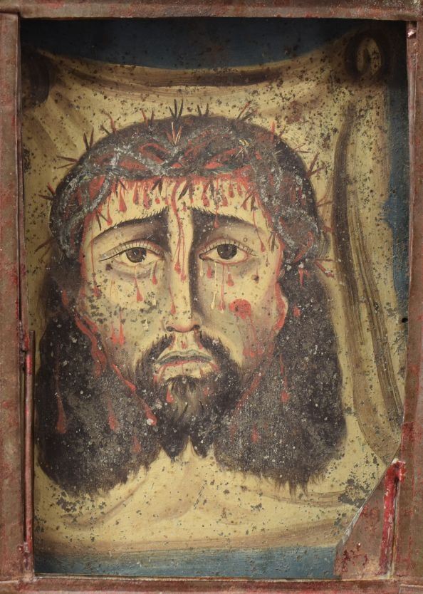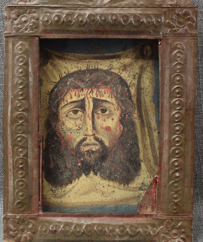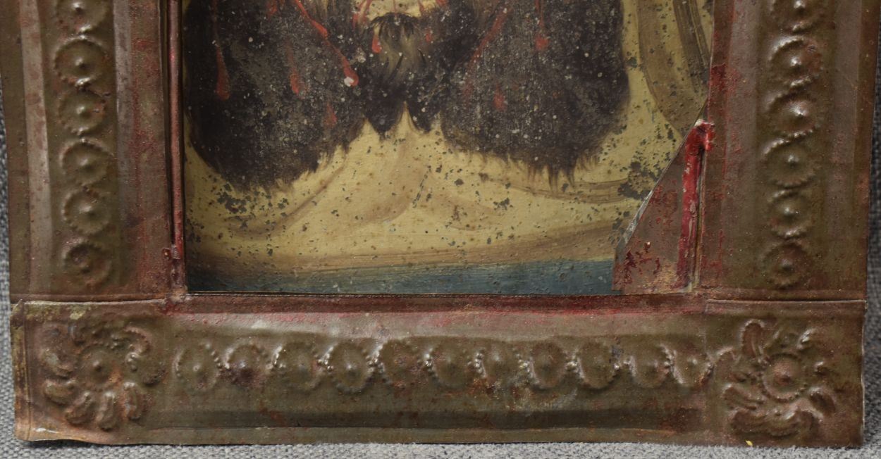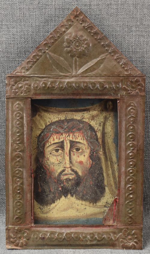 vintage Mexican hand painted retablo depicting Jesus 10" x 7"with tin frame with punched design 16" x 9.25" x 1.25"