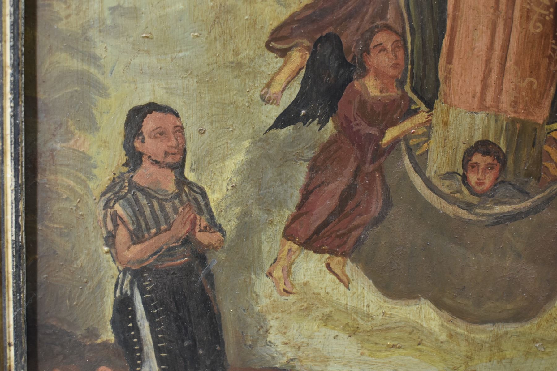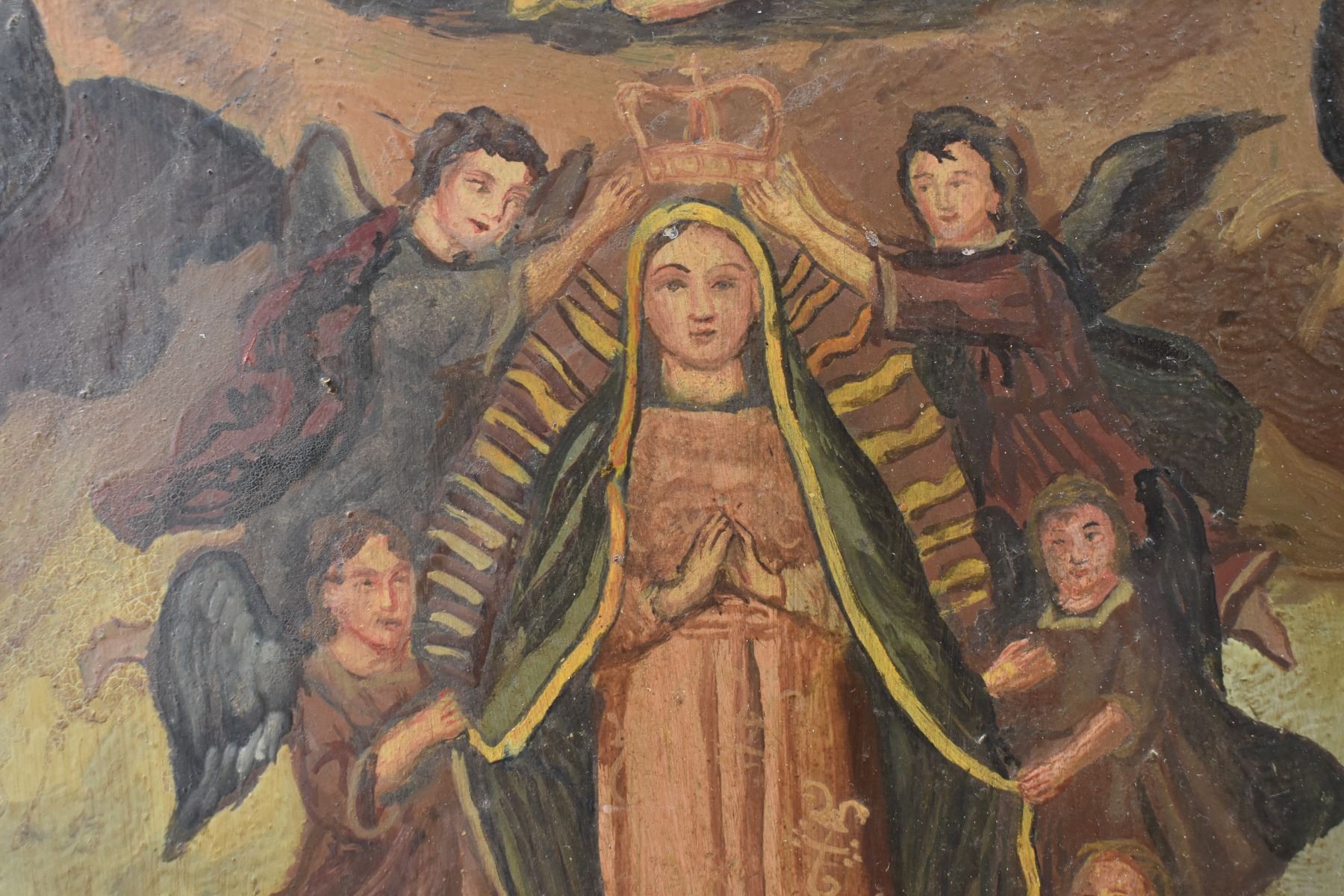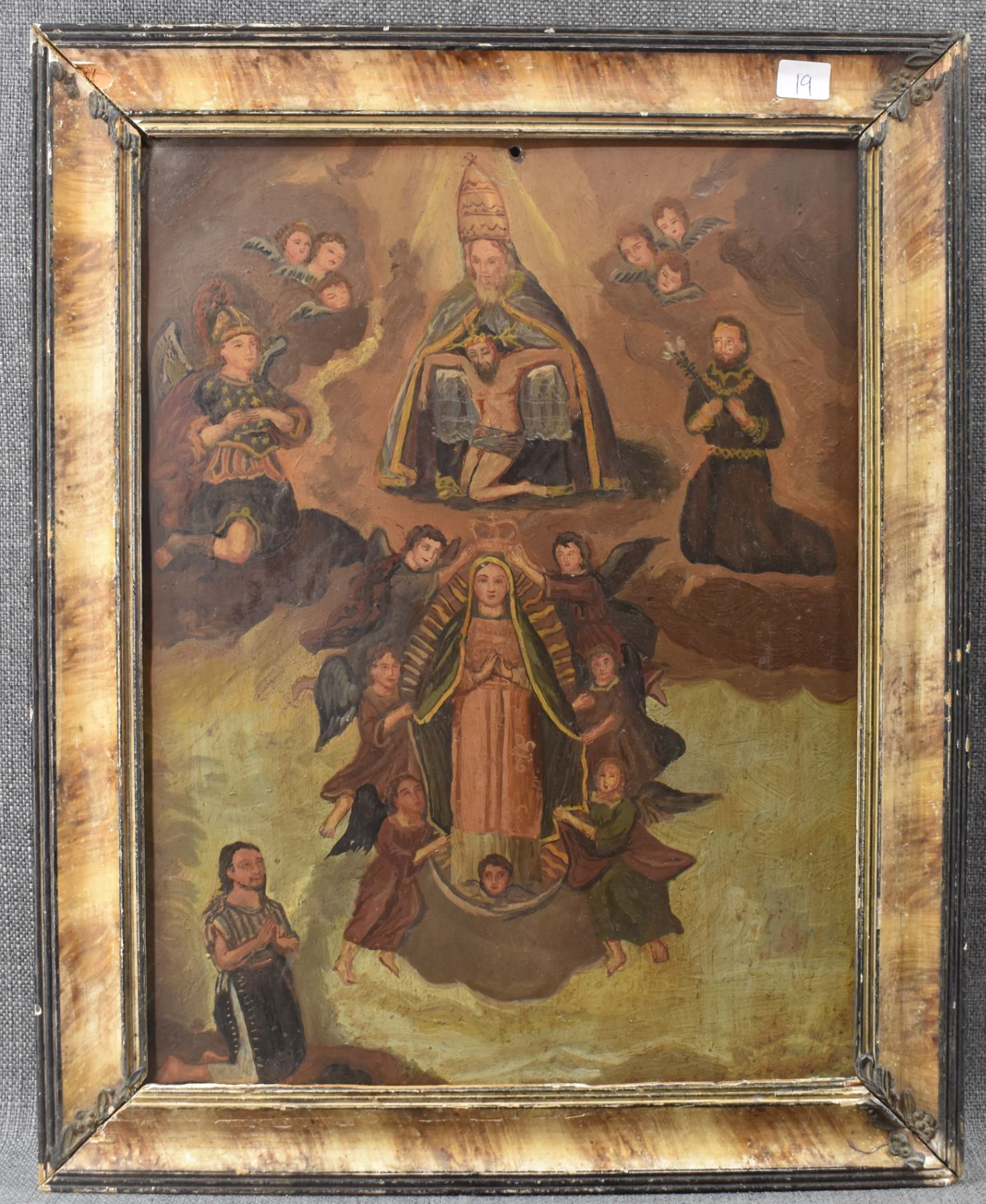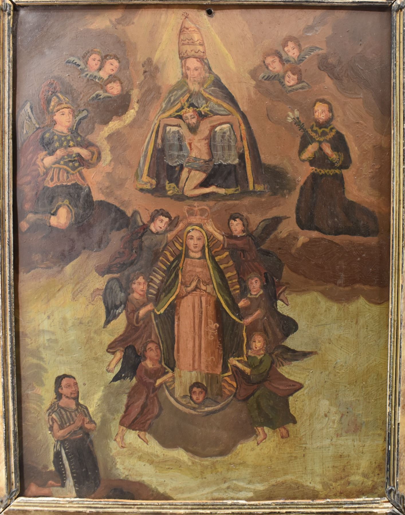 20th century Mexican. Hand painted design on tin. 16'' x 12'' frame size 19'' x 15''