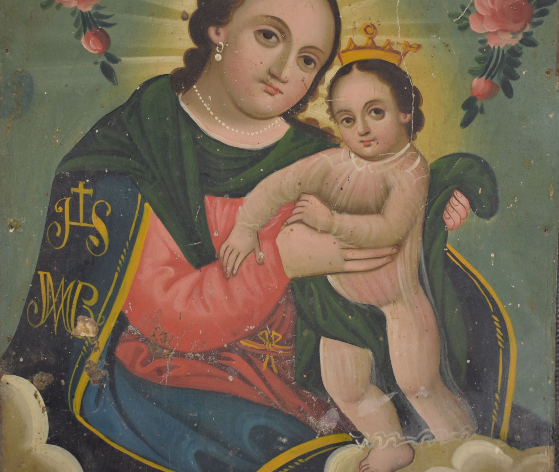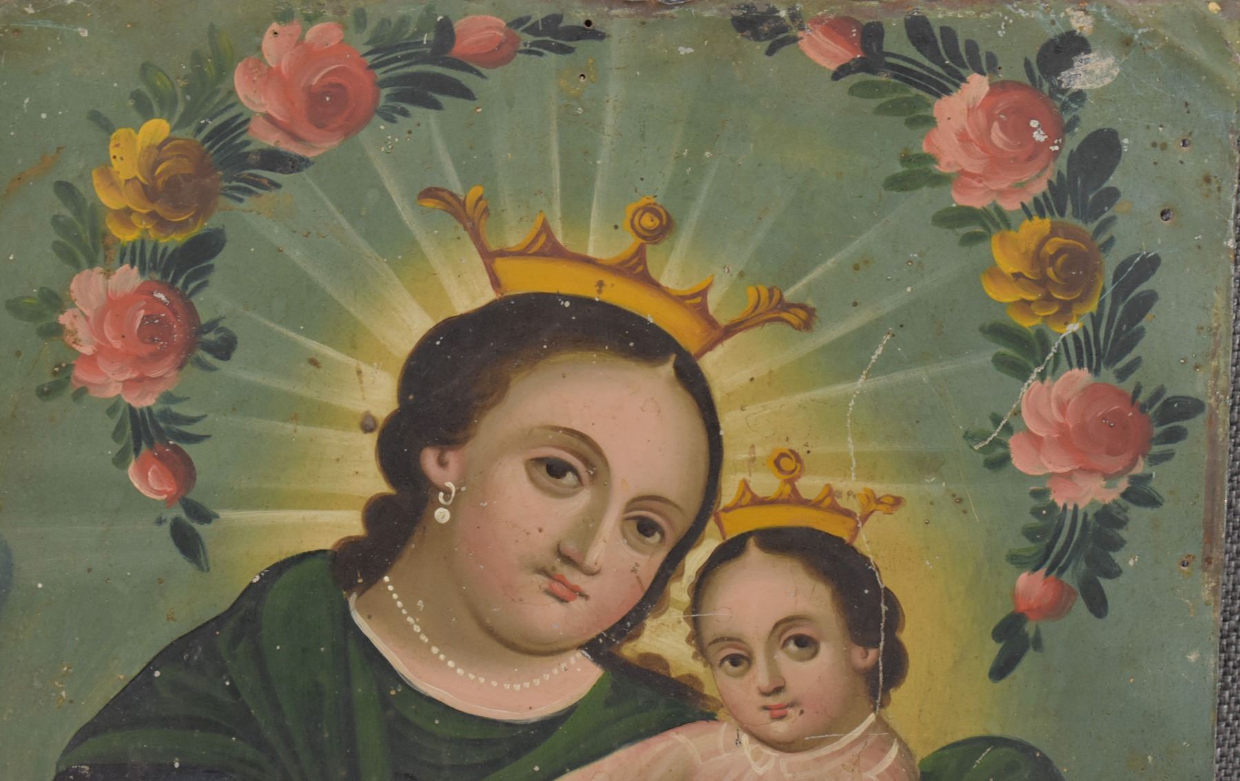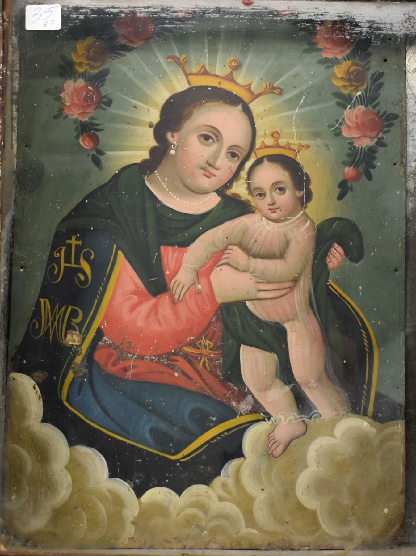 20th century, hand painted on tin 14" x 10" in tin frame 2" x 18.25" x 14"