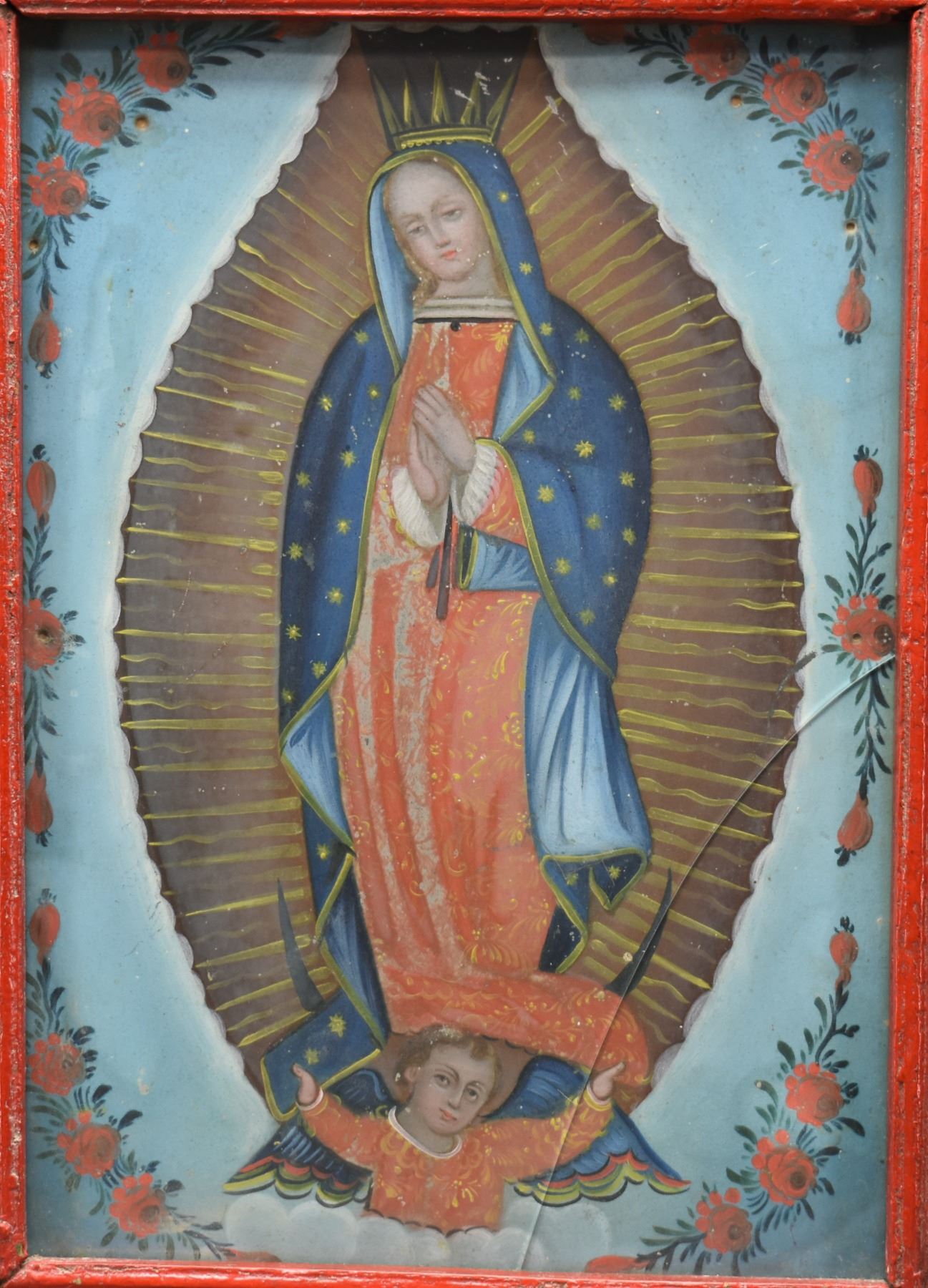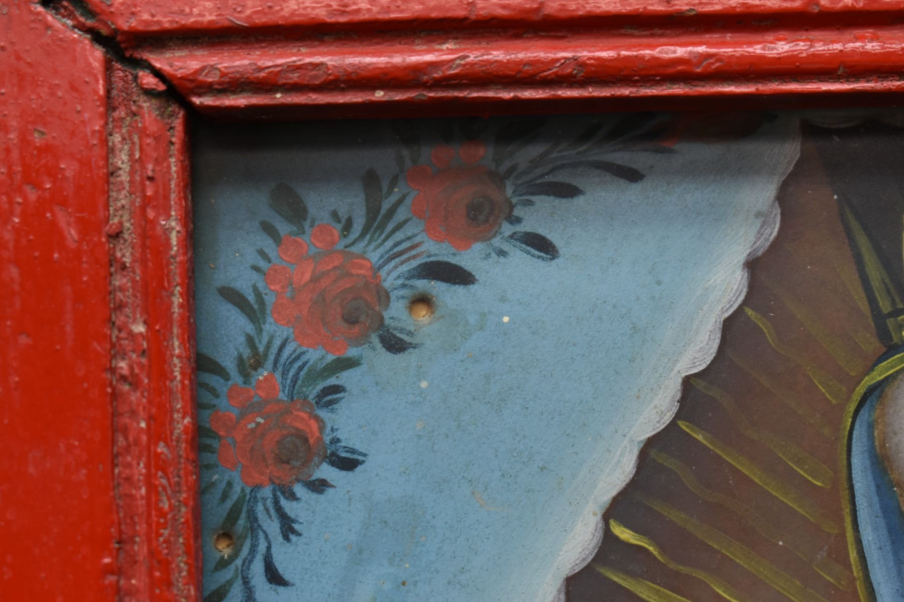 20th century Mexican retablo on tin depicts Madonna and Child. 13.5'' x 9.5'' frame size 16'' x 12''
