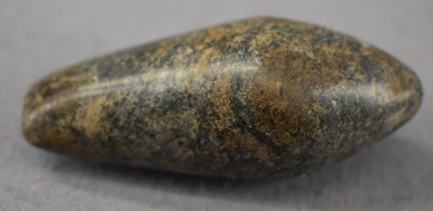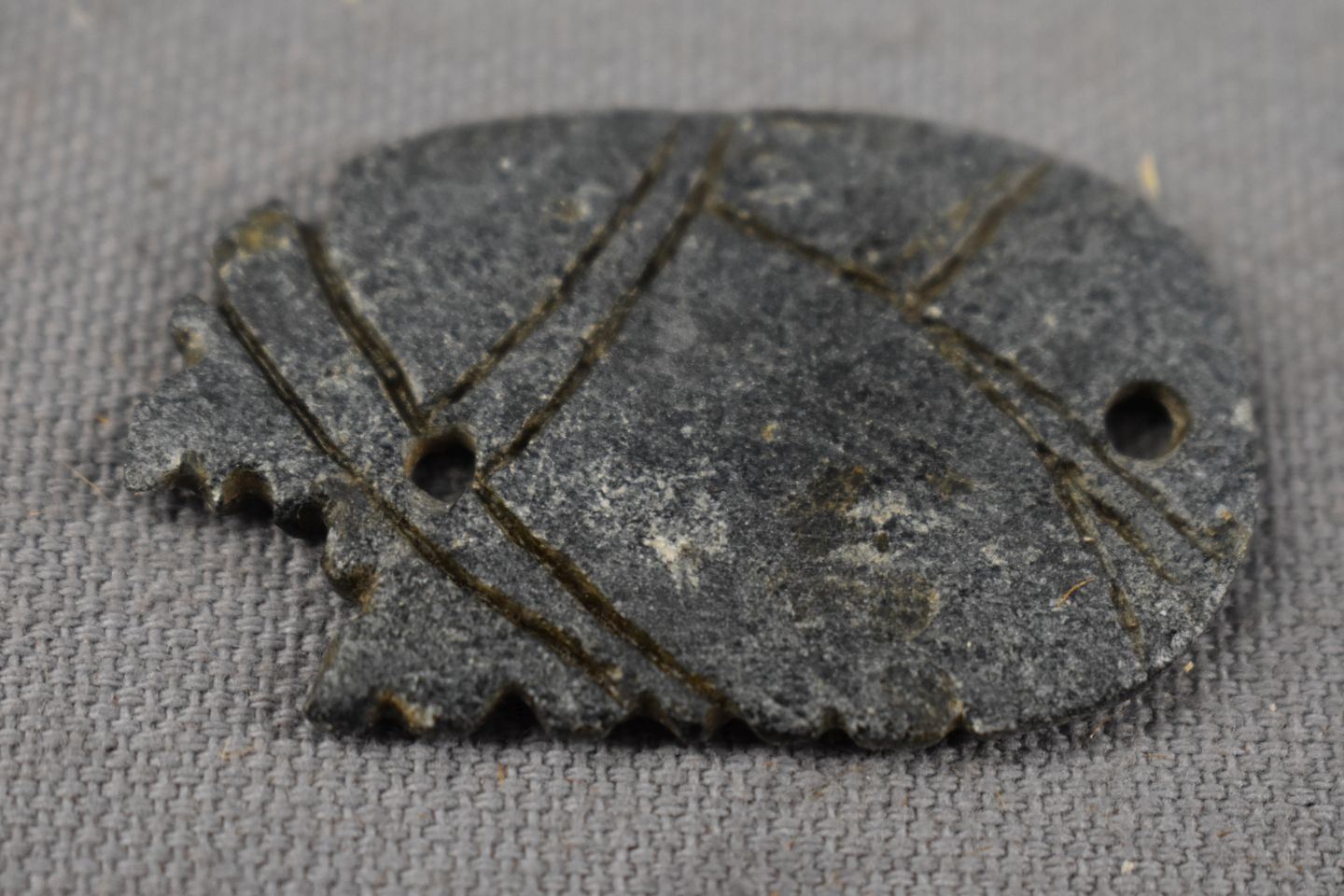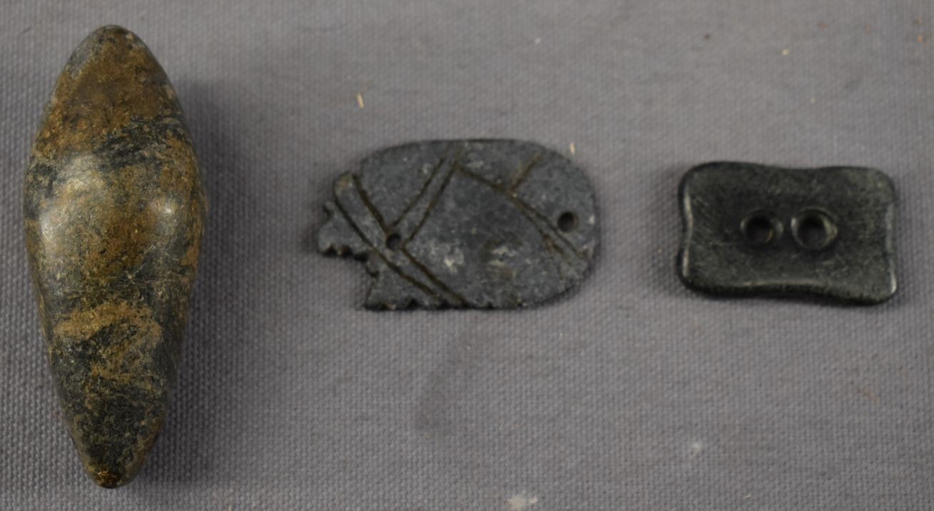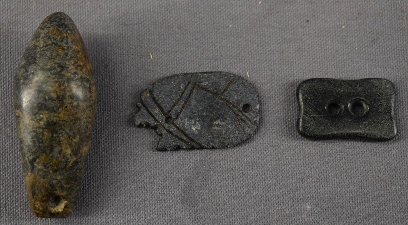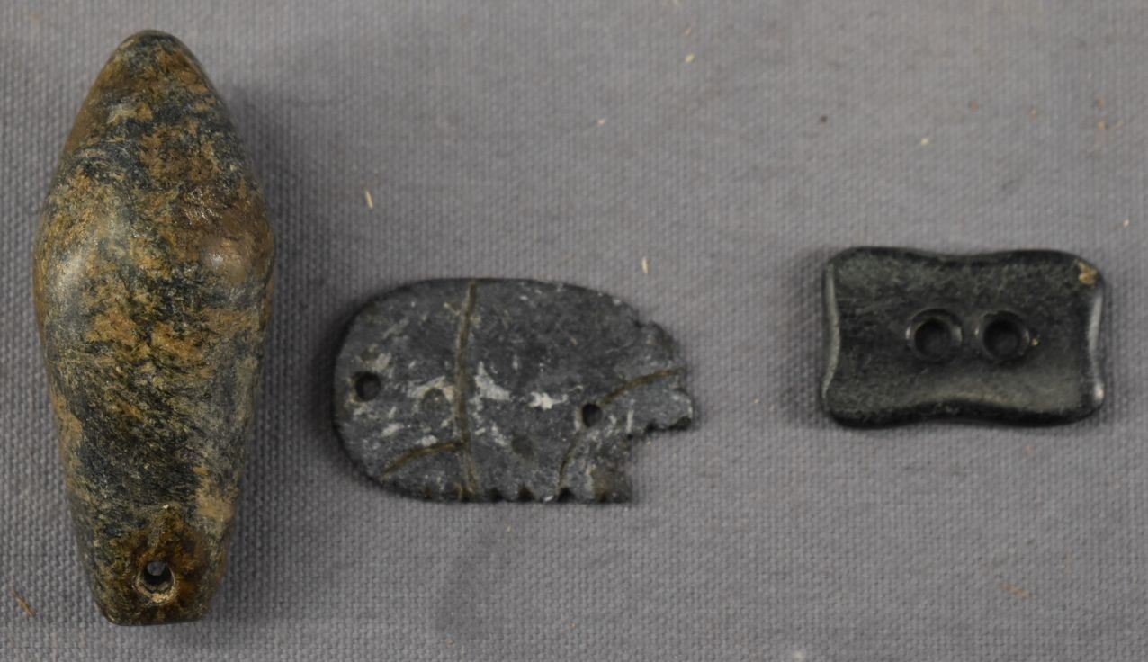 age unknown. Midwest stone plumb bob 3'' long and stone pendants? 2'' x 1.25'' and 1'' x 1.25''