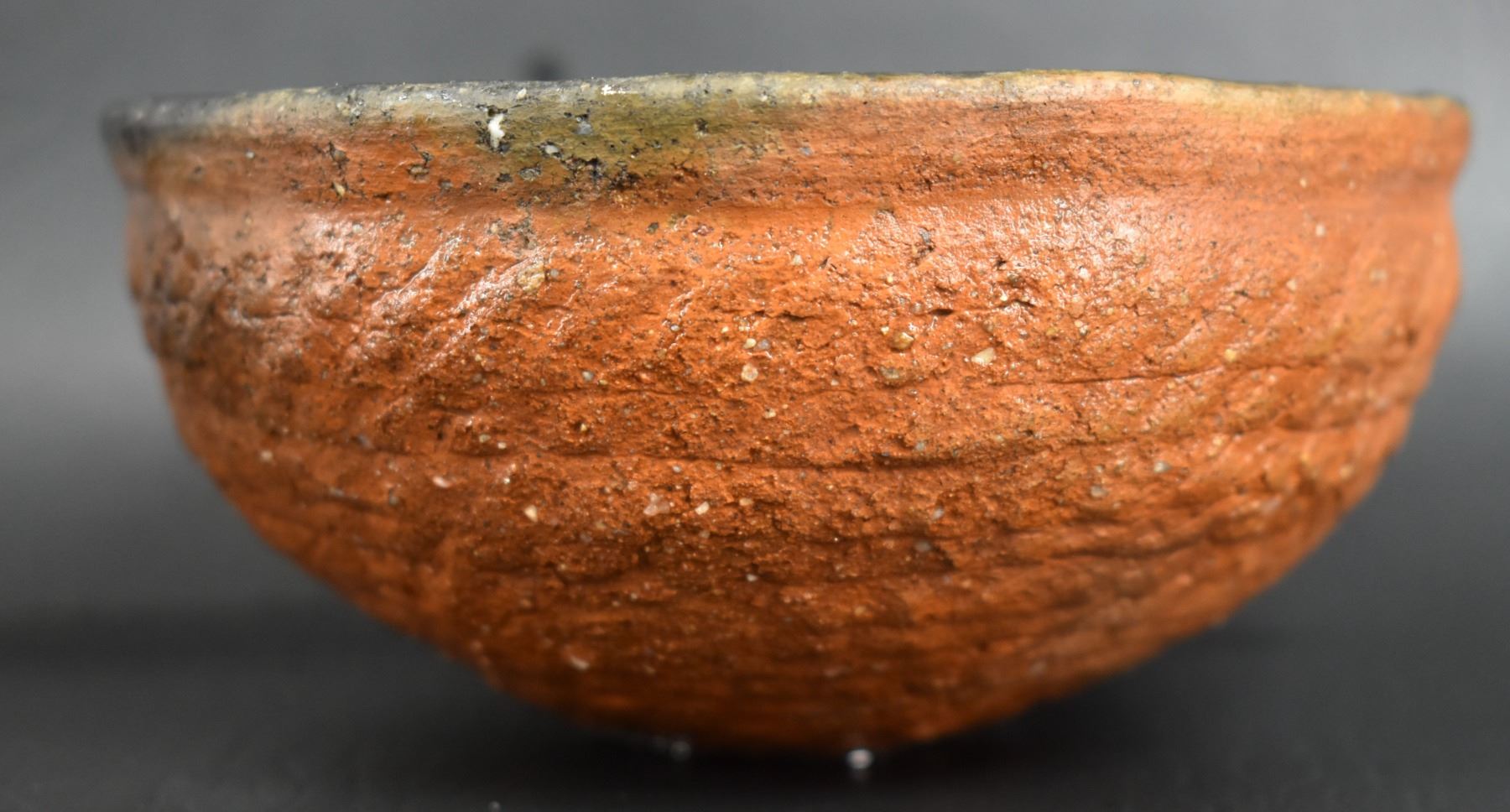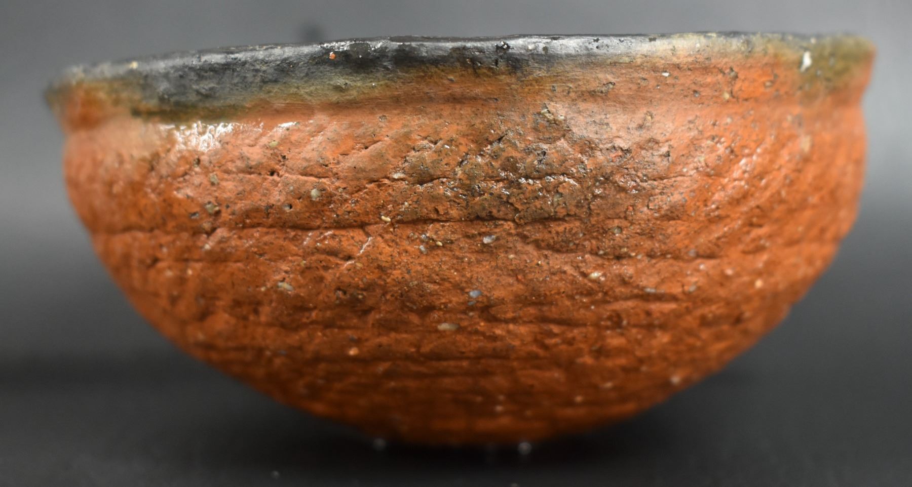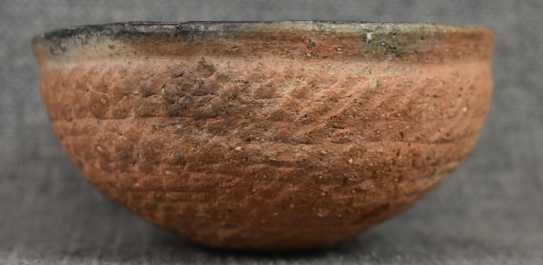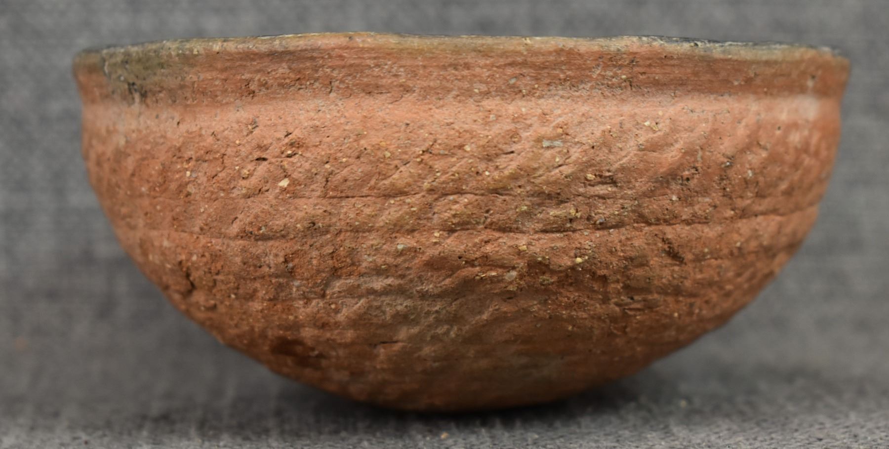 Prehistoric Mimbres. Hand coiled corrugated pottery bowl. 2'' x 4.75''. Has been broken and glued