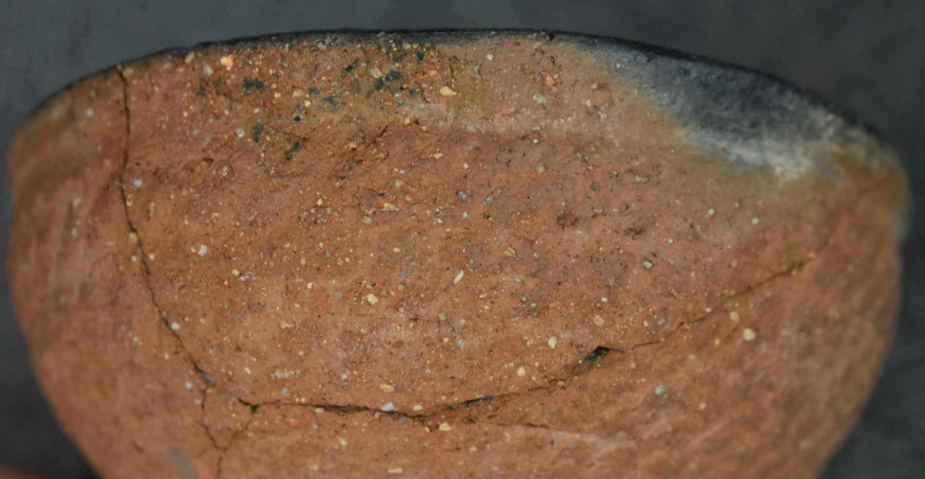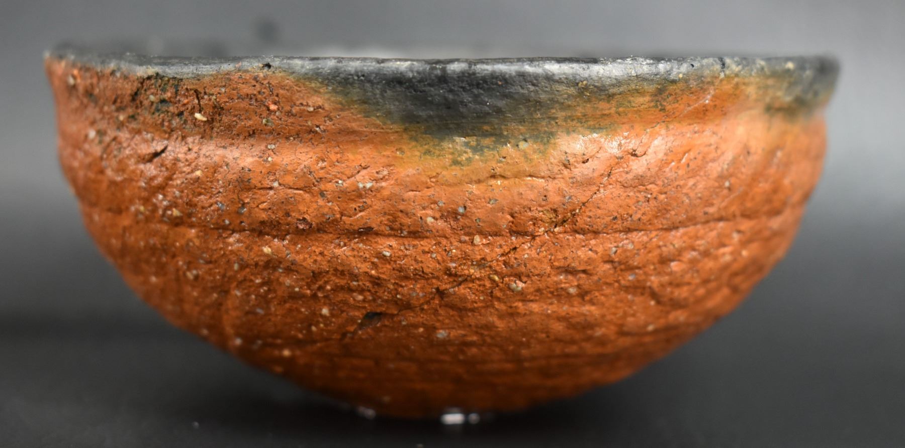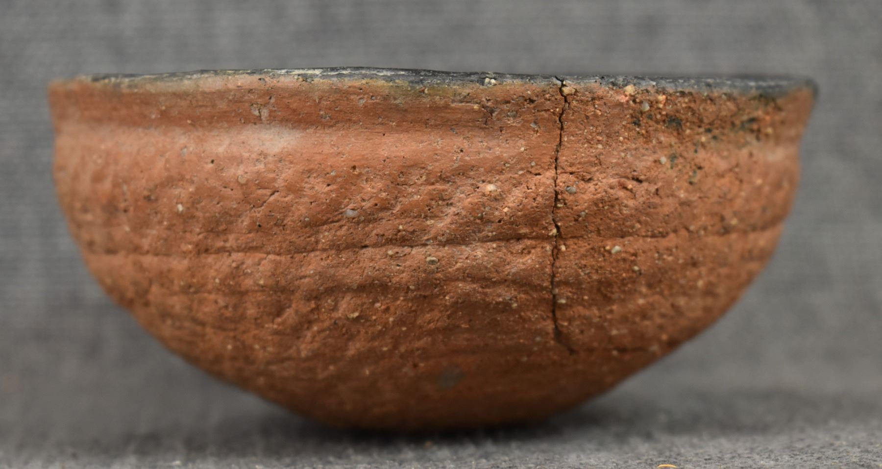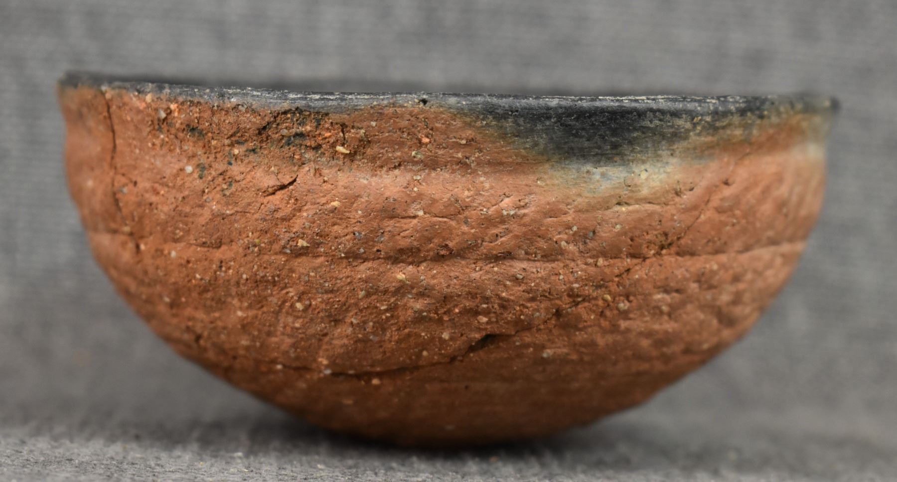 Prehistoric Mimbres. Hand coiled corrugated pottery bowl. 2'' x 4.75''. Has been broken and glued