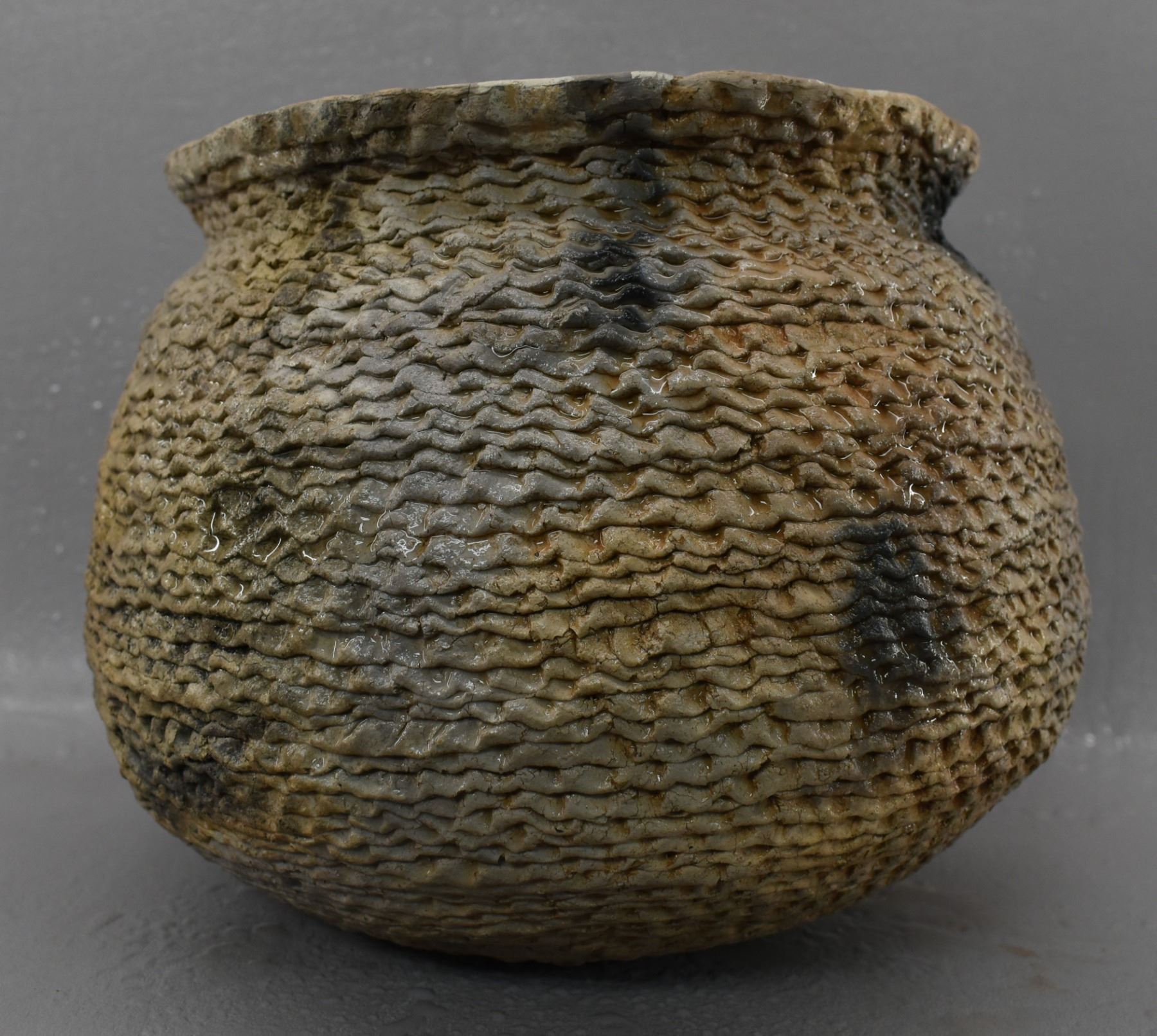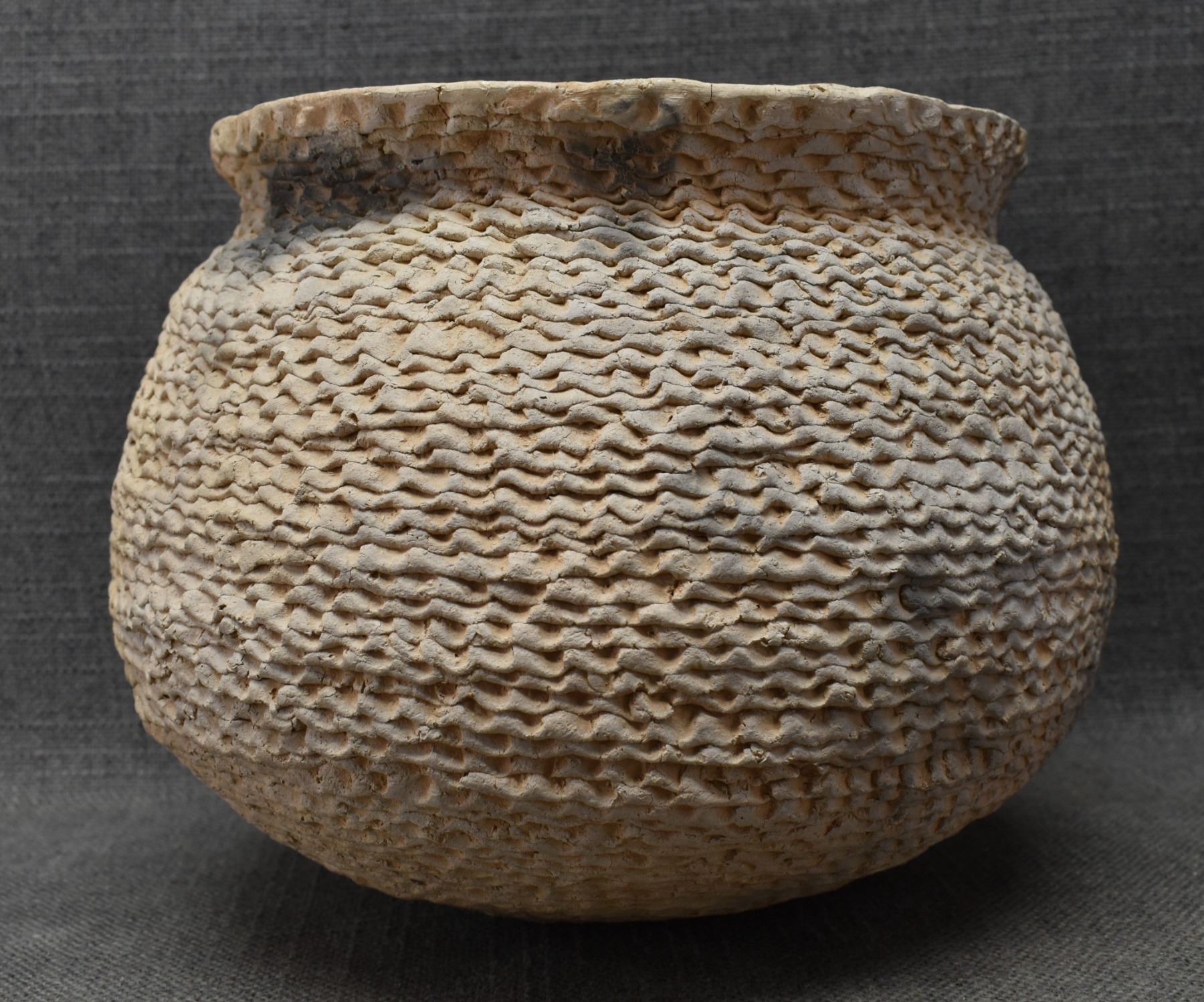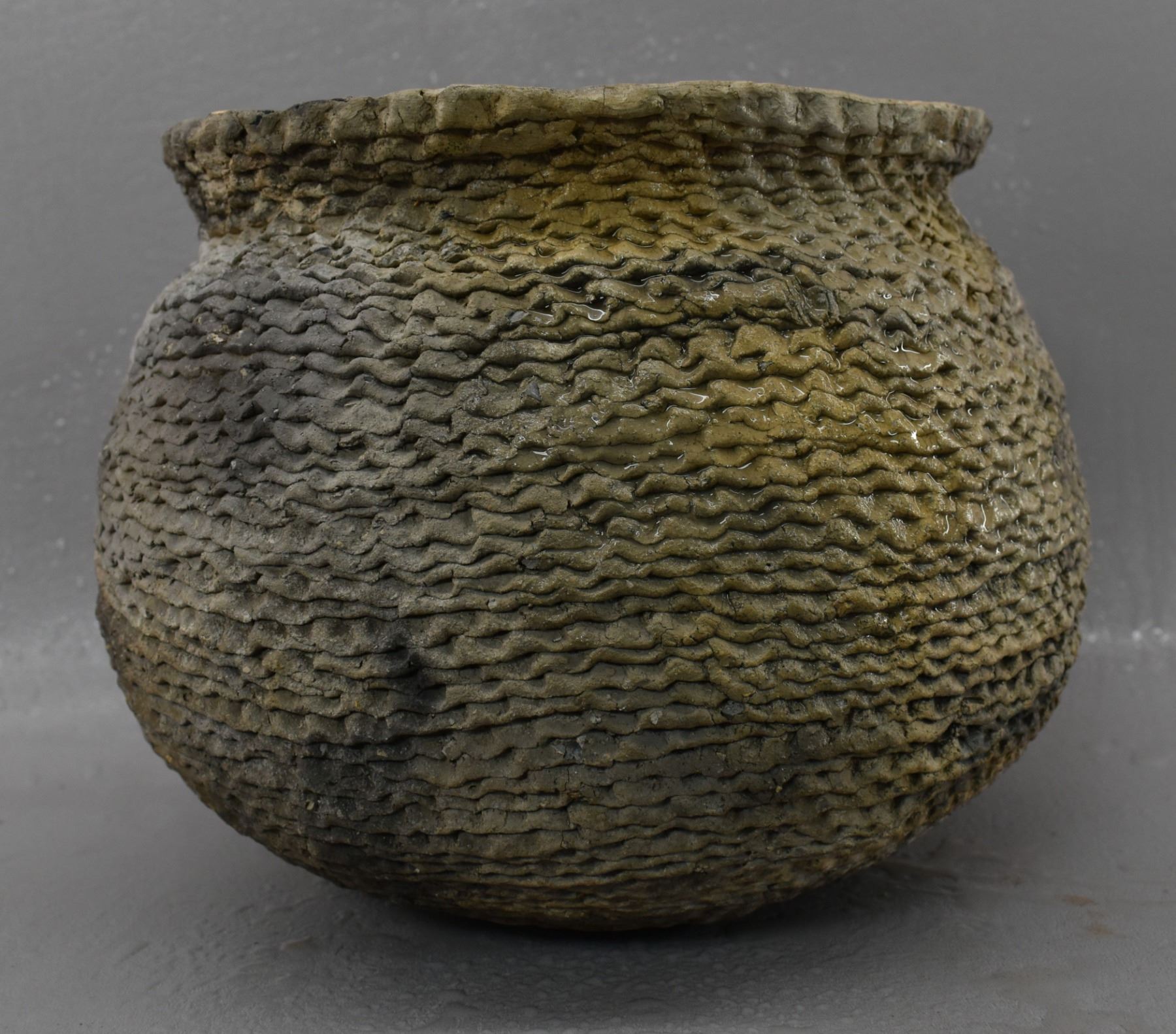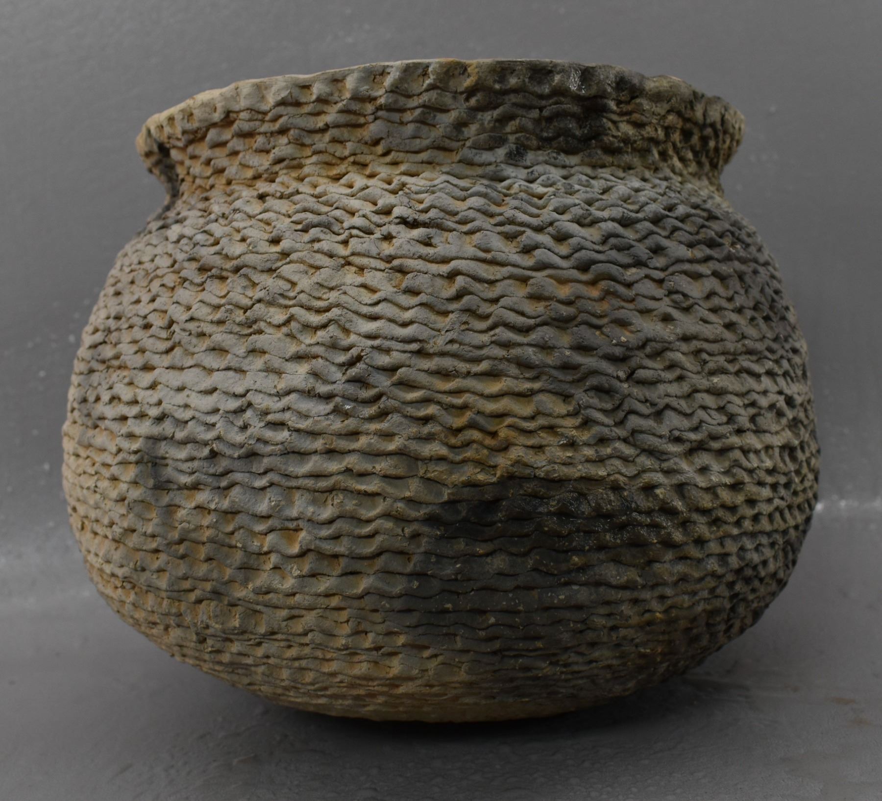 Pre historic Mimbres, hand coiled corrugated pottery cooking jar. 7'' x 10'' has restoration