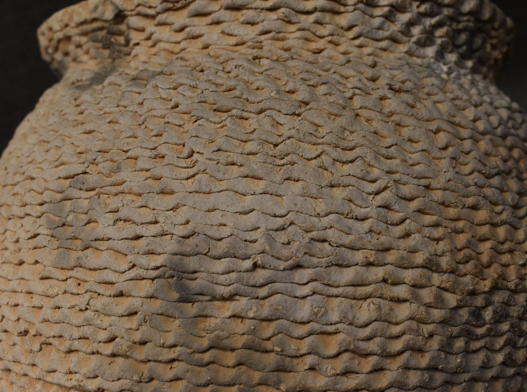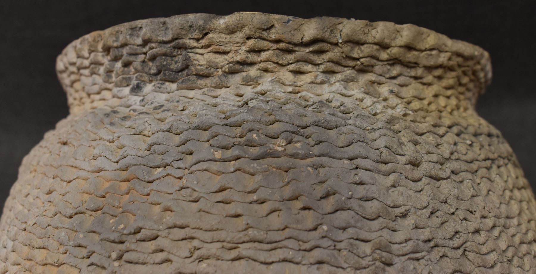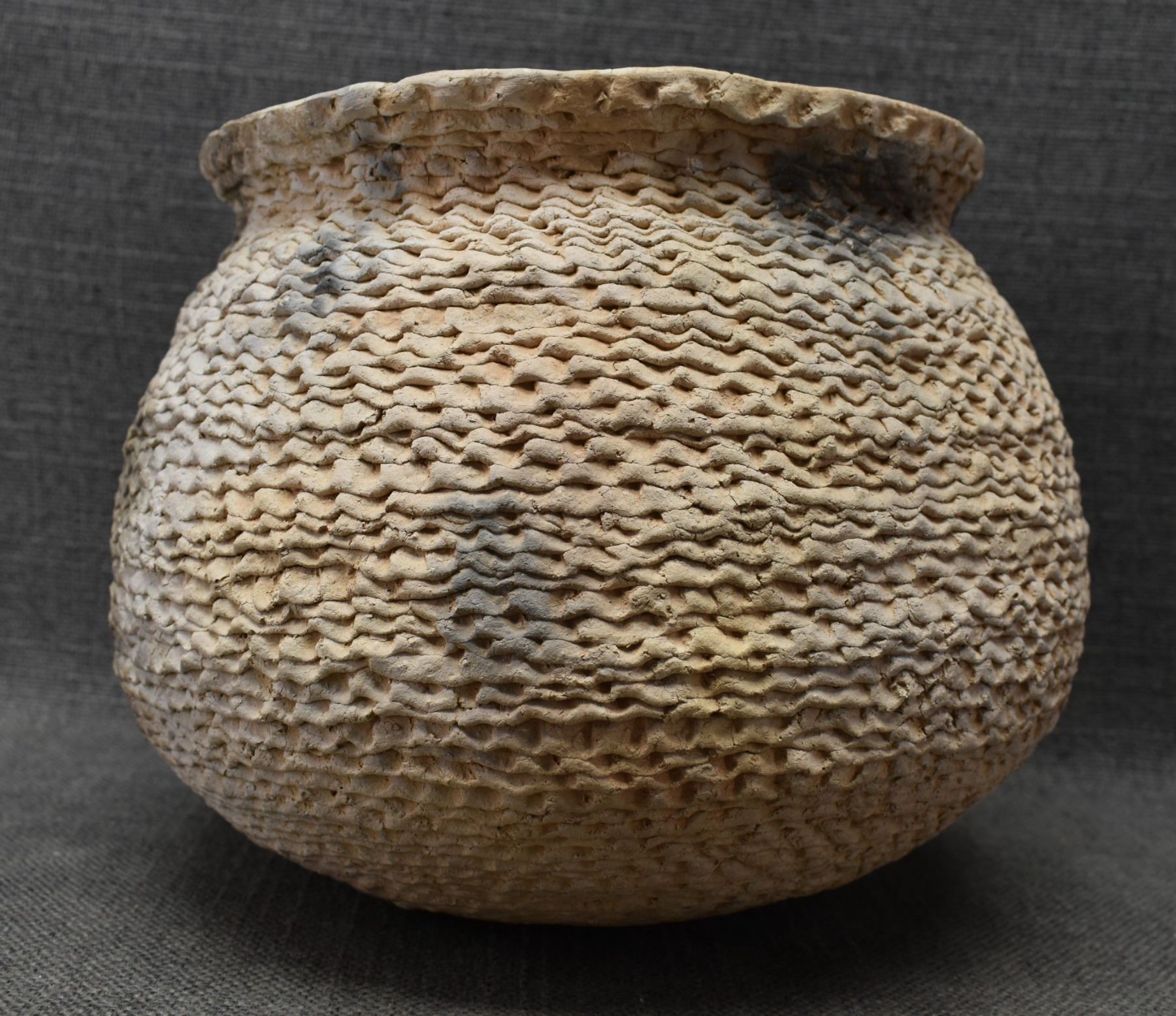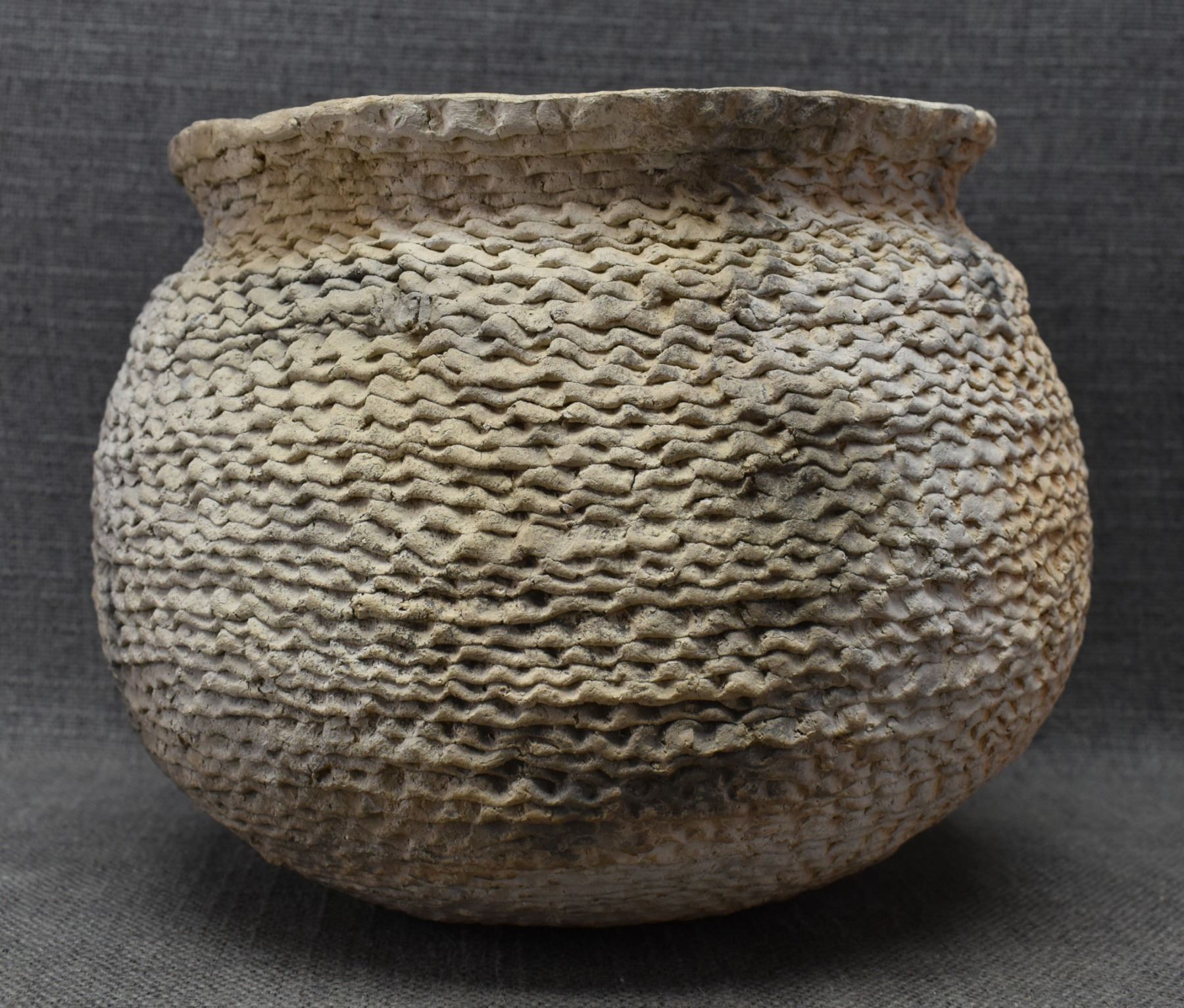 Pre historic Mimbres, hand coiled corrugated pottery cooking jar. 7'' x 10'' has restoration