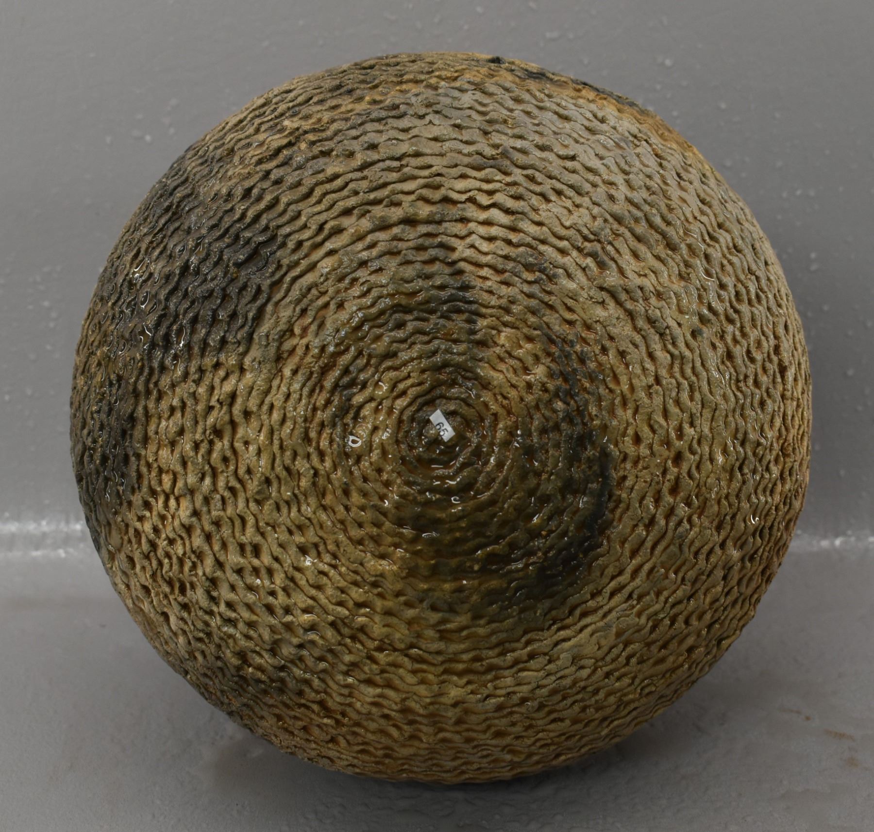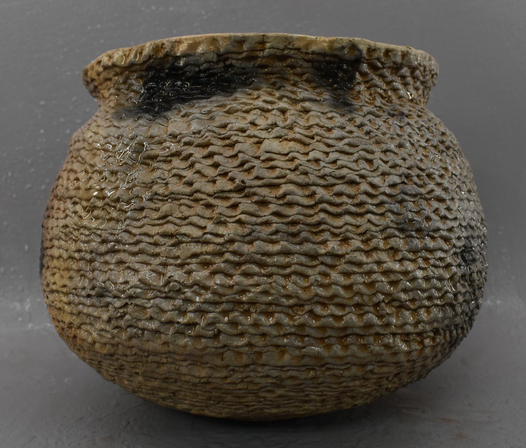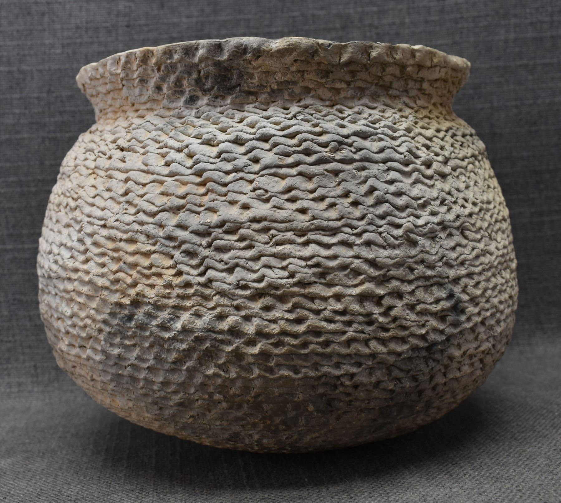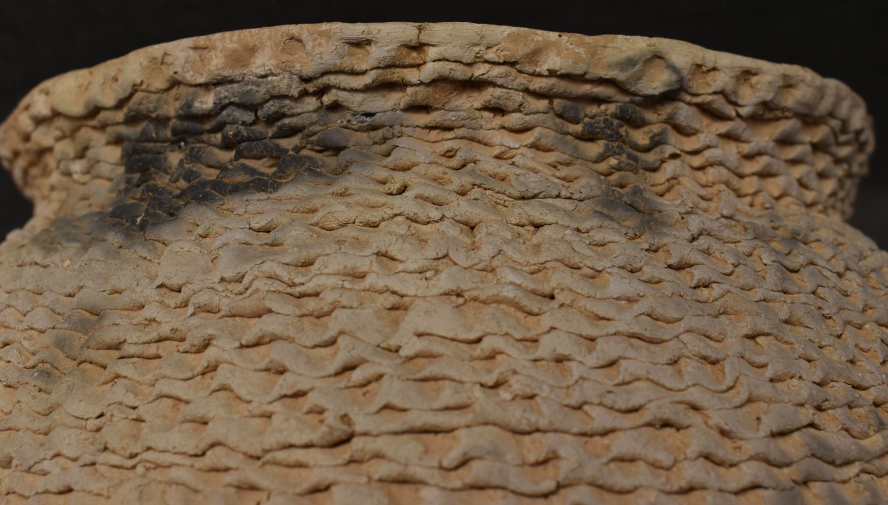 Pre historic Mimbres, hand coiled corrugated pottery cooking jar. 7'' x 10'' has restoration