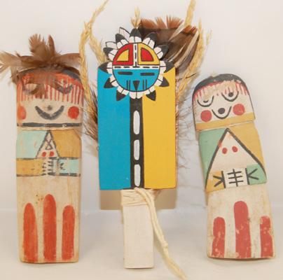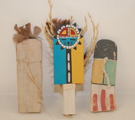 ca. 1950-60'S 2 belt dolls, set of child's dance paddles, largest 6" tall.