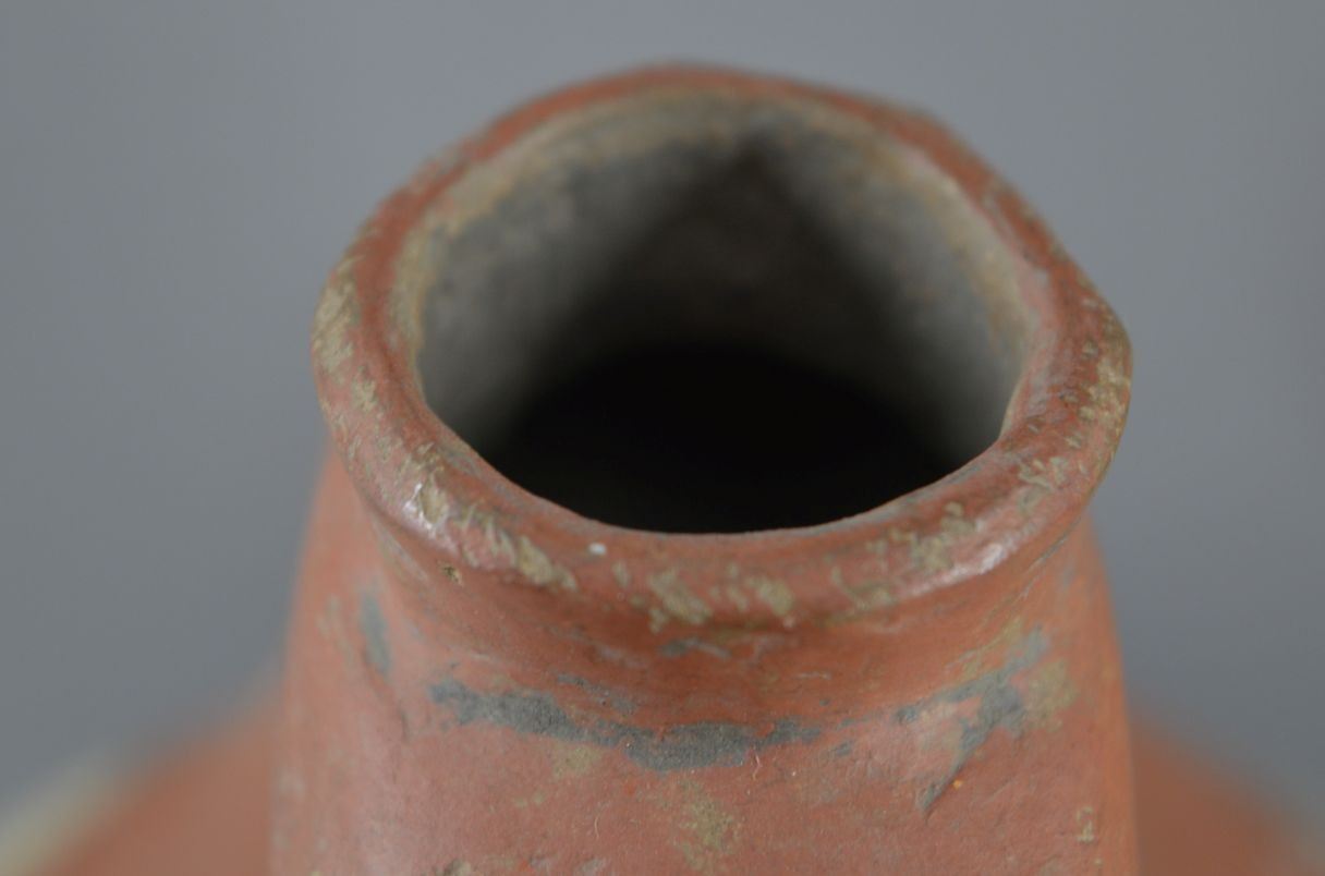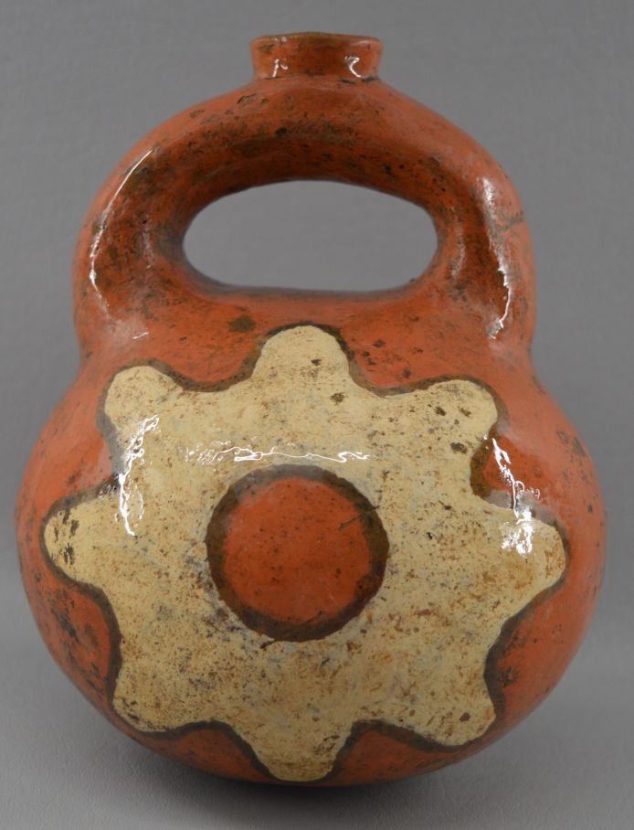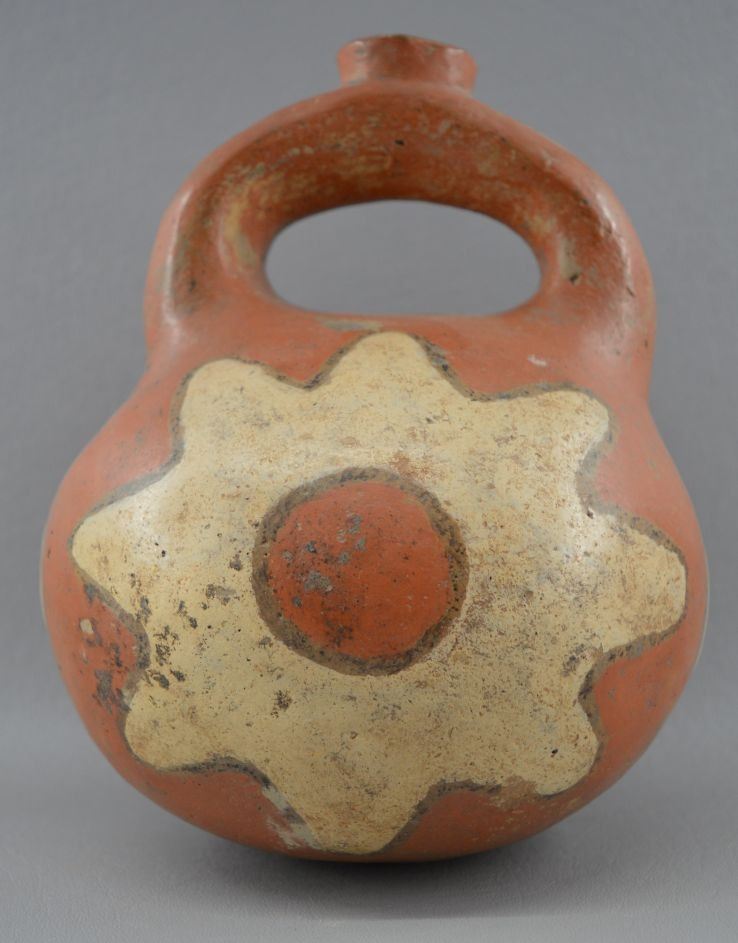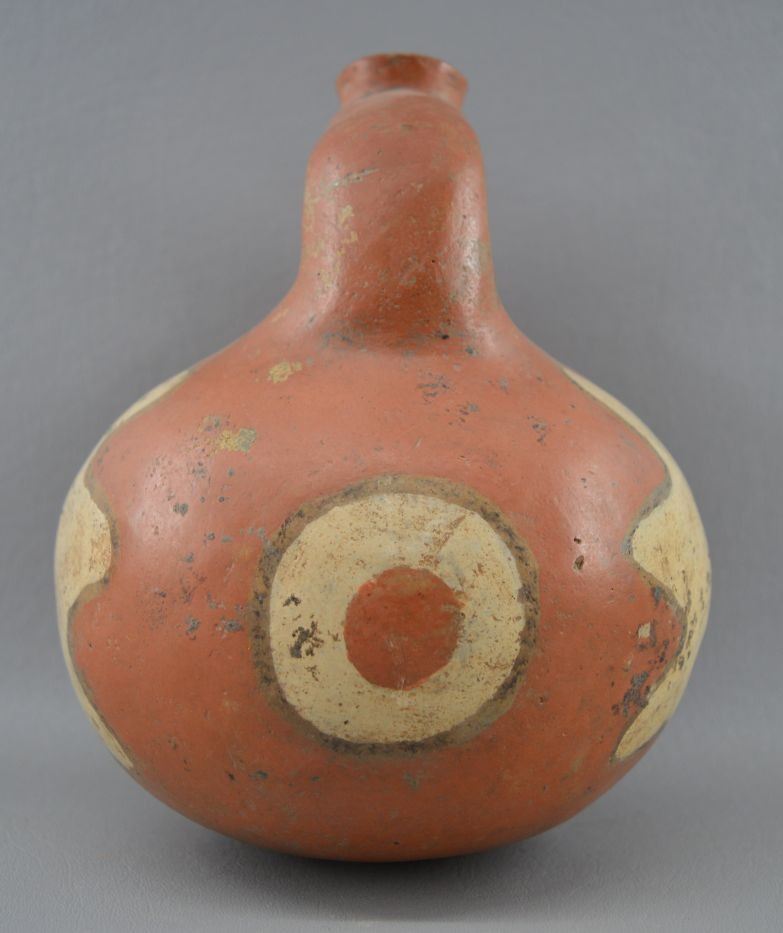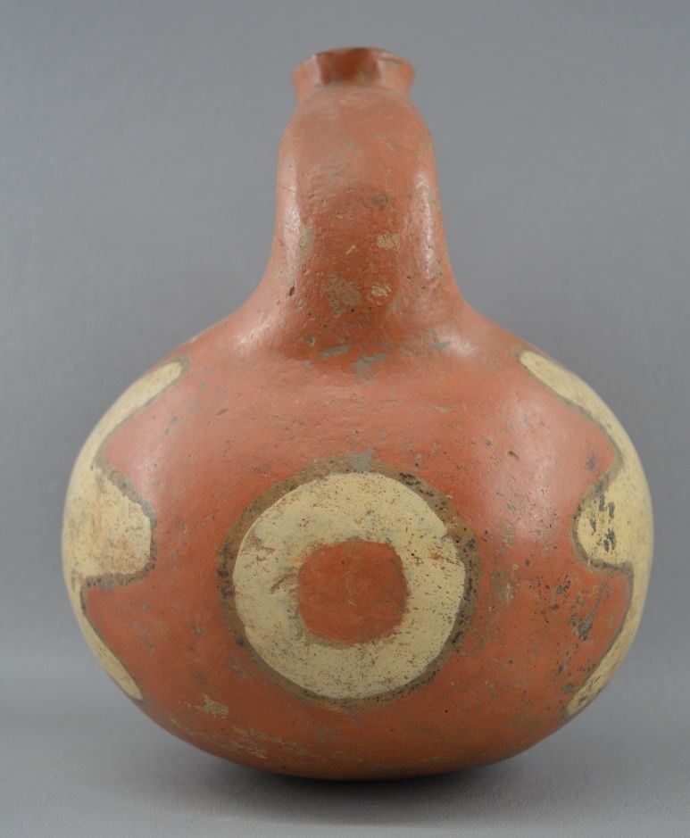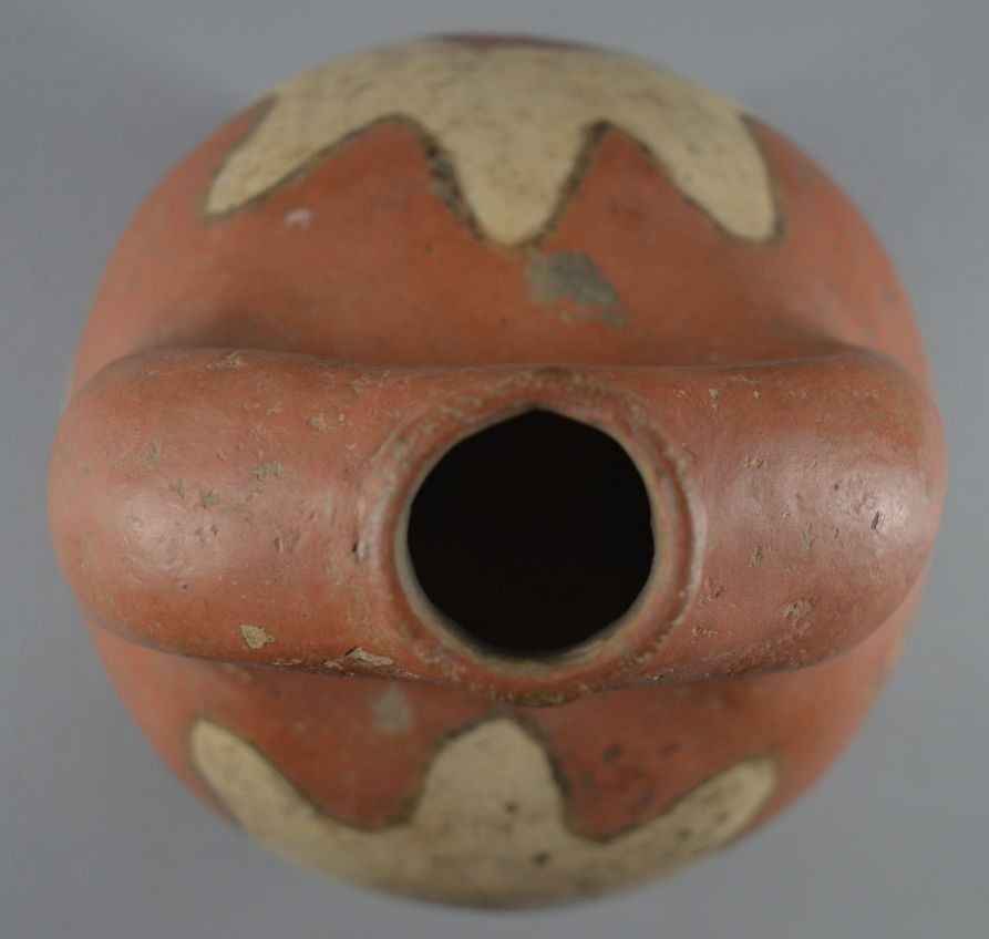 prehistoric Mississippian culture, hands coiled an painted design pottery stirrup vase. 8'' x 6''