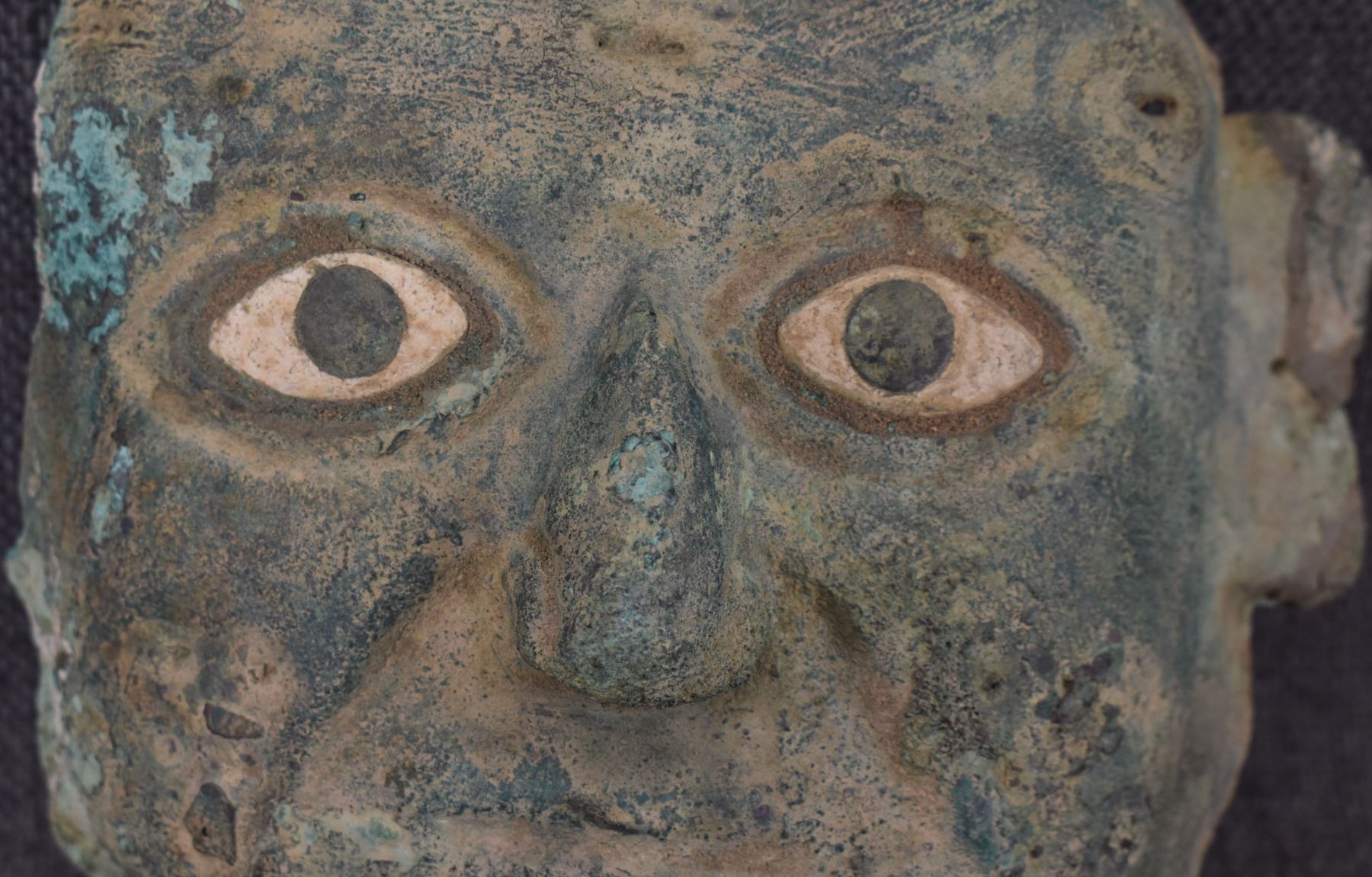 prehistoric Moche Pre-Columbian. Copper mask. 7'' x 7'' x 3''. Ear is detached