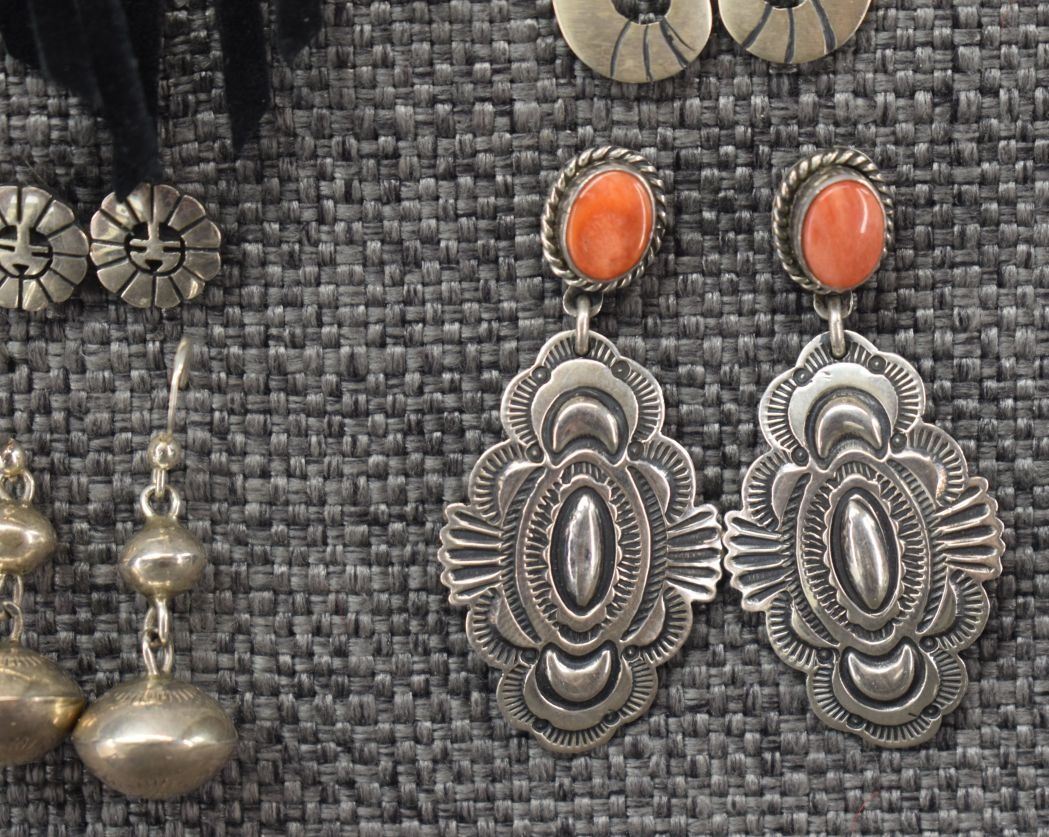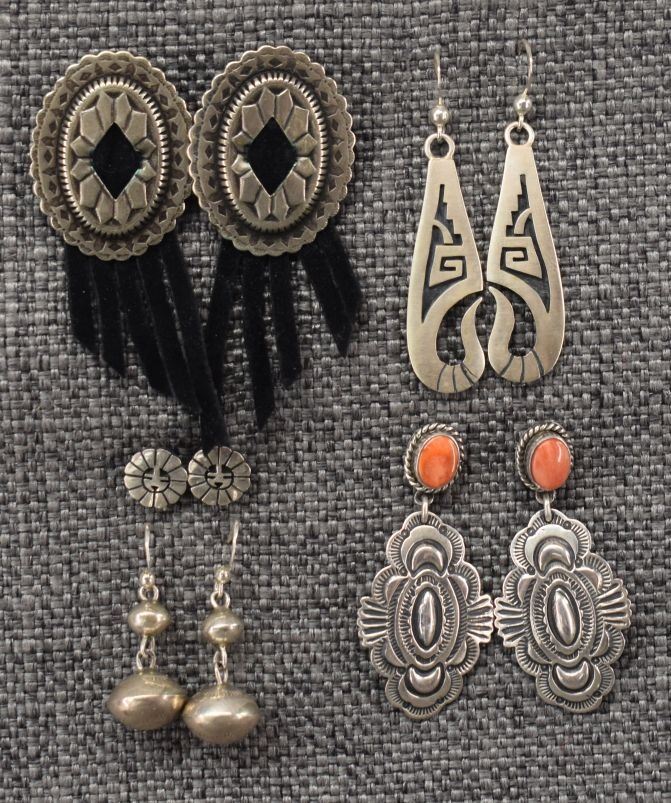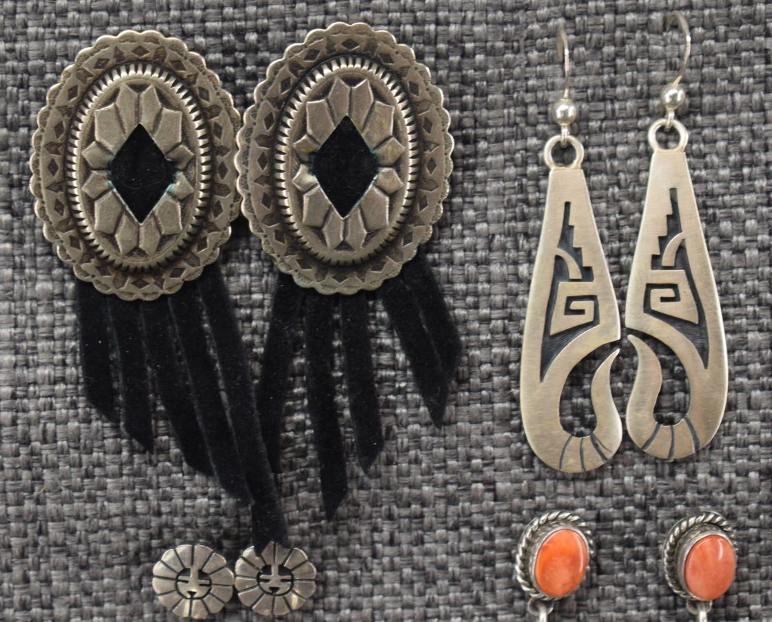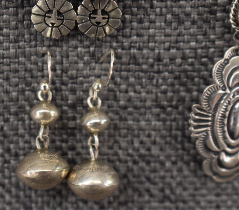 1990's sterling silver Hopi sun face 3/8" diameter 2" long signed with hallmark for Willie Archie Talaheftewa, Navajo sterling silver stamped beads1.25" long, stamped design with shell D Cadman 1.5" long total weight 25 grams