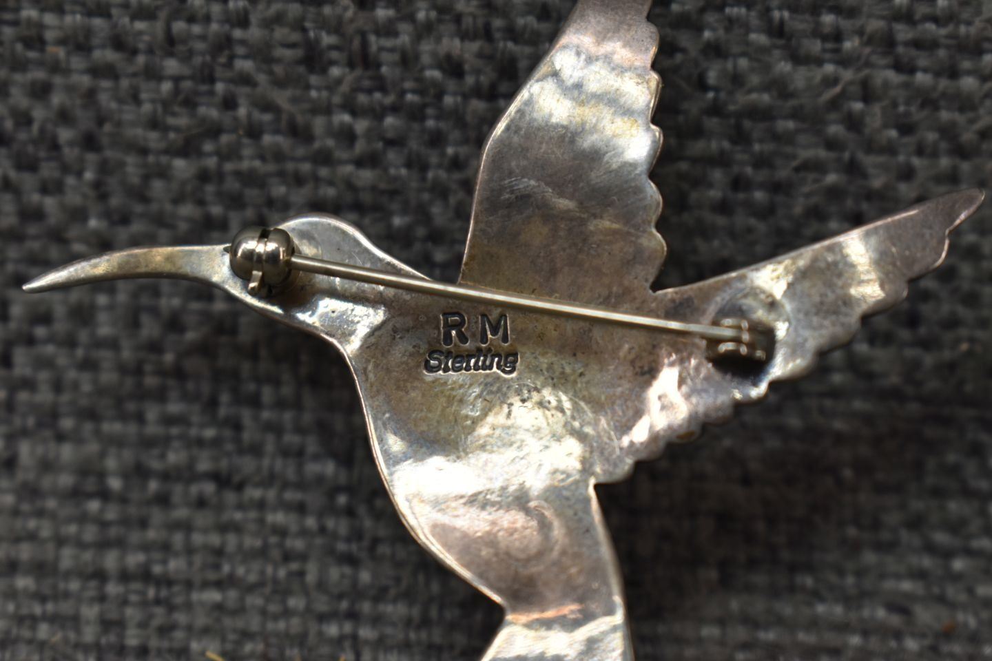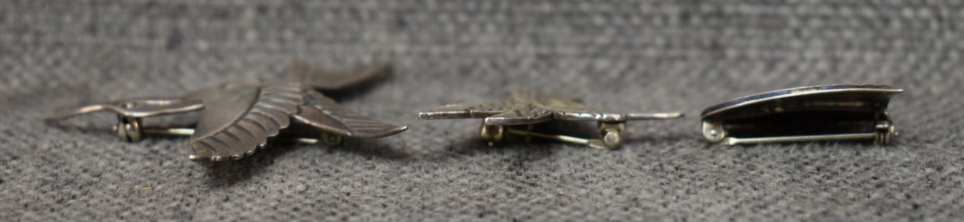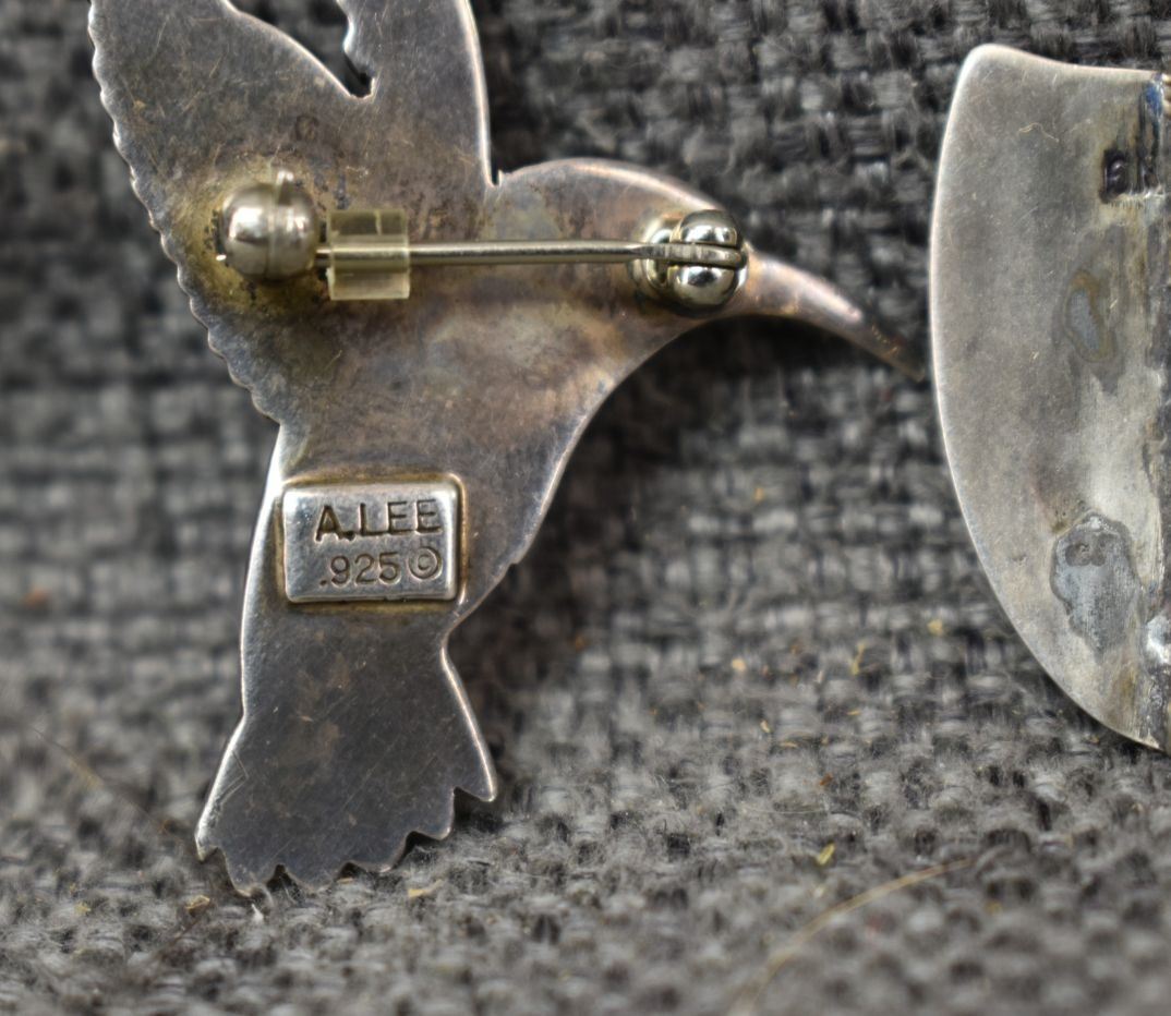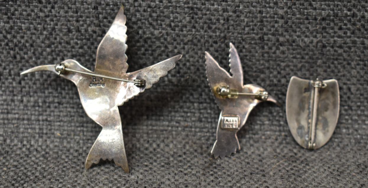 1990's Navajo, sterling silver with stamped design hummingbirds signed RM and A Lee, largest 2.25" x 2.25". 1990's Hopi, sterling silver overlay design 1" x .75" total weight 16 grams