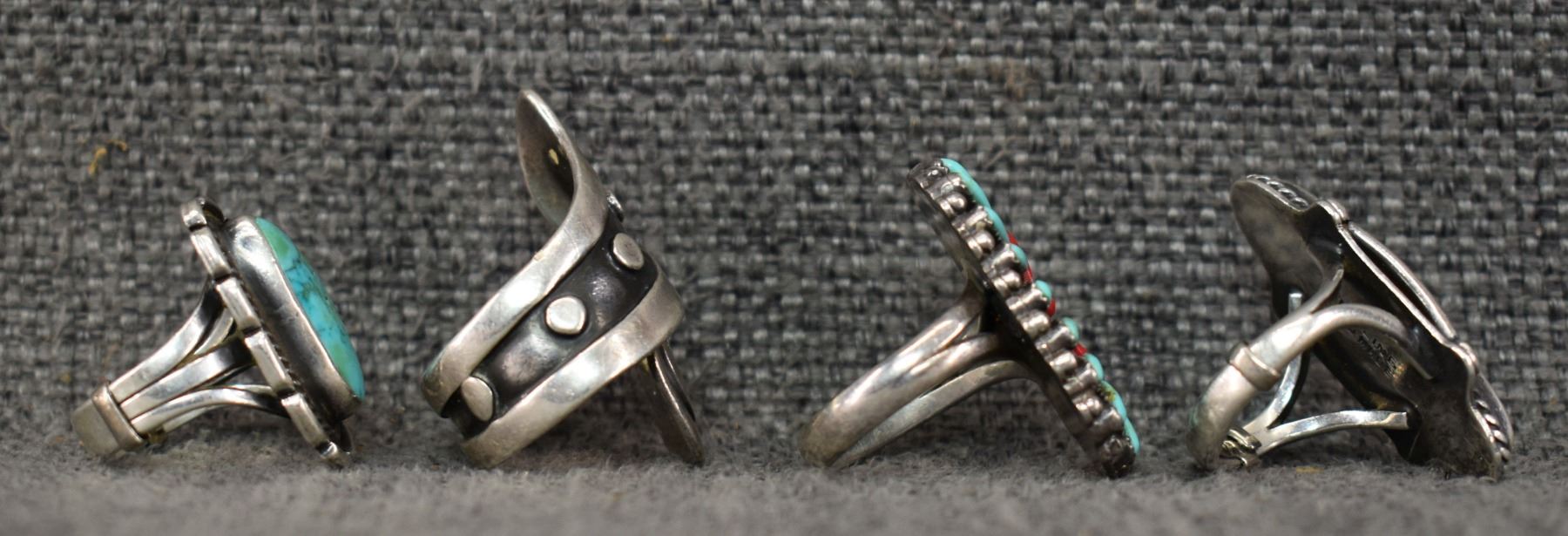 1970's Navajo and Mexican. Sterling silver turquoise and coral rings. Sizes 5-8. total weight 34 grams