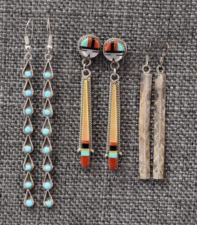 1990's Navajo, sterling silver stamped design 2.5" long , turquoise stones 3.5". 1990's Zuni sterling silver with mosaic inlaid shell turquoise and coral 2.5" long. Total weight 23 grams