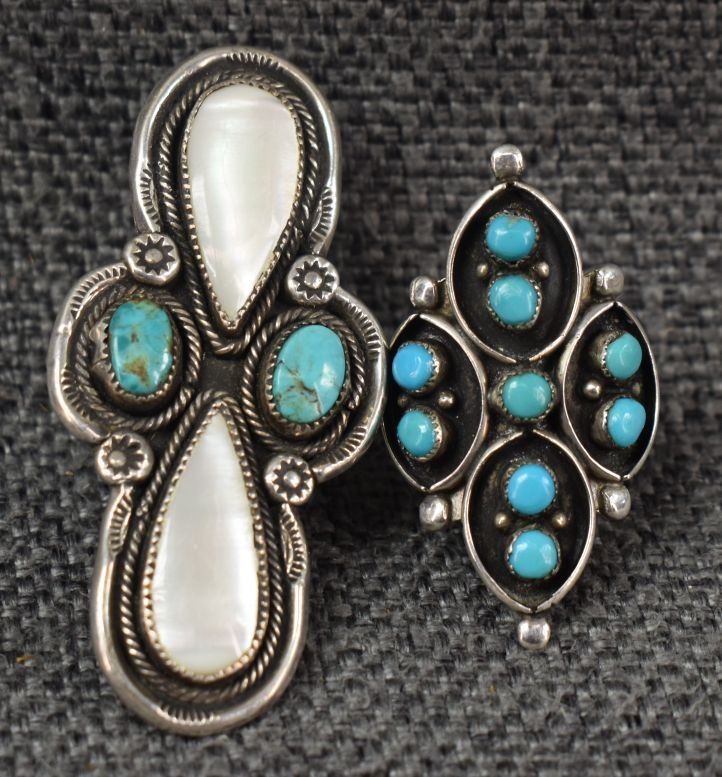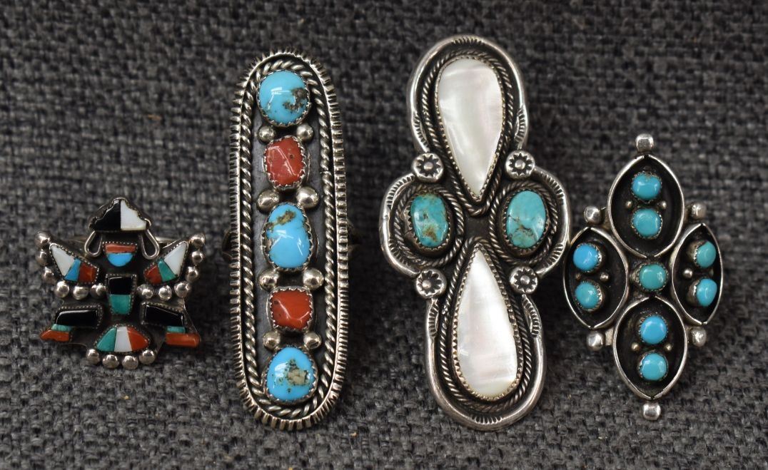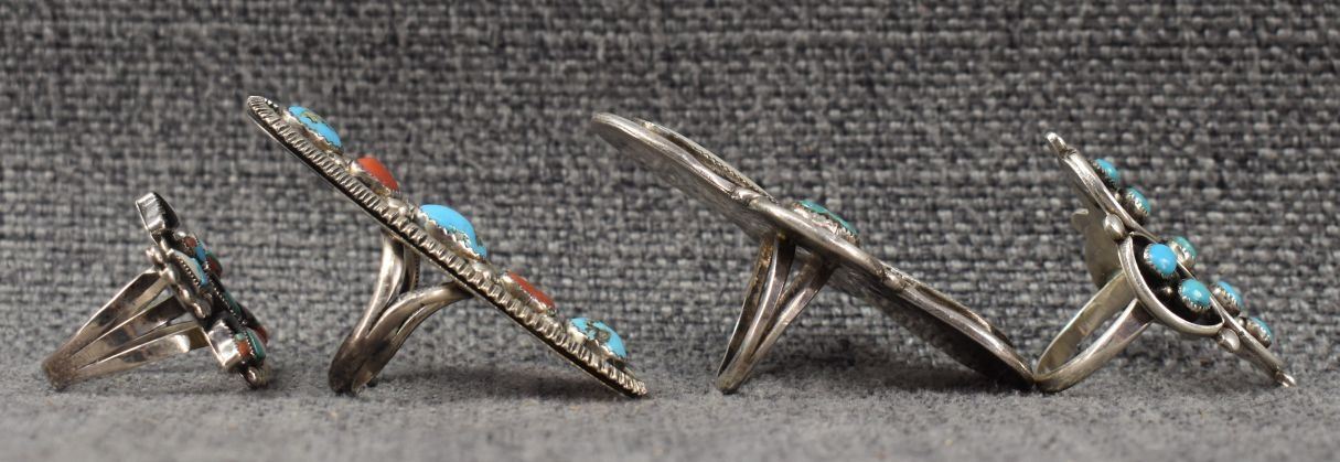 1970-80's Navajo, sterling silver stamped design with turquoise and shell 2.25" size 6, turquoise and coral 2.25" size 6, turquoise snake eye size 7, Zuni inlaid turquoise coral Jett kachina figure size 7 total weight 39 grams