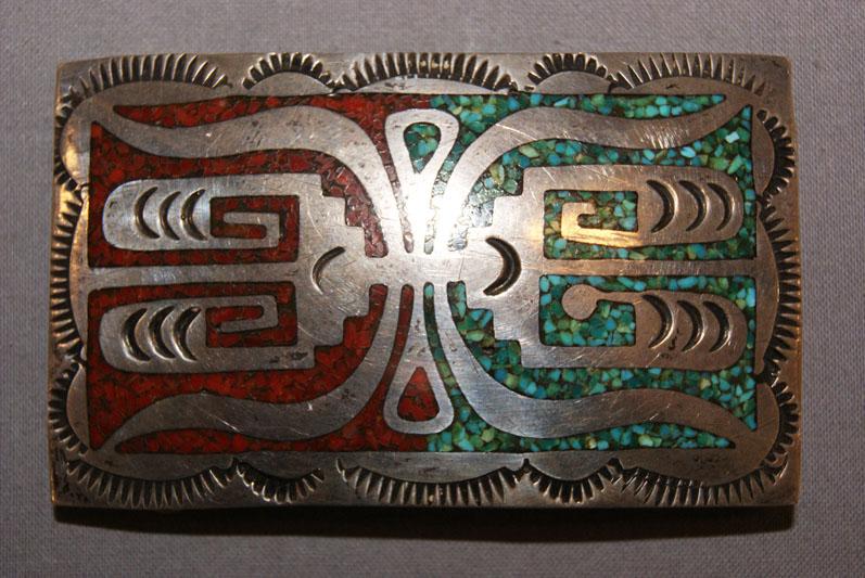 1970s sterling silver chip inlaid turquoise and coral 1.75"x3"