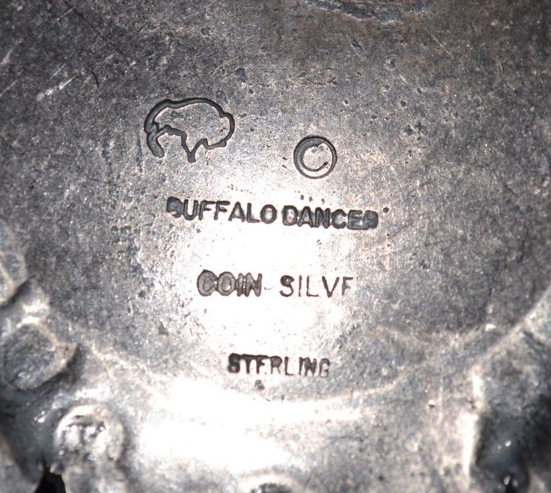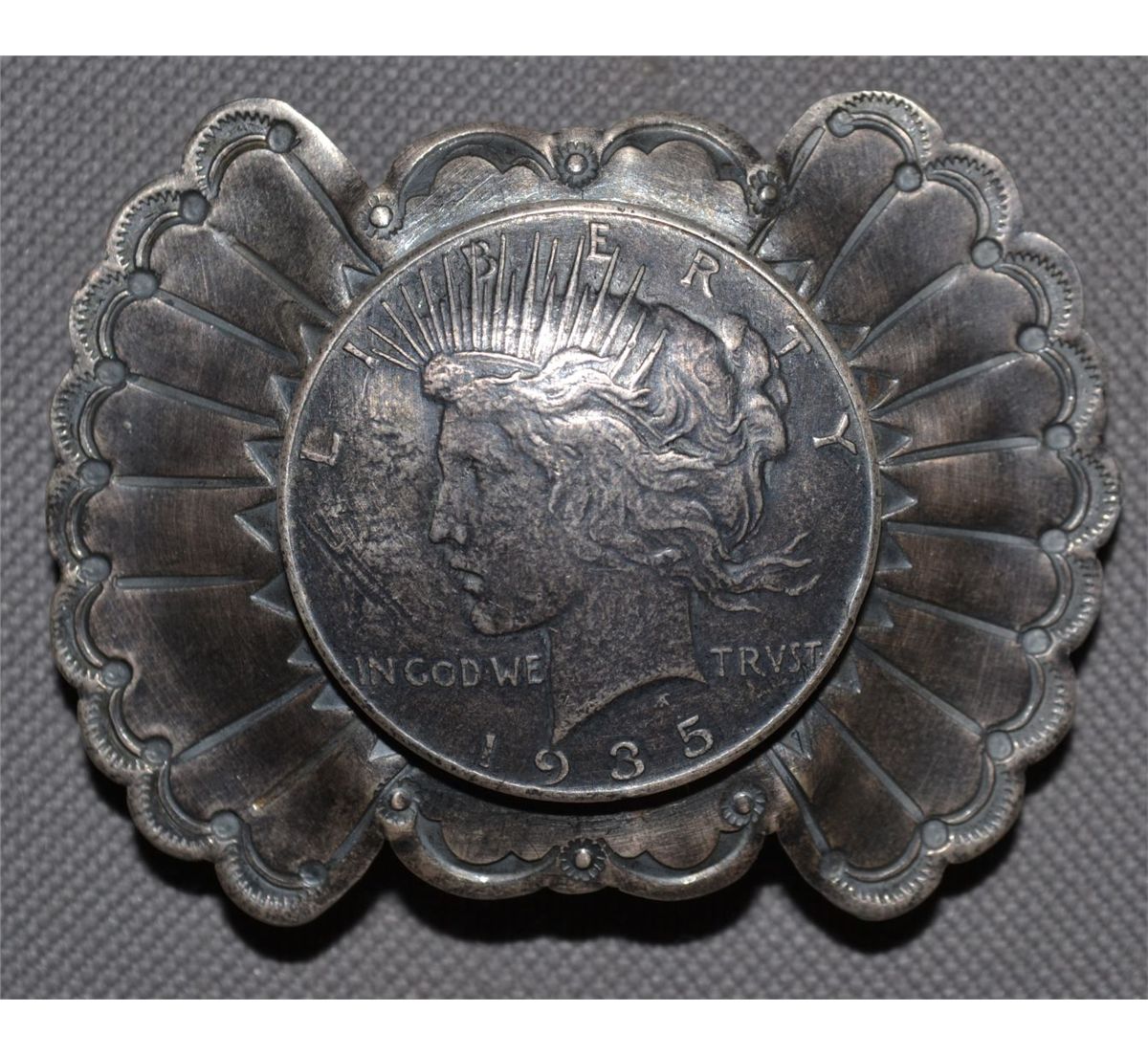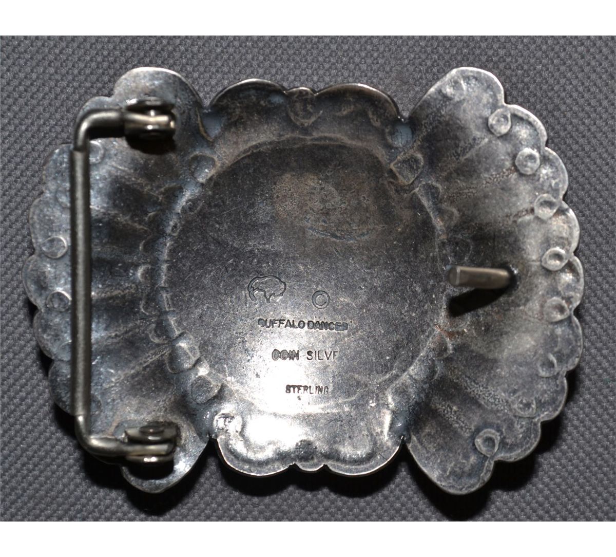 1980s sterling silver buckle Marked Buffalo dances with 1935 liberty Dollar 2" x 2.75" made for 1.5 inch wide belt