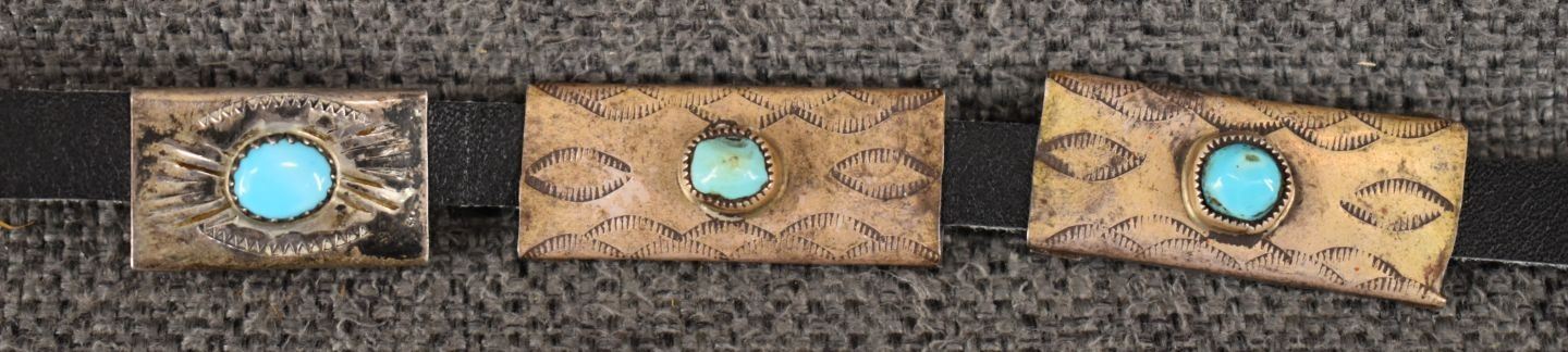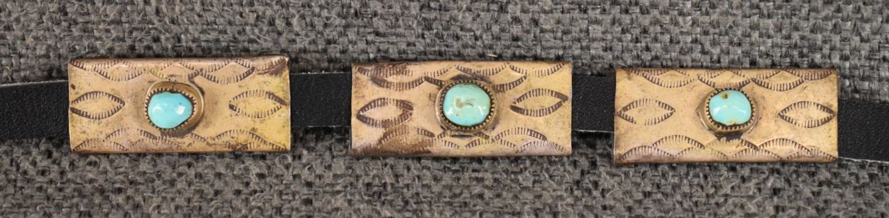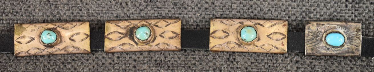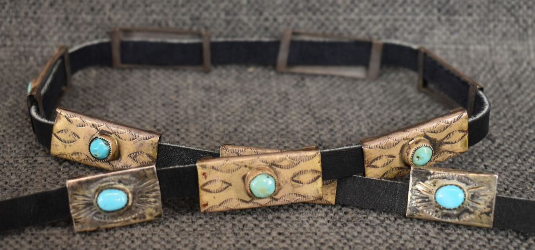 1960's Navajo. sterling silver and turquoise hat band, total weight 36 grams. Excluding 3/8'' x 42'' leather belt