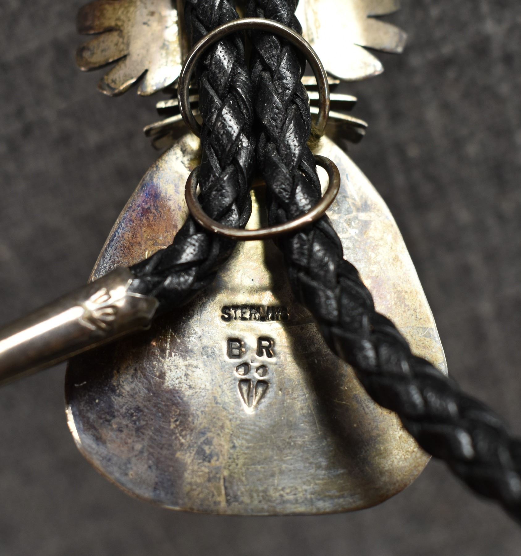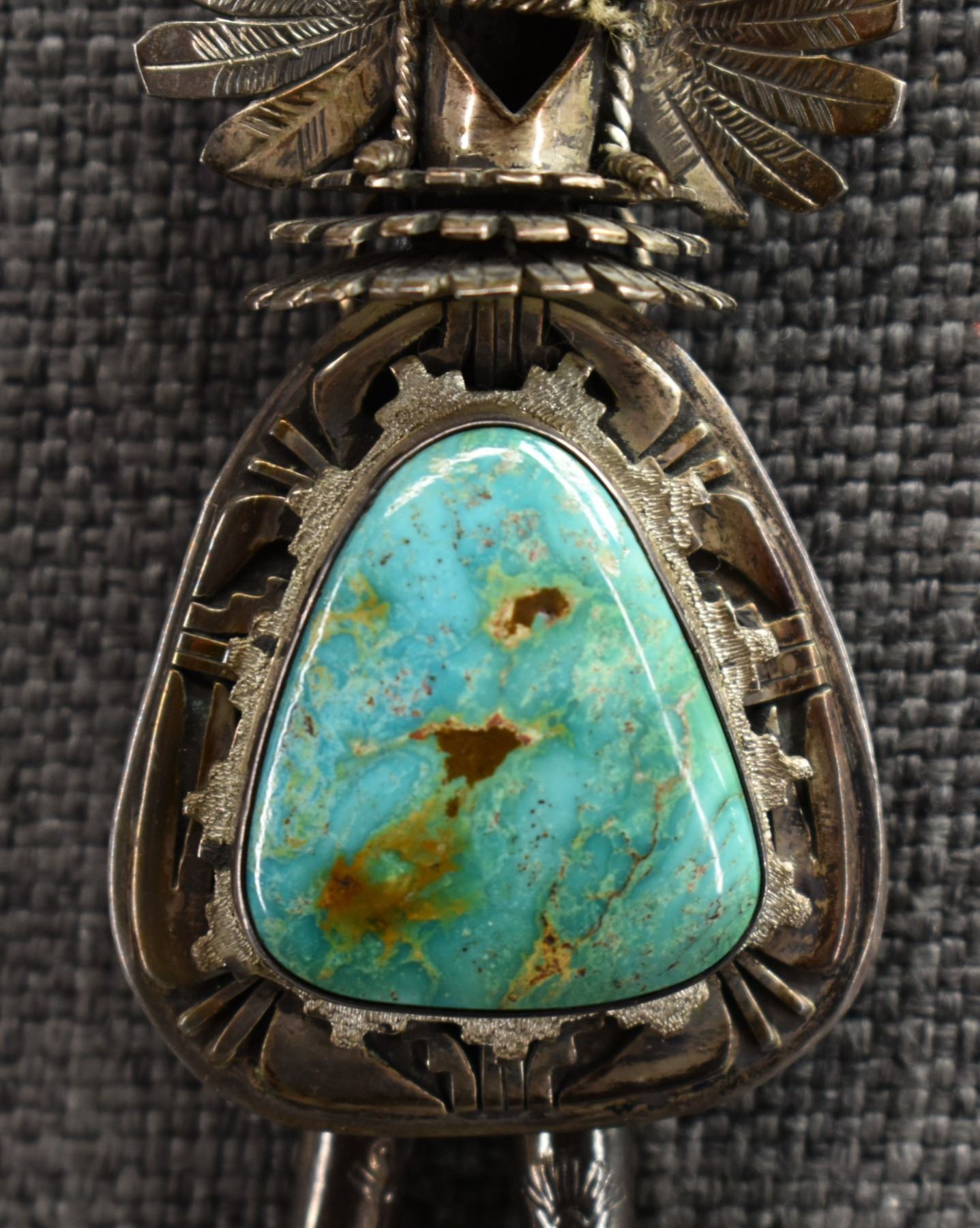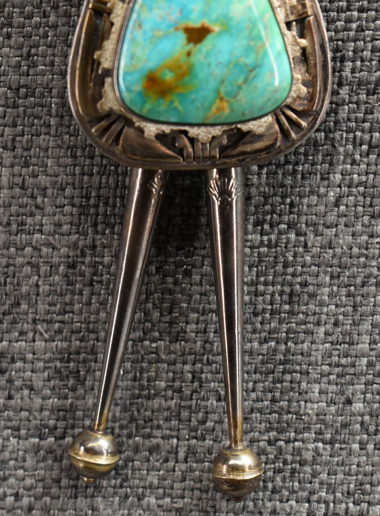 1980's Navajo. Sterling silver and turquoise depicting kachina. Signed with hallmark.3'' x 1.5''. Total weight 68 grams