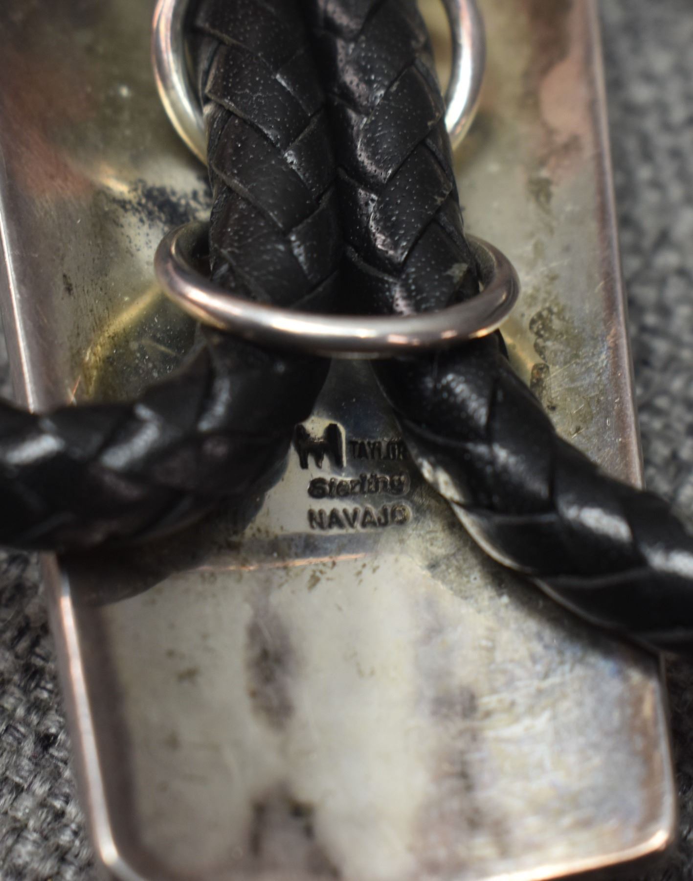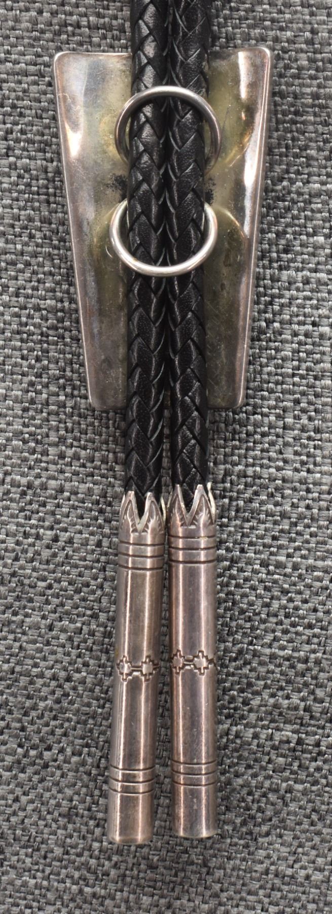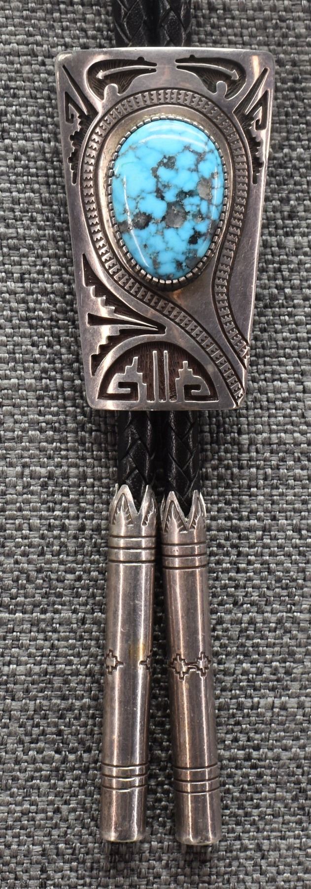 1990's Navajo. Sterling silver and turquoise bolo by Herbert Taylor. 2.5'' x 1.75'' tips 2.5'' long. Total weight 122 grams