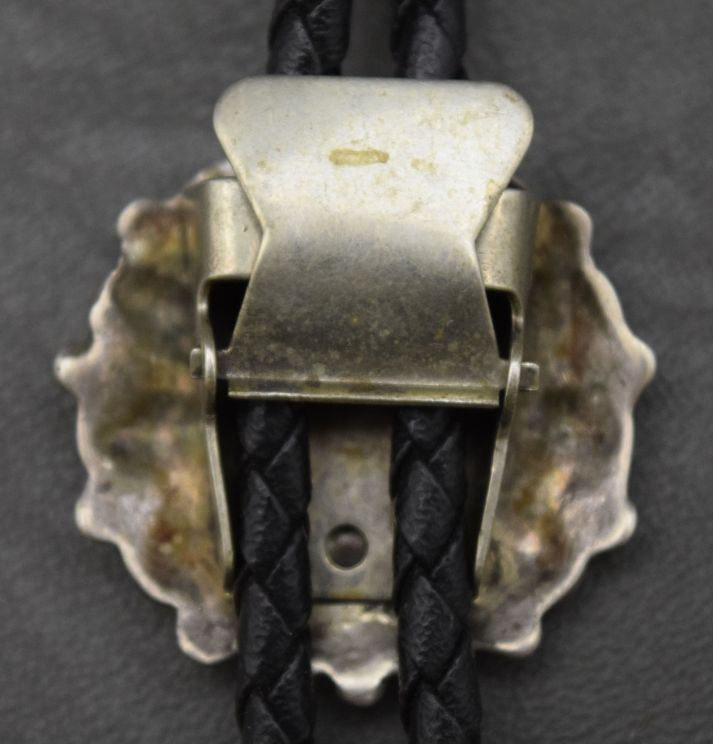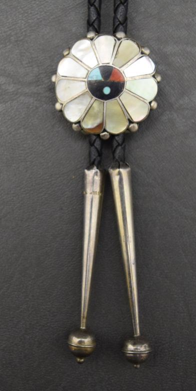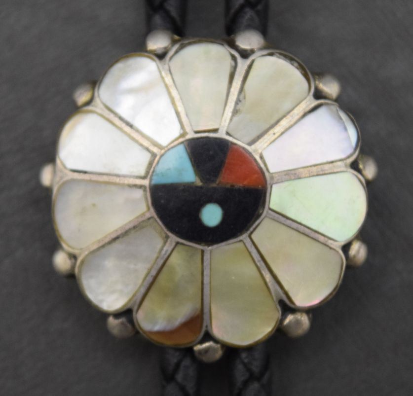 1970's sterling silver with shell turquiose and jet mosaic inlay 1.25'' dia