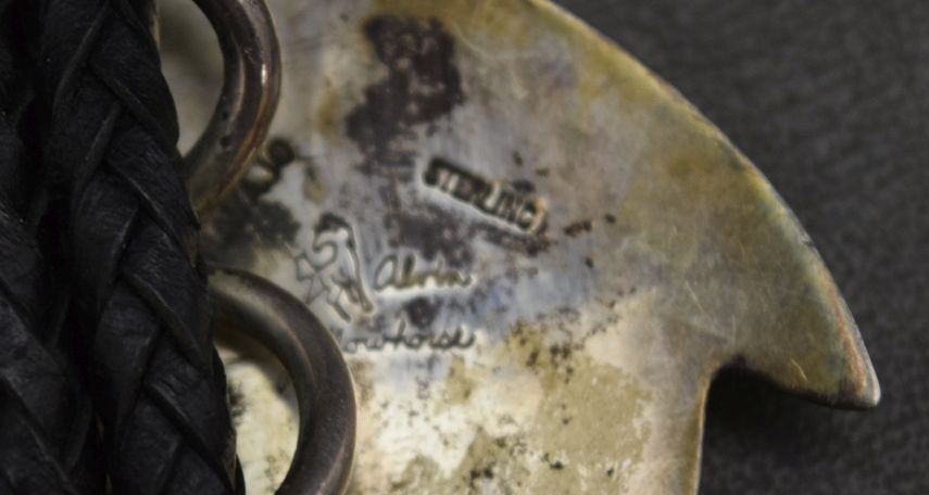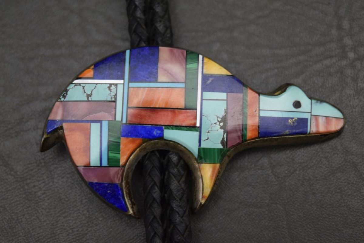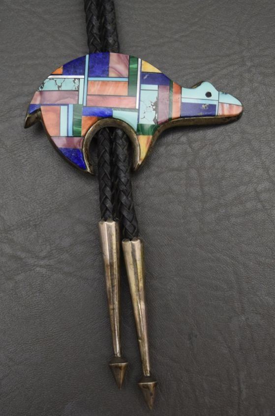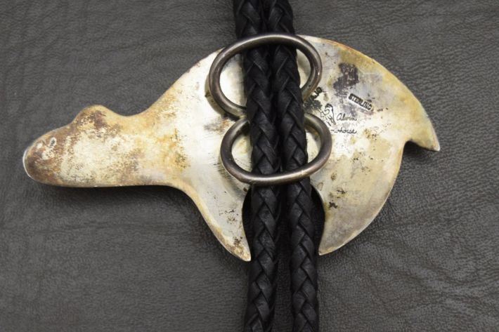 1980's mosaic in lay turquoise Malecite and shell set in sterling silver depicting bear signed Alvin Yellowhorse. 2'' x 3.5'' total weight 80 grams