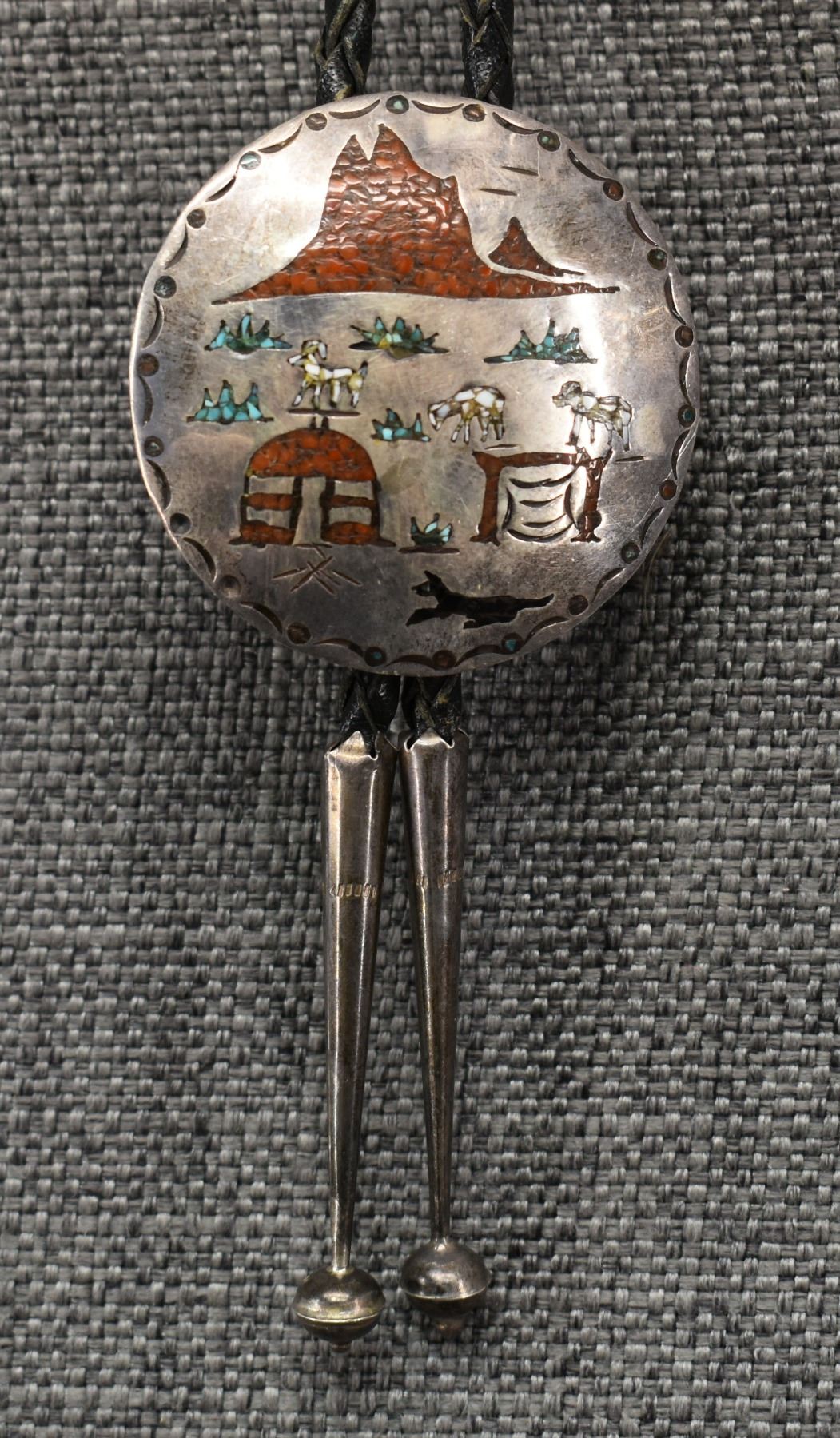 1970's Navajo bolo with chip inlay turquoise coral and jet set in stealing silver. 2" x 2". Total weight 42 grams.