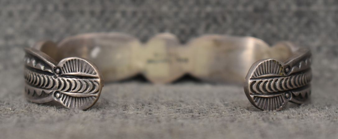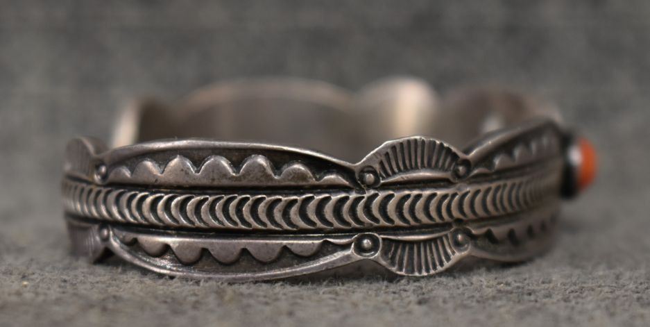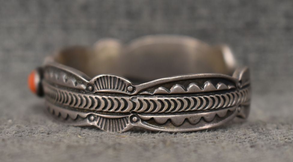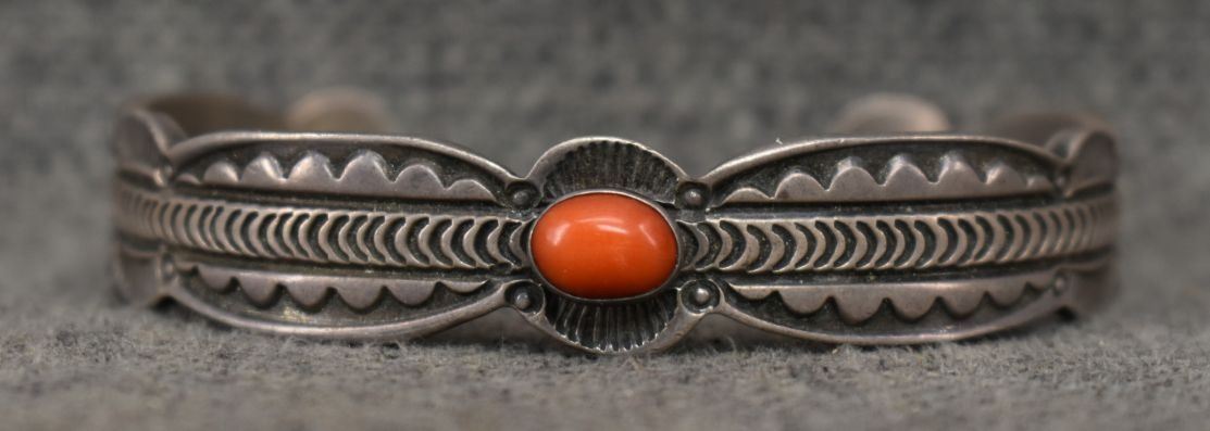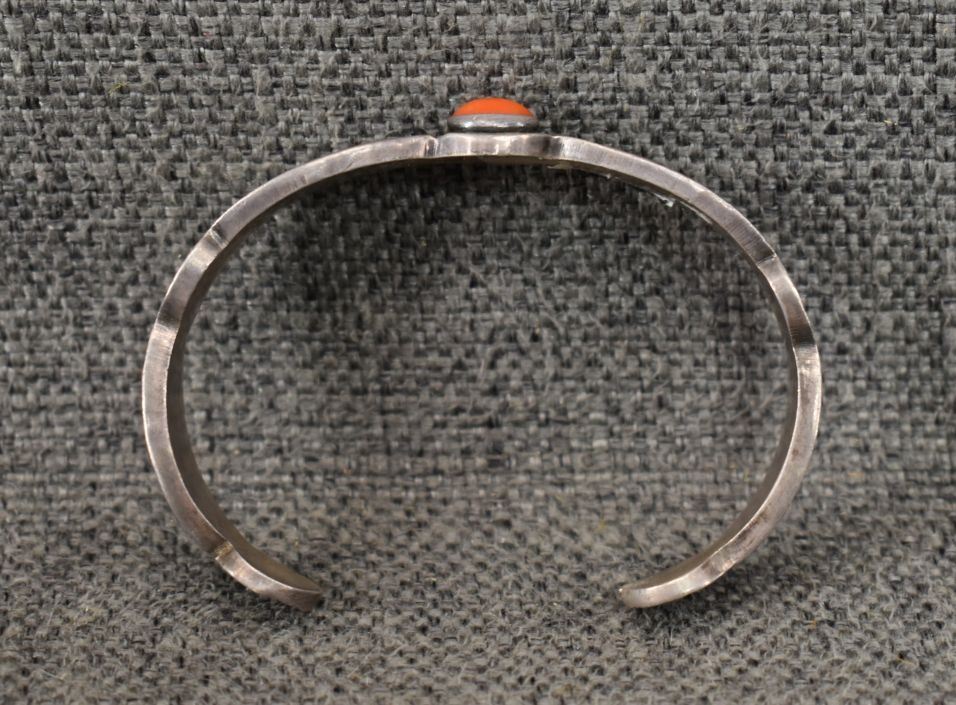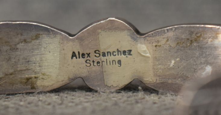1980s 90s Navajo. sterling silver and coral bracelet signed Alex Sanchez. .5'' x 5.25'' x 1.25''. Total weight 41 grams