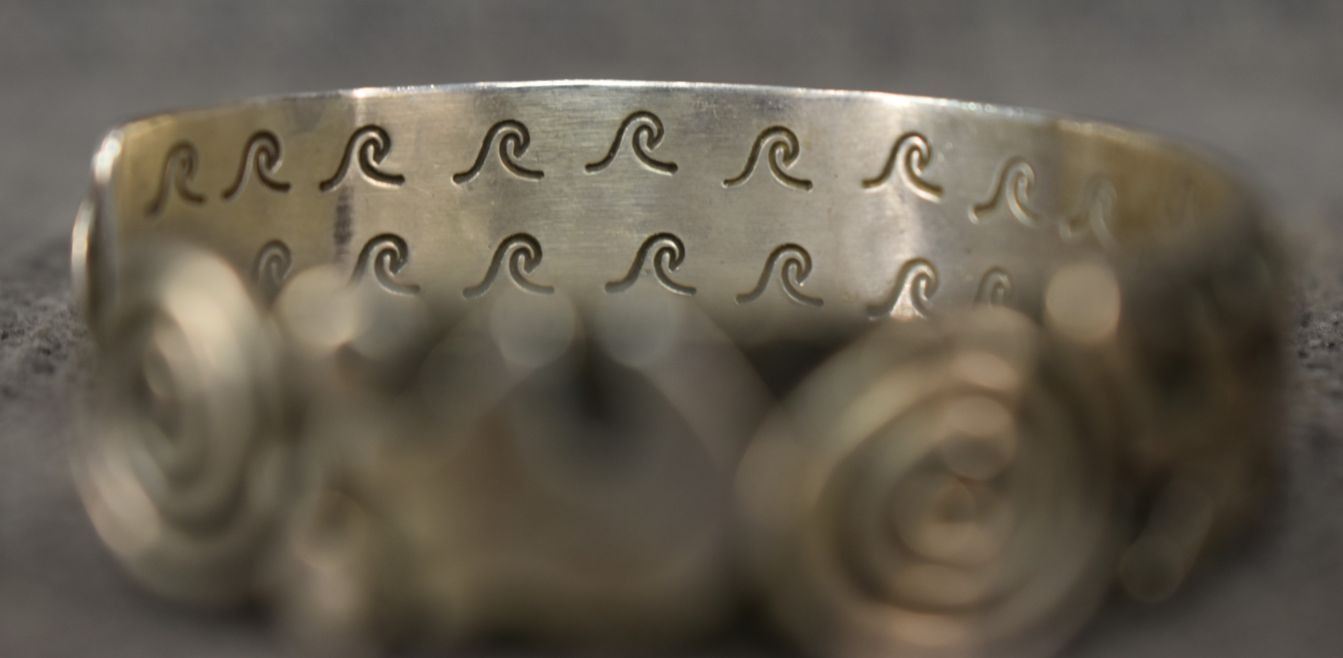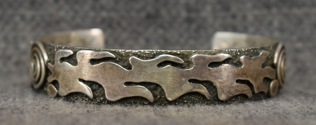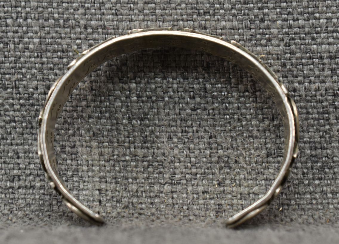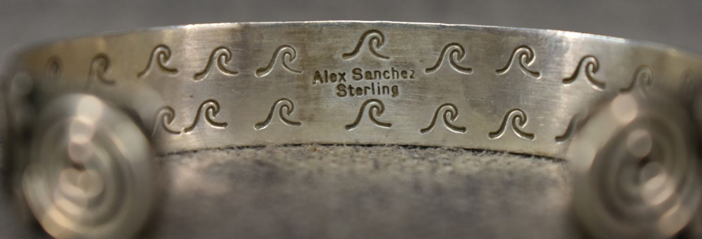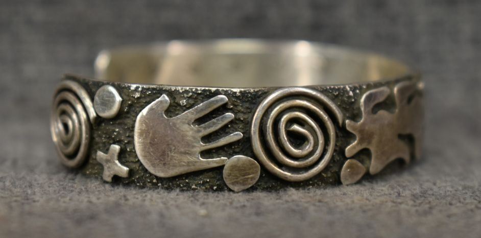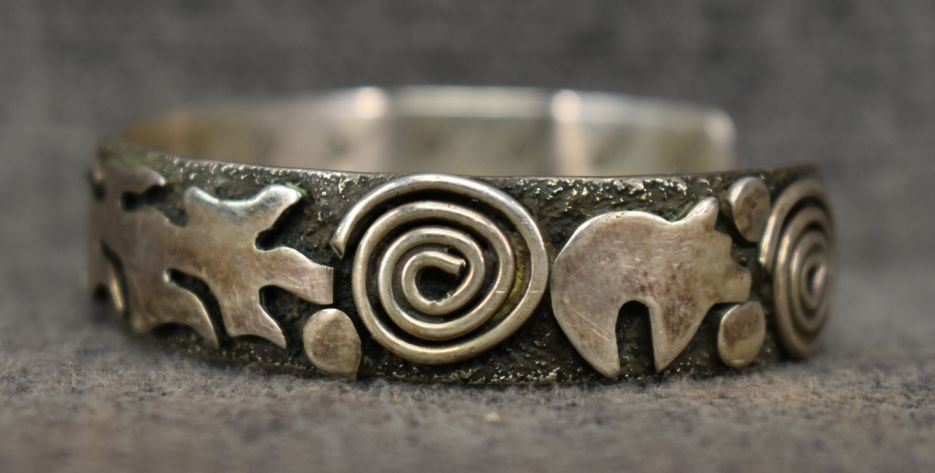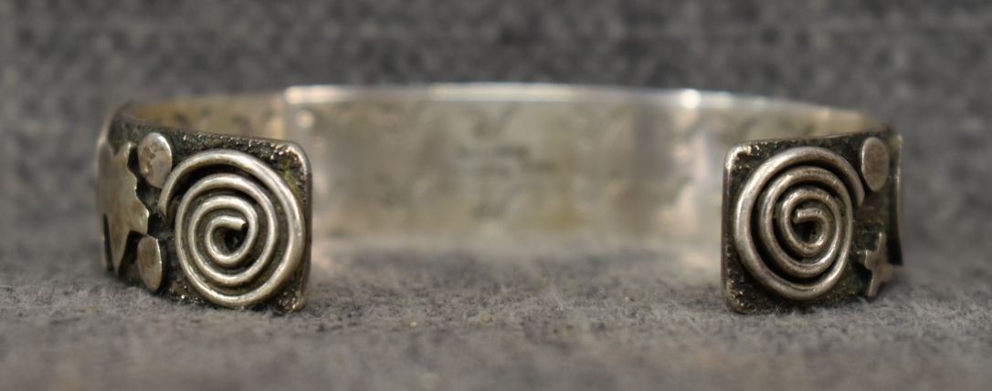 2000's Navajo, Sterling silver petroglyph style and stamped designs by Alex Sanchez .5" x 5.5" x 1.25", total weight 36 grams