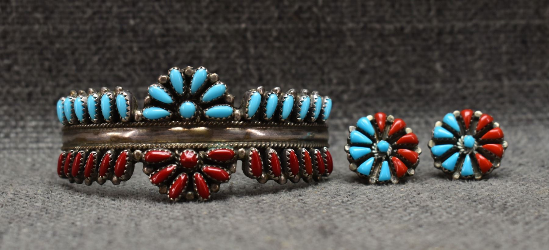 1980's Navajo, sterling silver turquoise and coral design signed DJ 1.25" x 5.75" x 1.5" matching earrings .75" diameter total weight 28 grams
