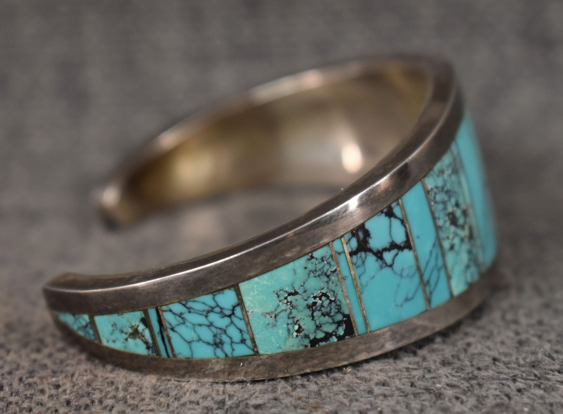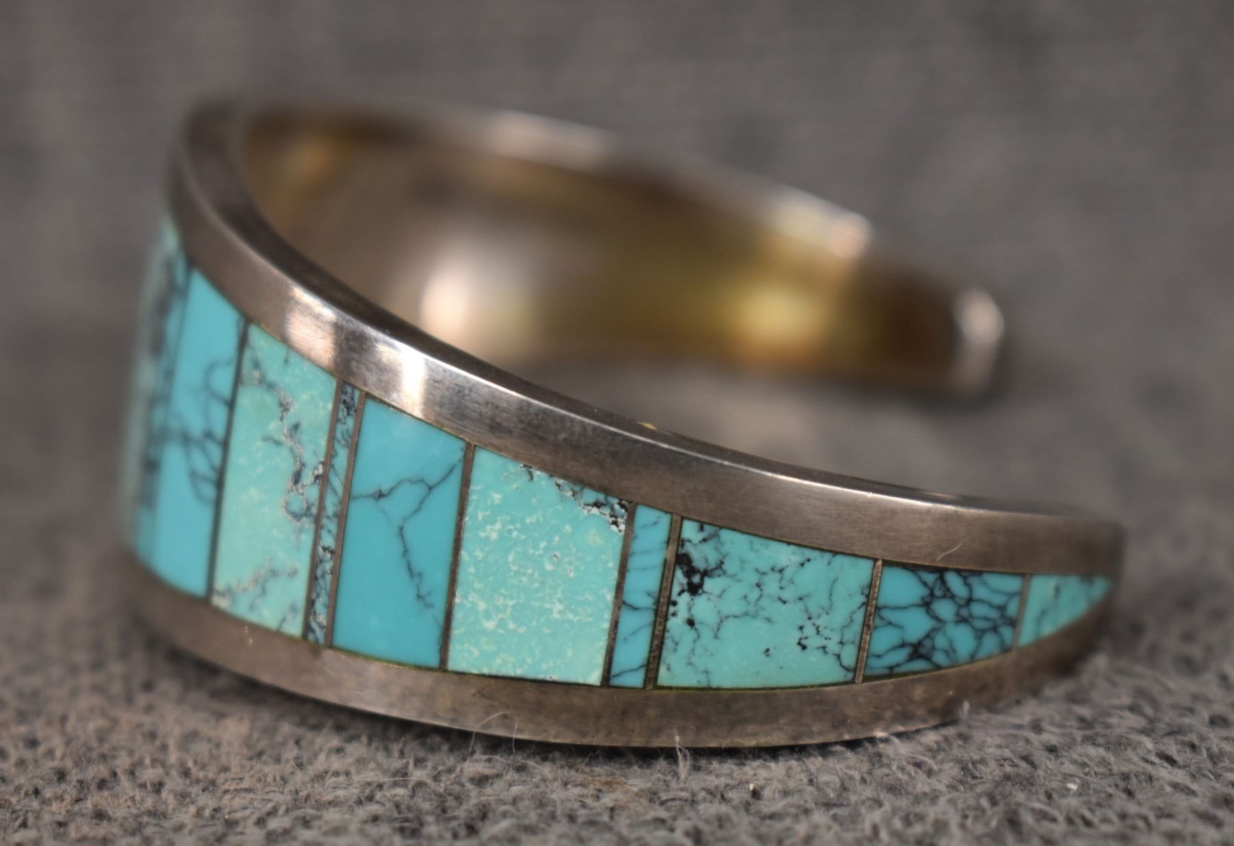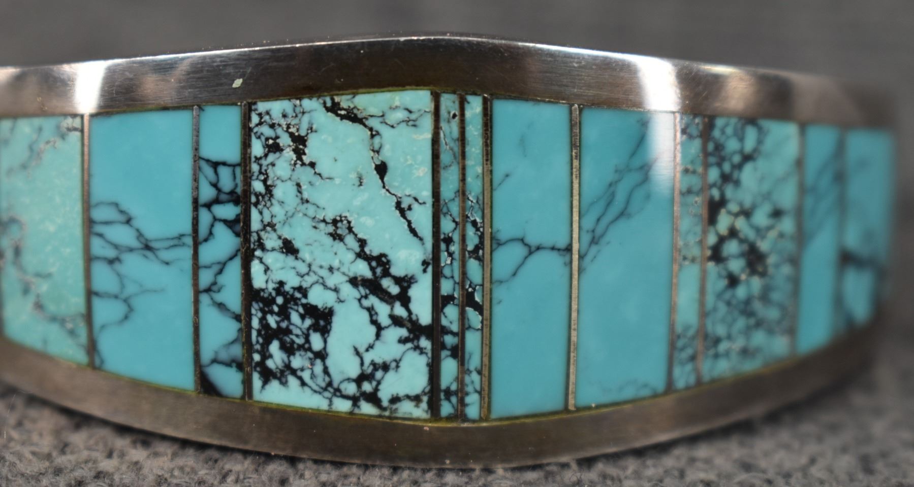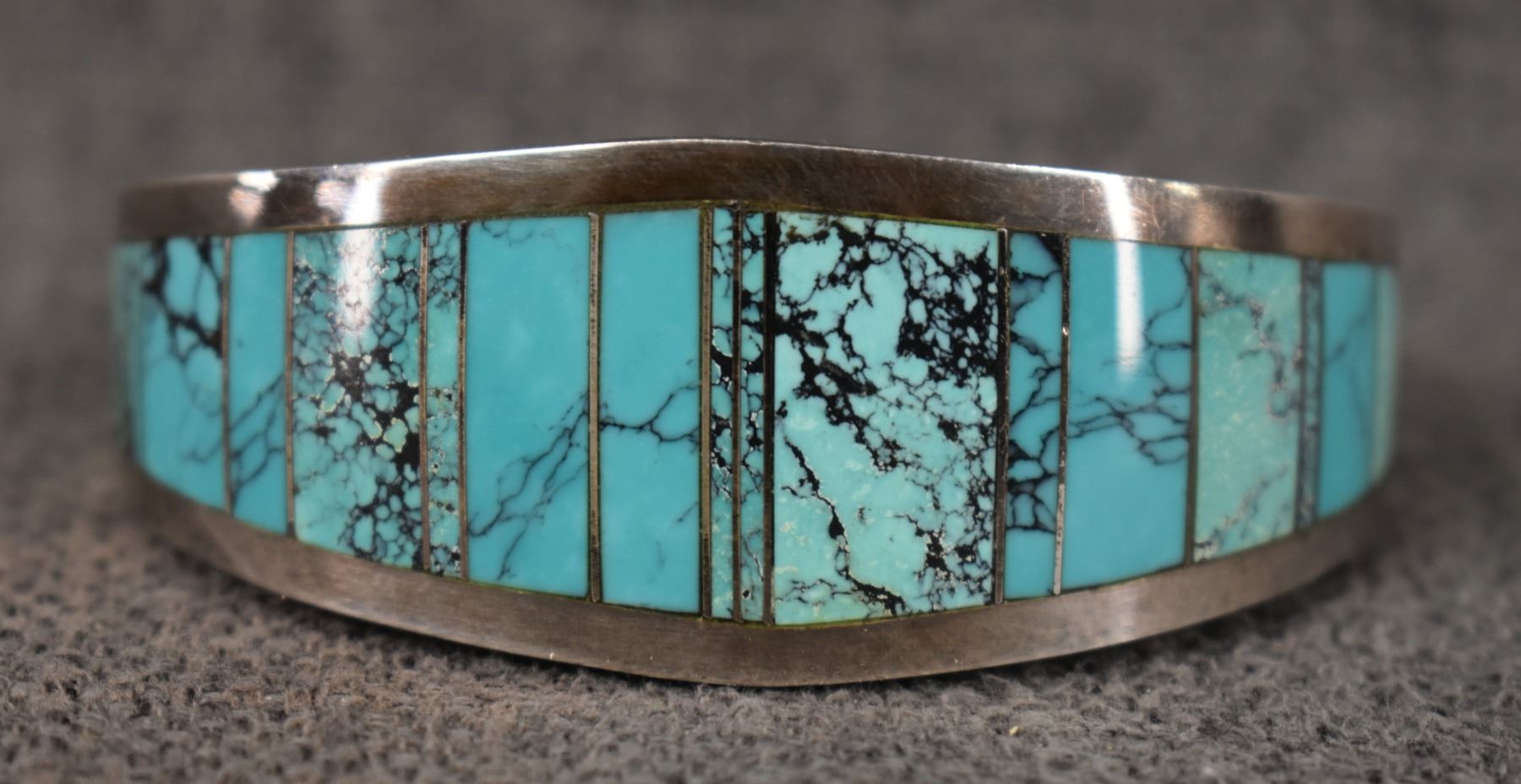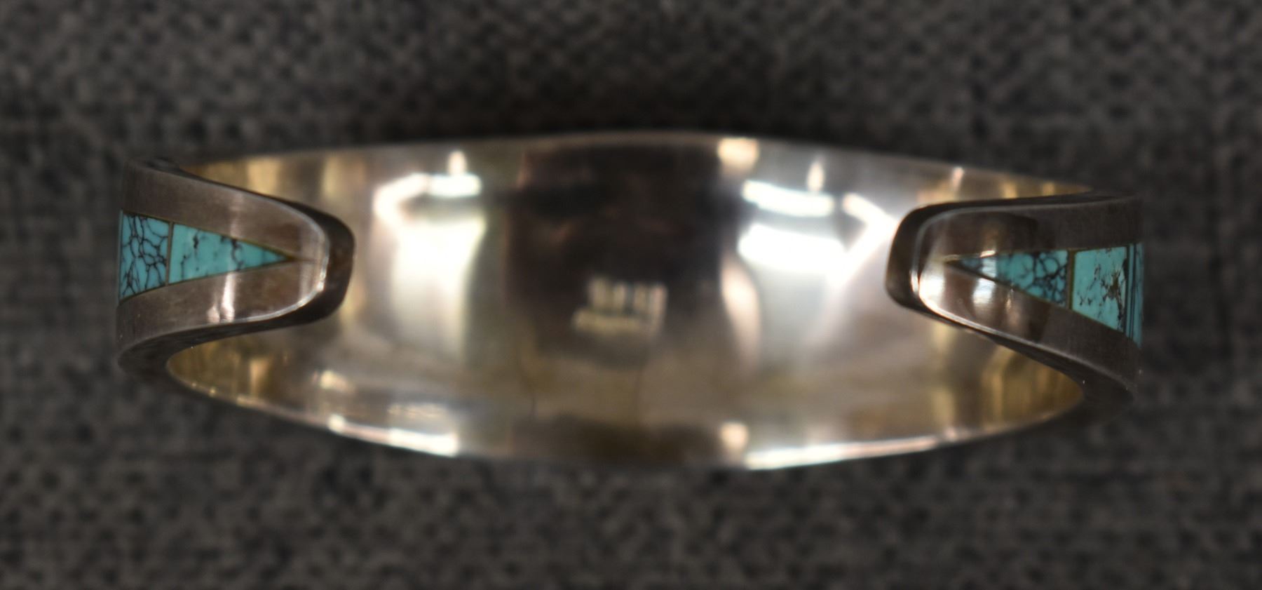 1990's Navajo, Sterling silver with channel inlaid turquoise signed BM, 1" x 5.5" x 1.25" total weight 54 grams