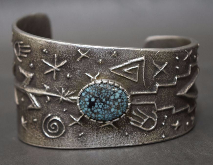 1980's sterling silver tufa cast bracelet with single turquoise stone 1.75'' x 5.5'' x 1.25'' total weight 114 grams