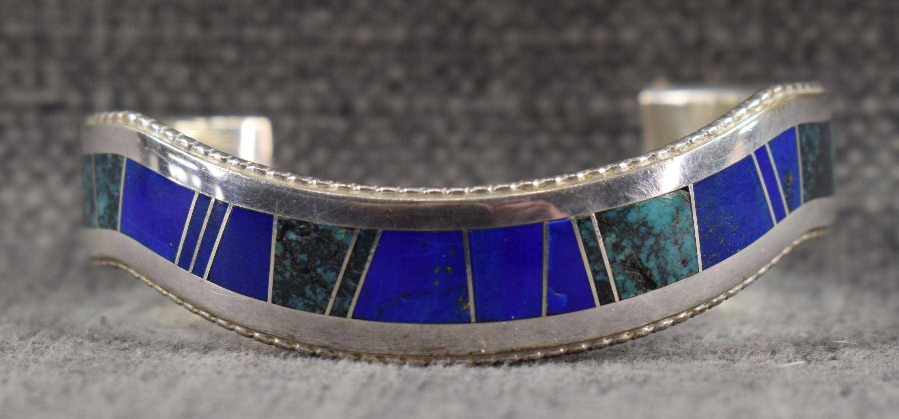 1990's Navajo, sterling silver with channel inlaid turquoise and lapis by J Charley .5" x 5.25" x 1.5" total weight 40 grams