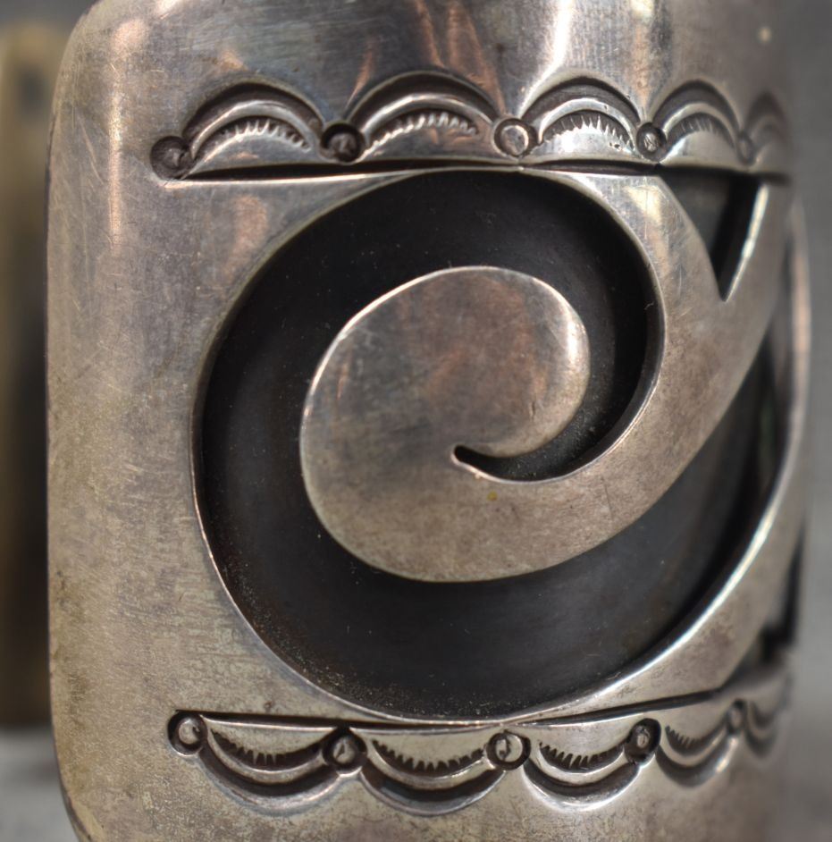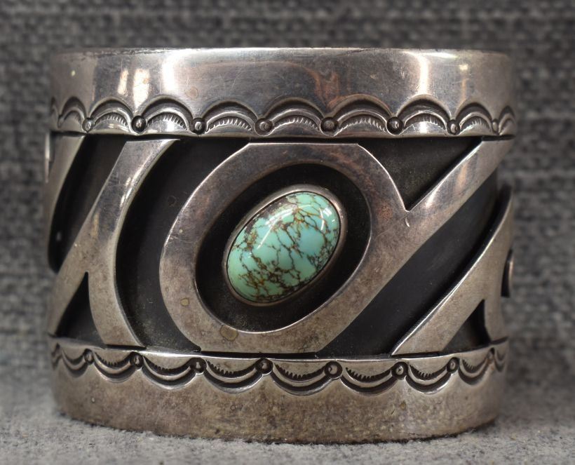 1970-80's Navajo sterling silver cutout and stamped design with turquoise stone signed J C, 2" x 5.5" x 1.25" total weight 110 grams