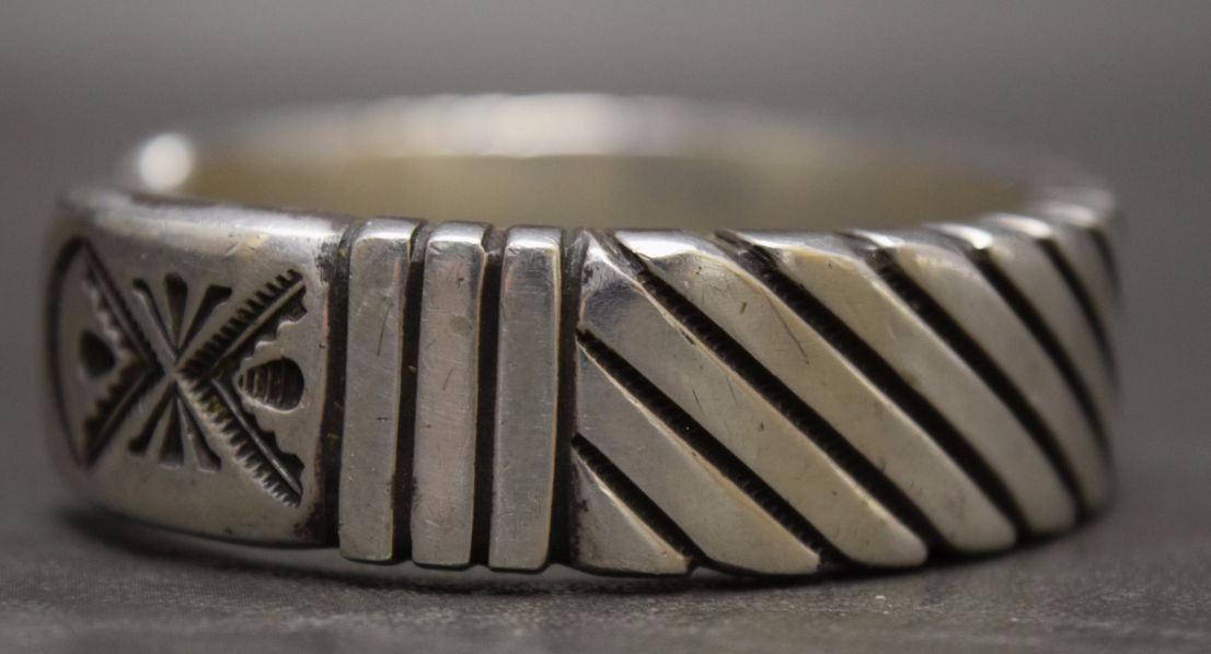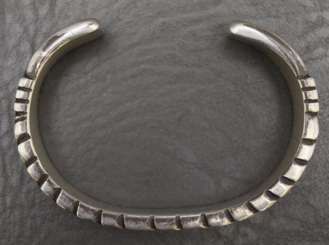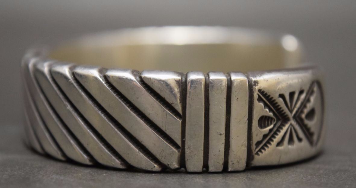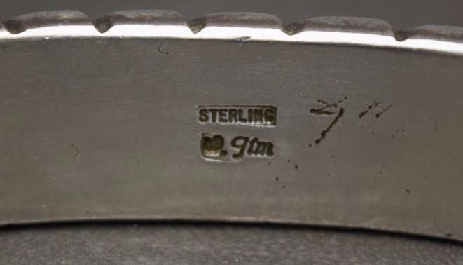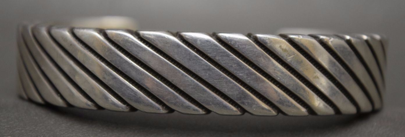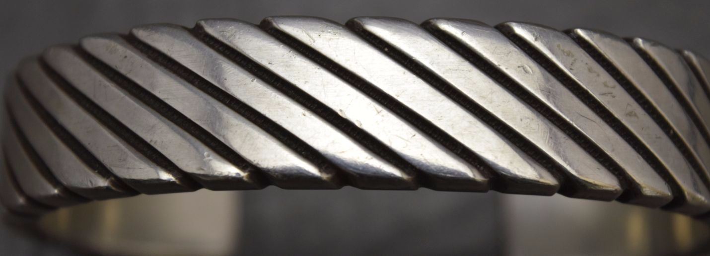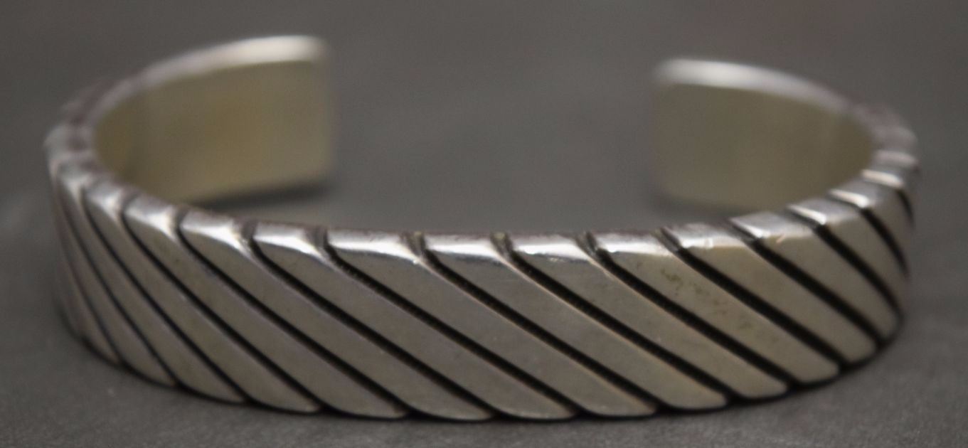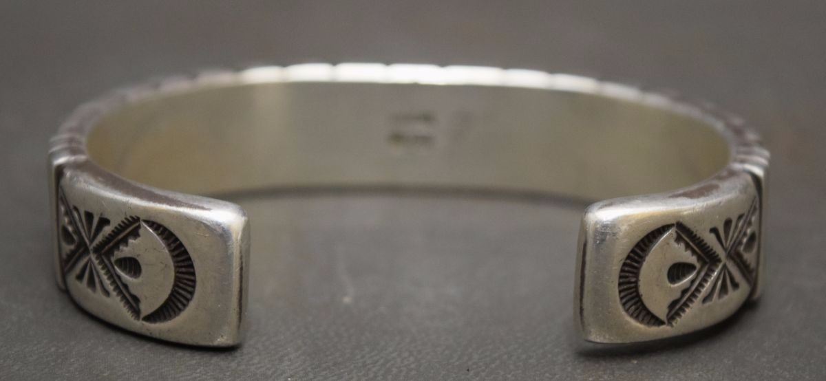 1980's sterling silver with stamped design 5/8'' x 6.25'' x 1.25'' total weight 128 grams marked W Jim