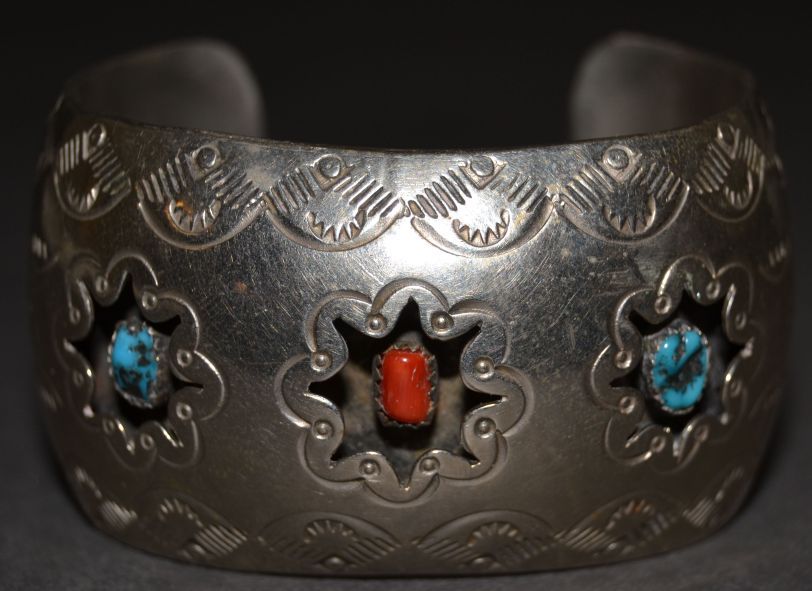 1960s hand made sterling silver shadow box style with turquoise and coral, signed with initials N S or S N, 1.5" x 5" x 1.25"