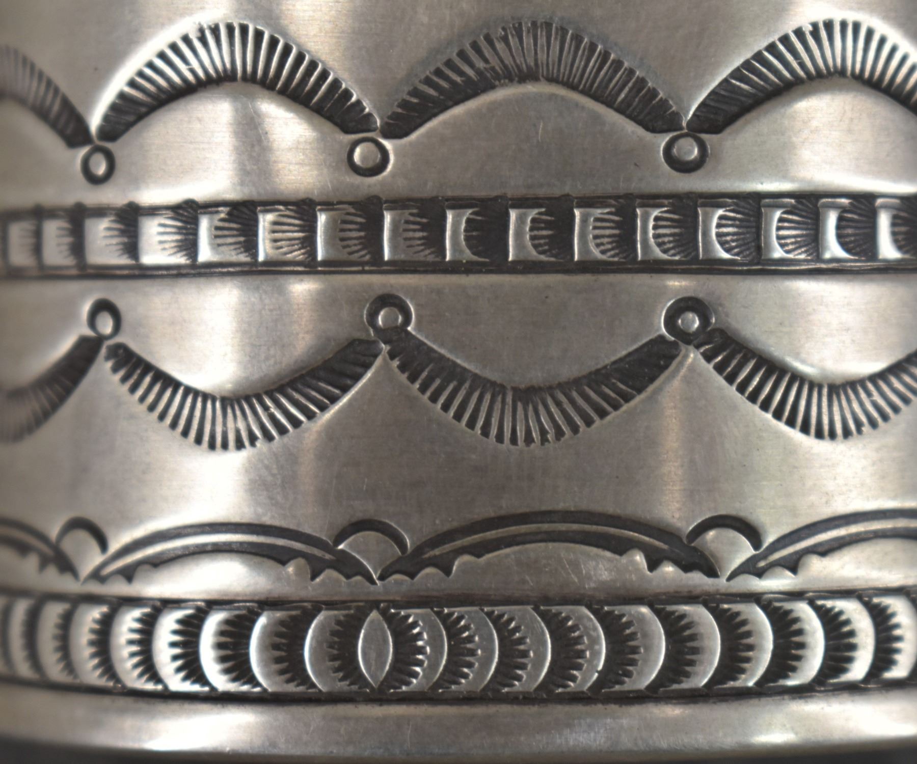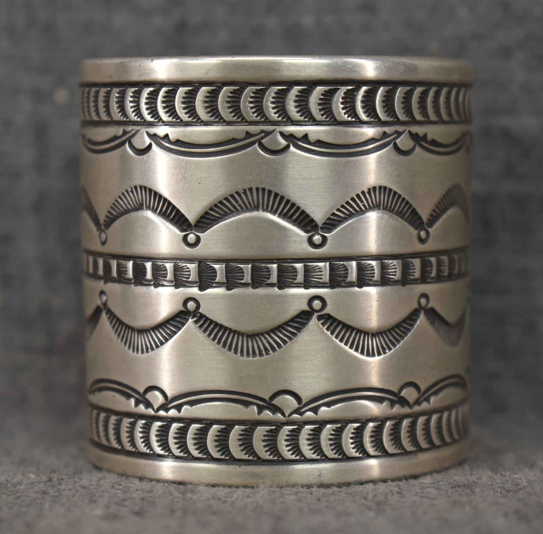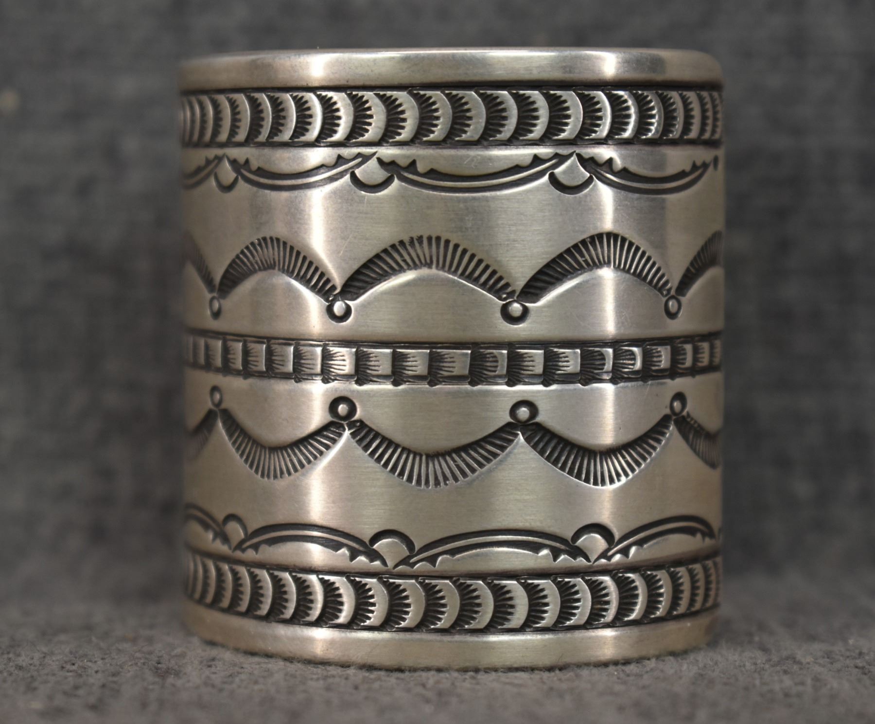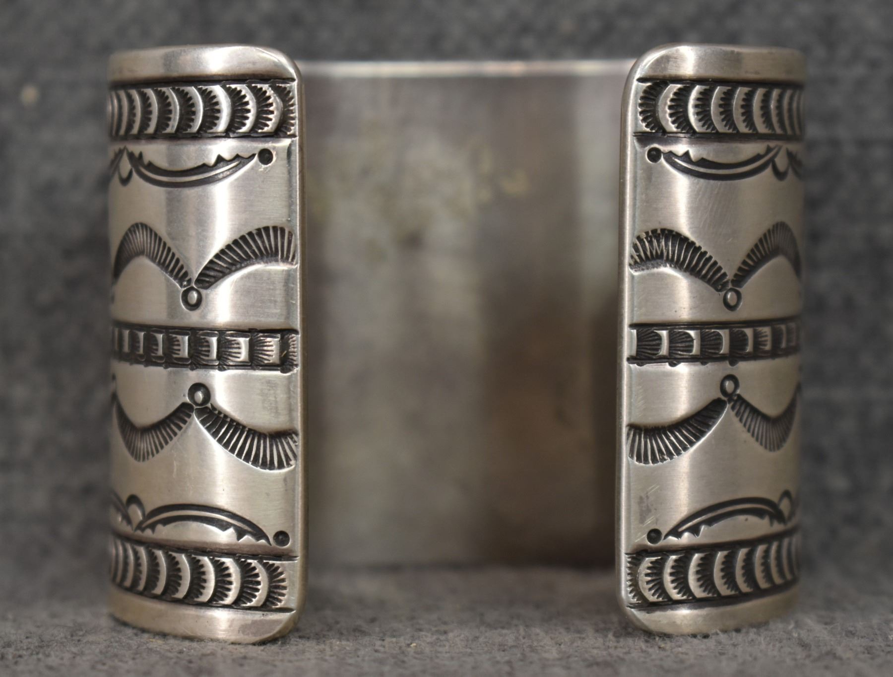 1980's Navajo, sterling silver stamped design signed R. Chee. 2" x 5.75" x 1" total weight 200 grams
