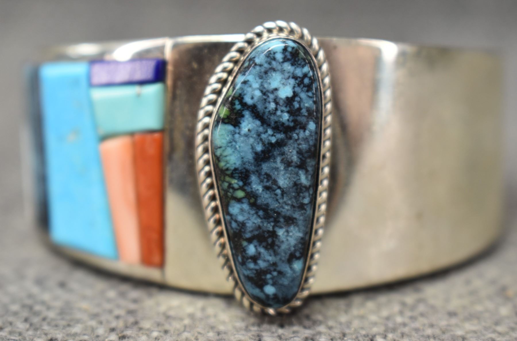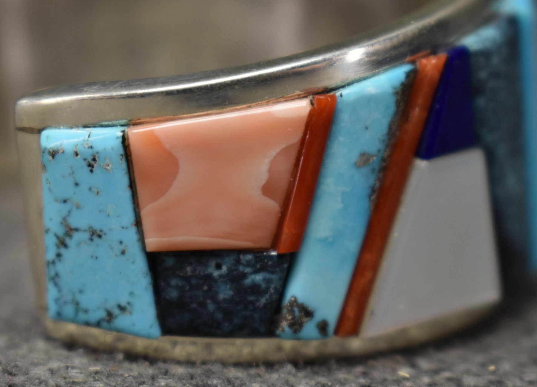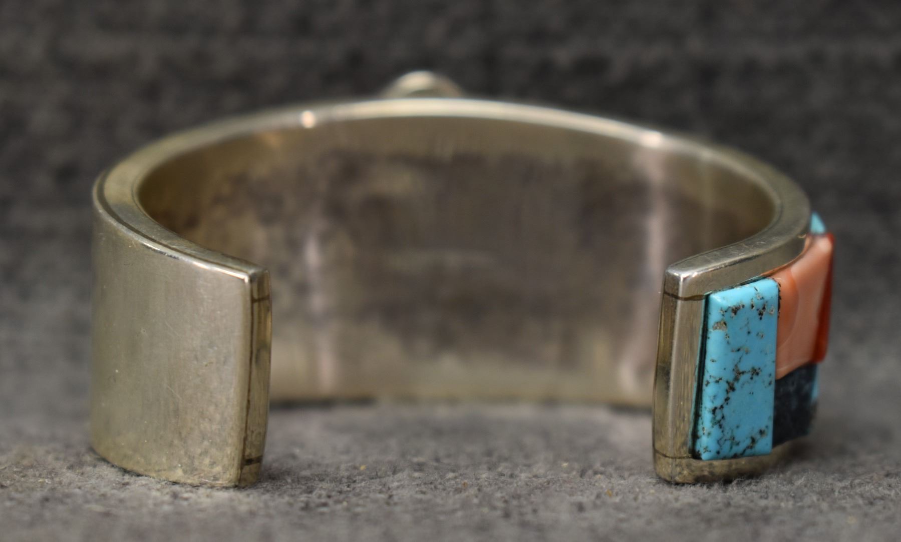 1970's Navajo. Sterling silver turquoise coral and shell. Signed T.Draper. 1'' x 4.75'' x 1.25''. Total weight 65 grams