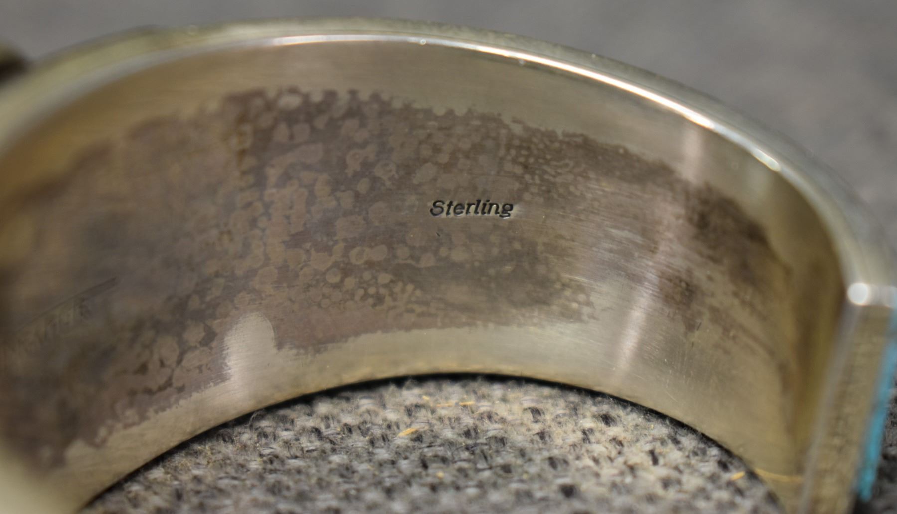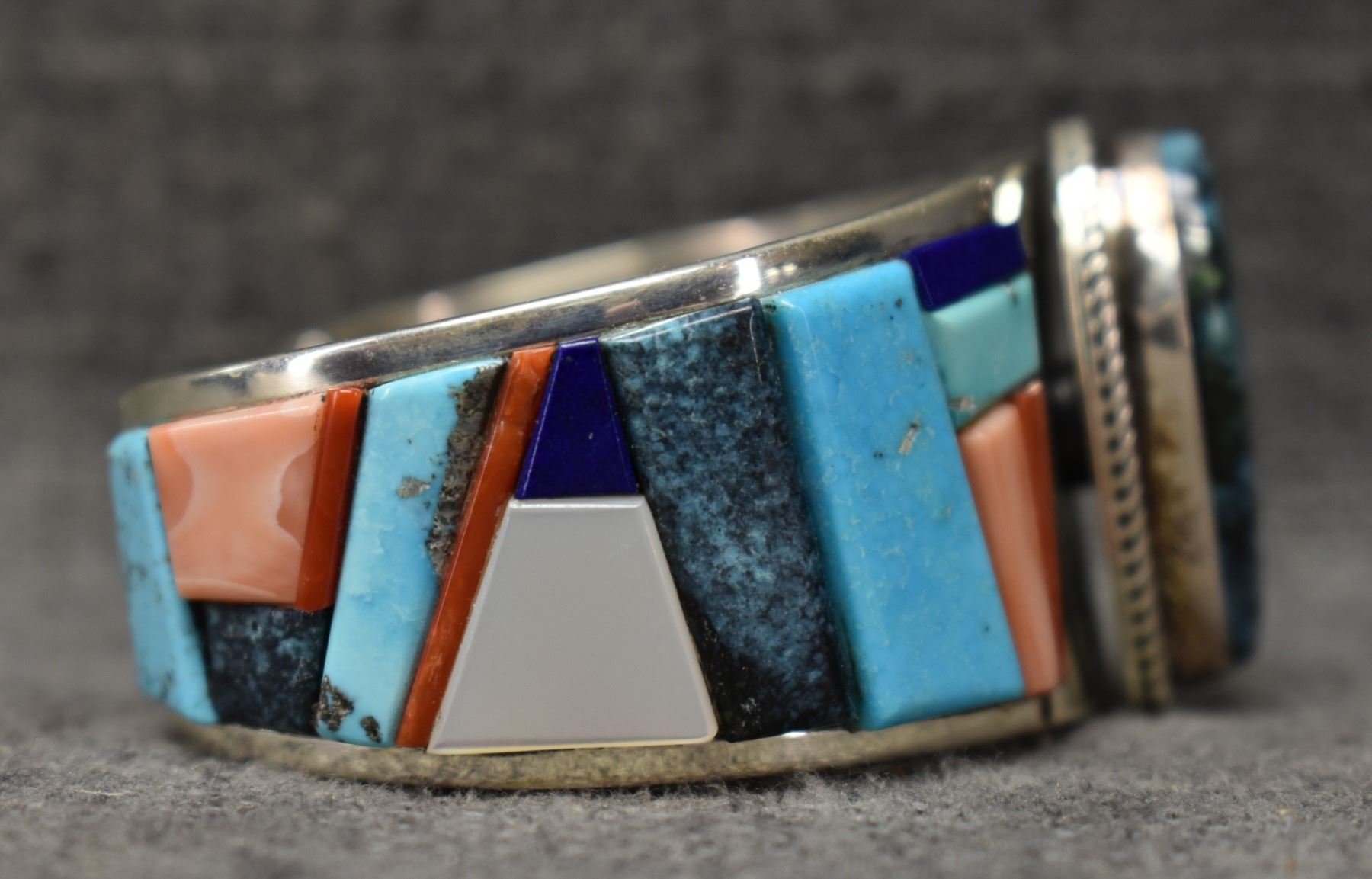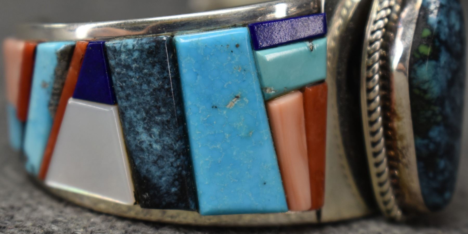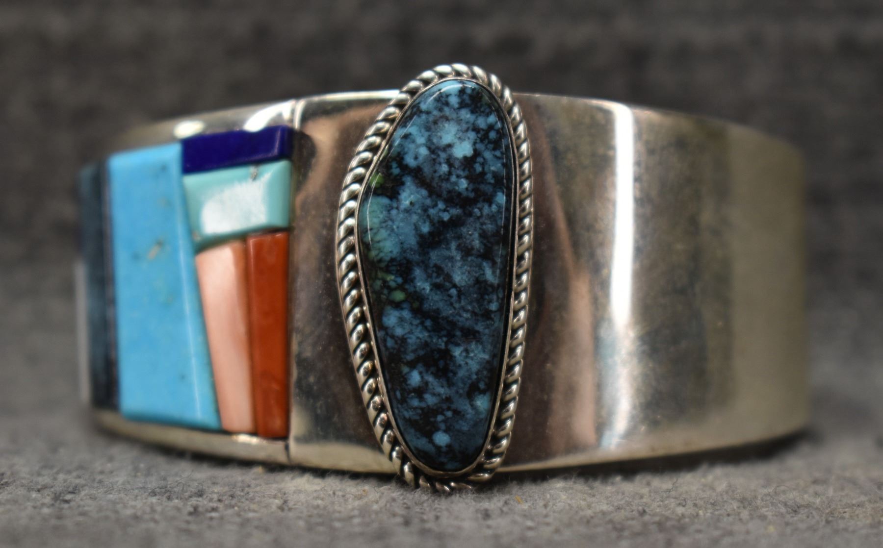 1970's Navajo. Sterling silver turquoise coral and shell. Signed T.Draper. 1'' x 4.75'' x 1.25''. Total weight 65 grams