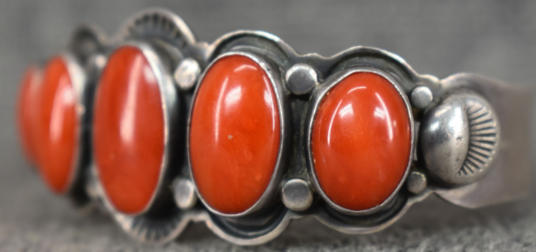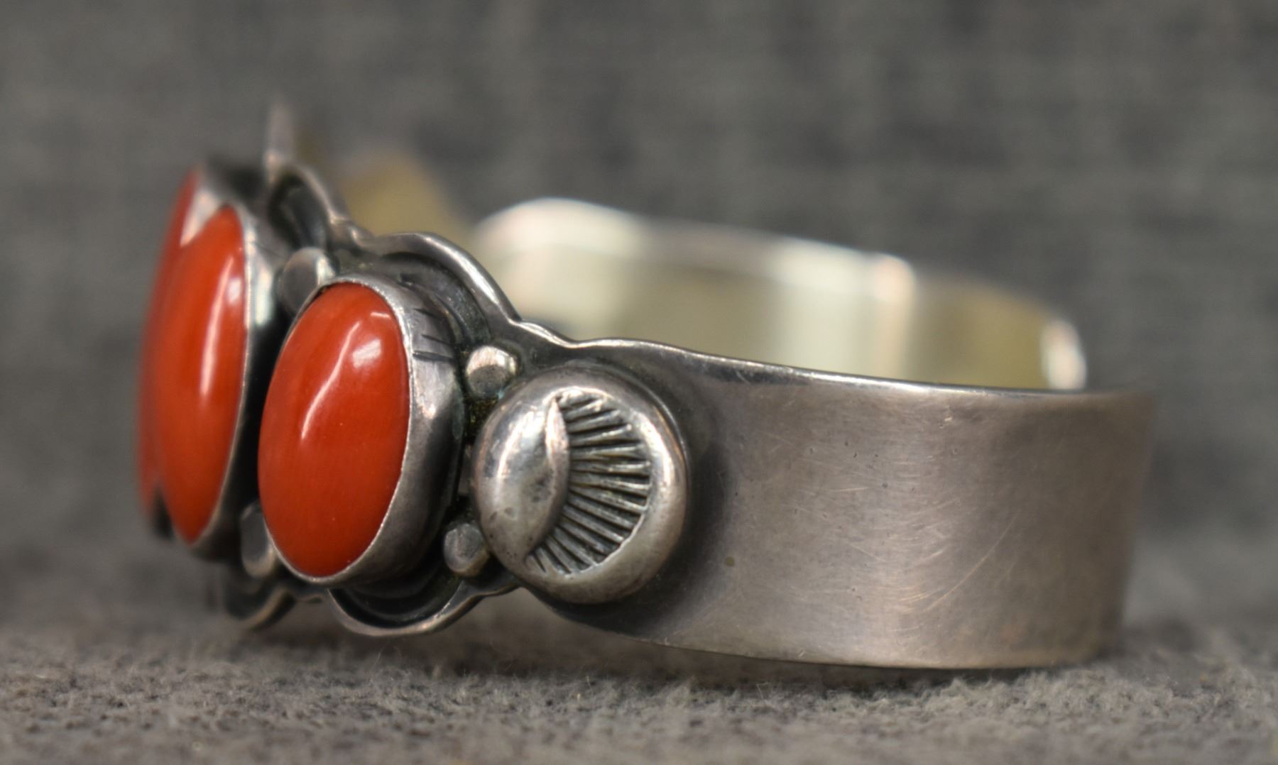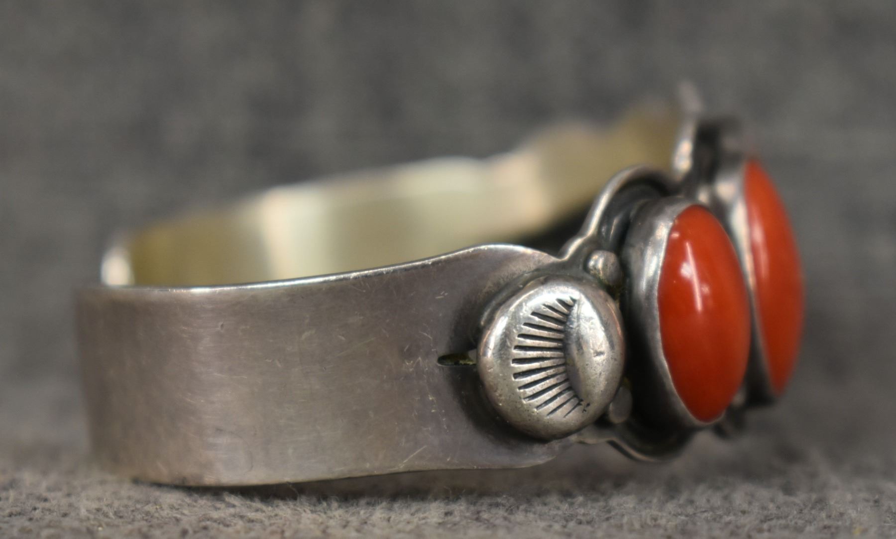1980's Navajo, sterling silver and coral with stamped design signed VB for Vivian Barbone. 1" x 5.25" x 1". Total weight 35 grams