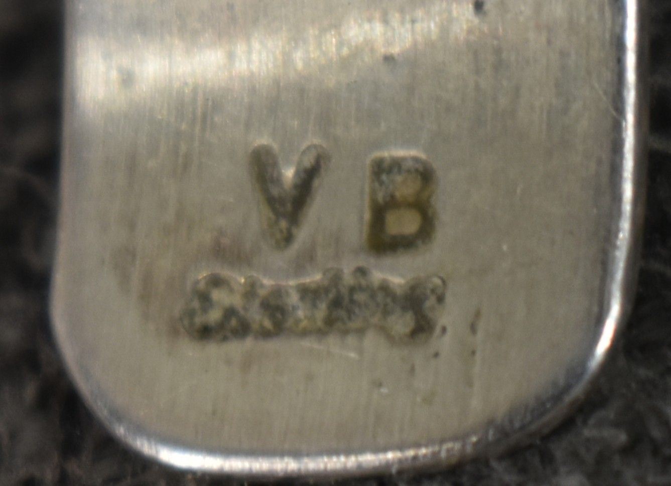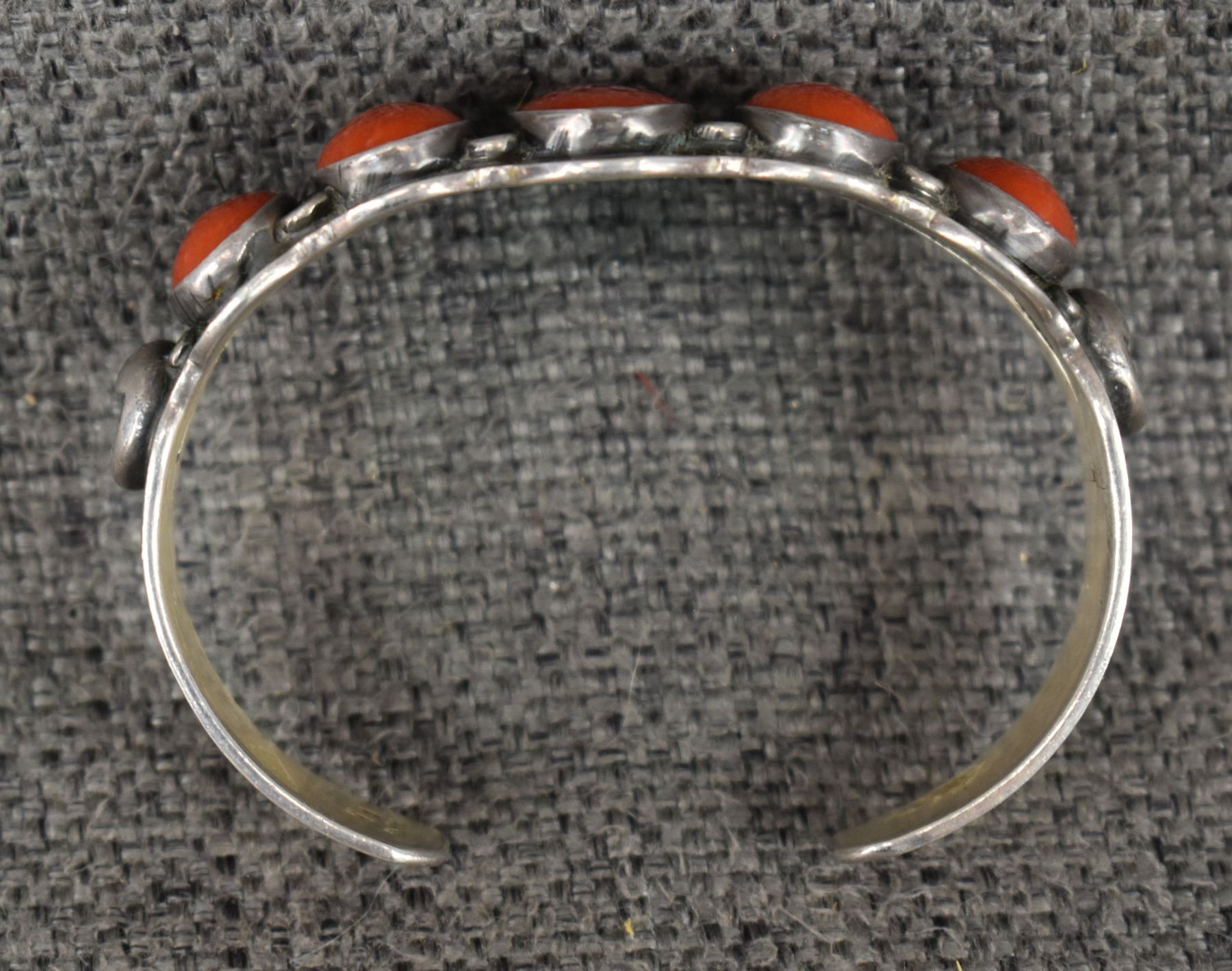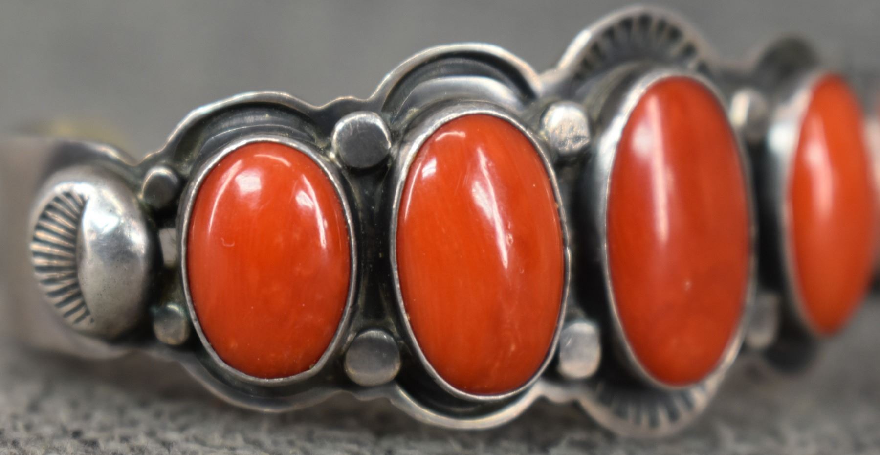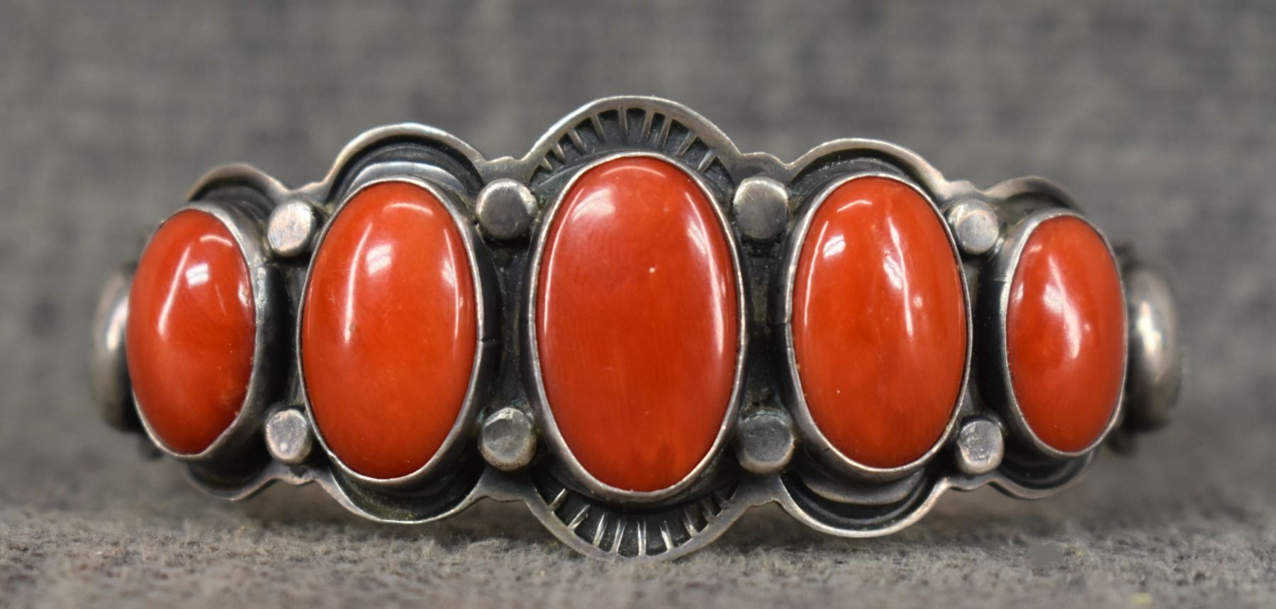1980's Navajo, sterling silver and coral with stamped design signed VB for Vivian Barbone. 1" x 5.25" x 1". Total weight 35 grams
