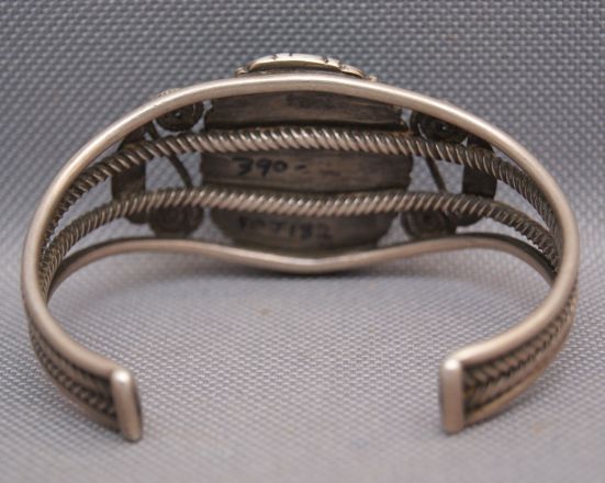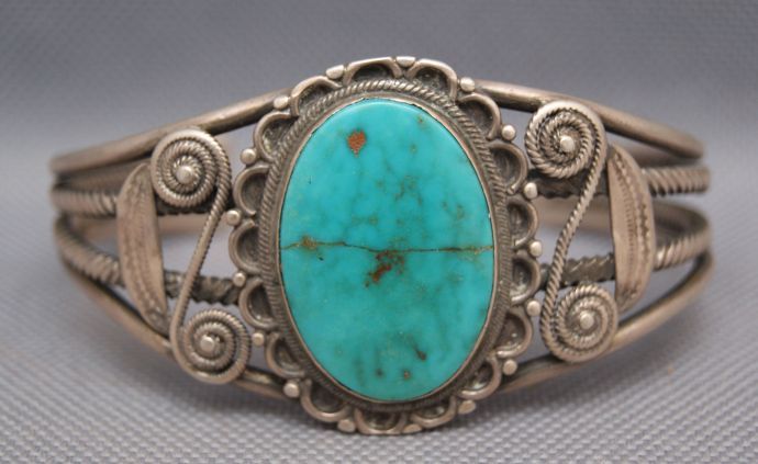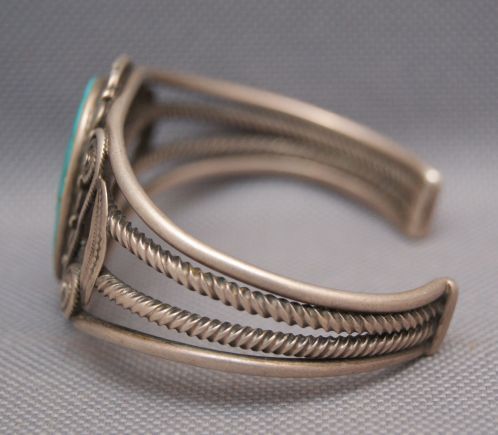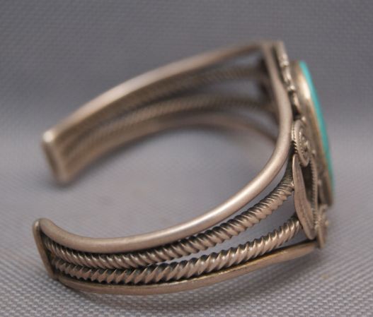 1930s sterling silver and turquoise with twisted wire in shank,has cracked stone 1.25" x 5.25" x 1.25"