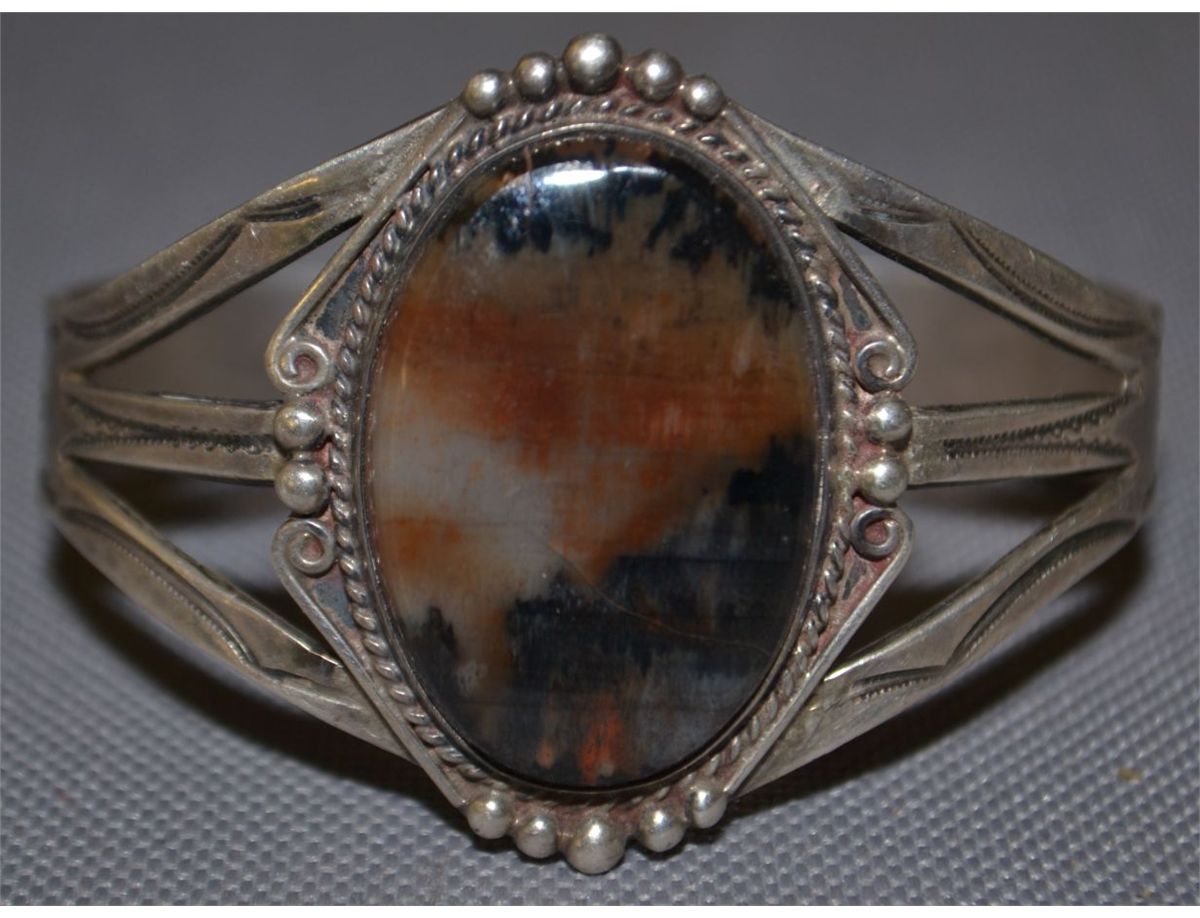 1940s sterling silver with stamped design and picture agate stone 5" x 1.75" x 1"