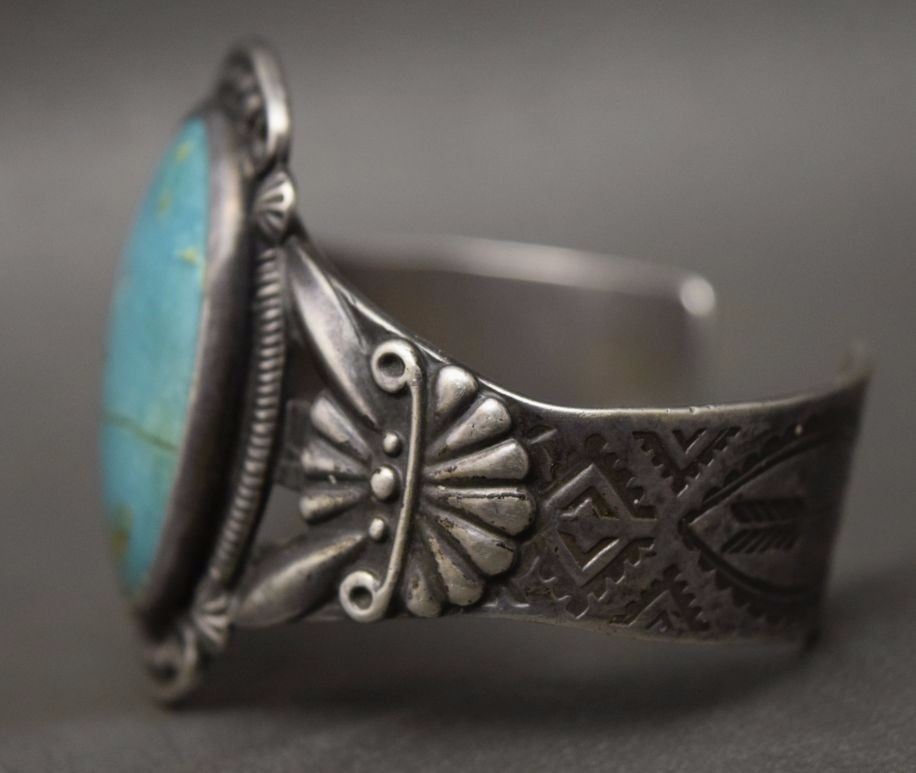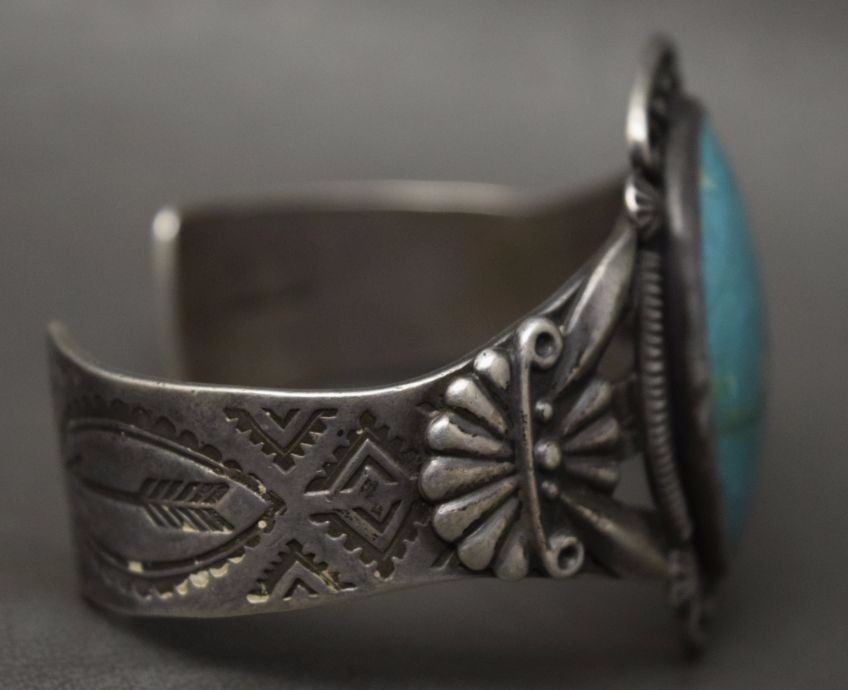 1970's sterling silver stamped design with single turquoise stone with crack 2'' x 5.5'' x 1'' total weight 56 grams