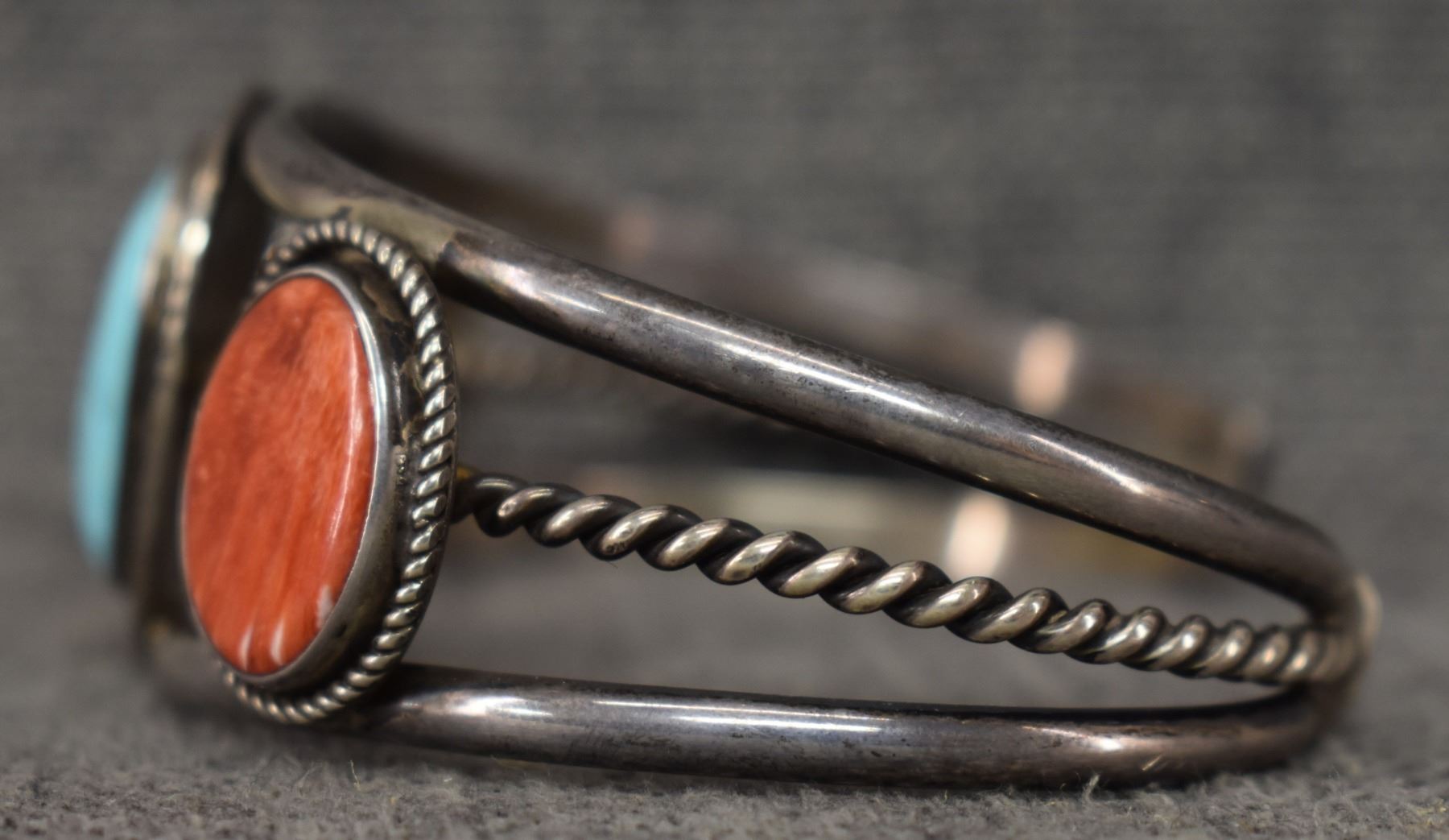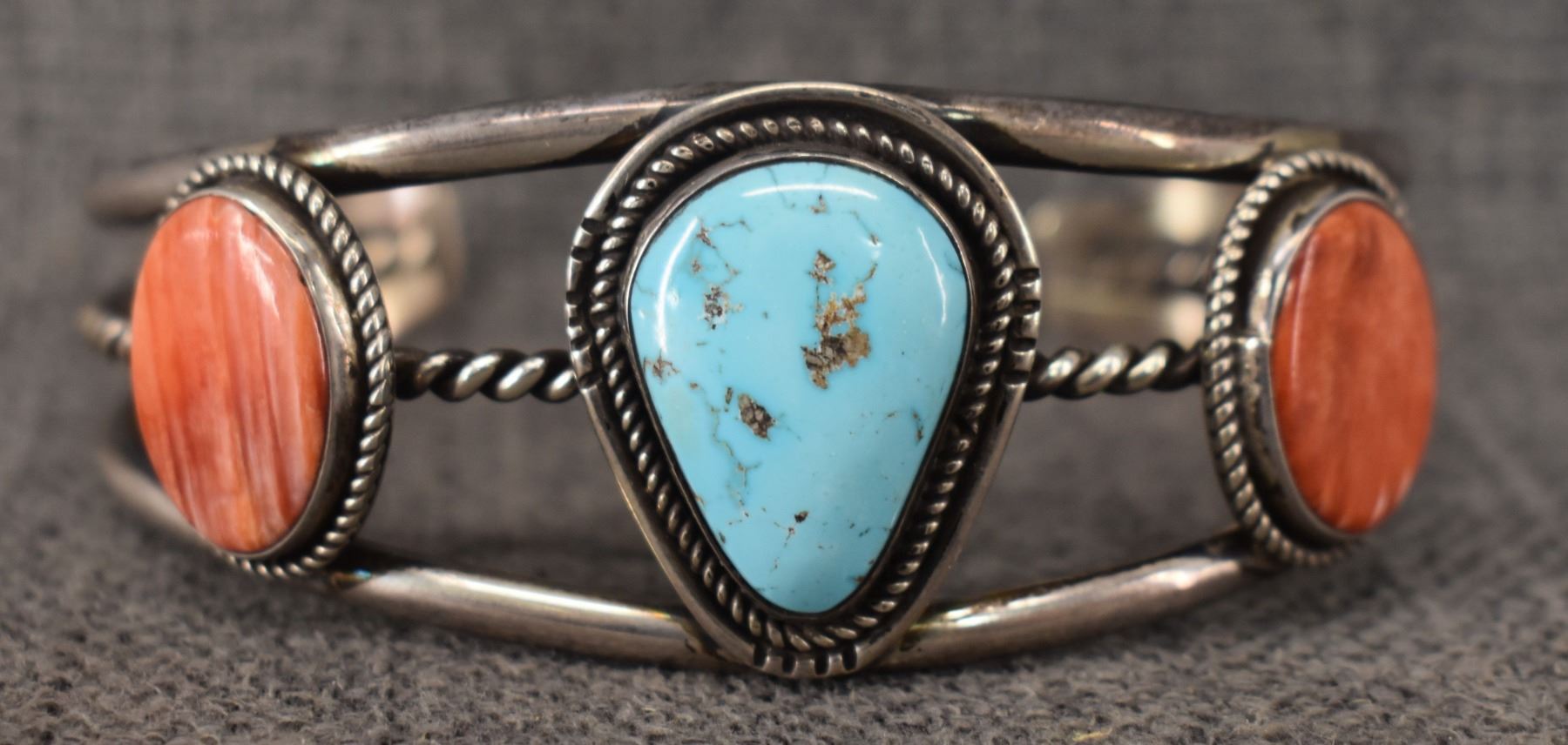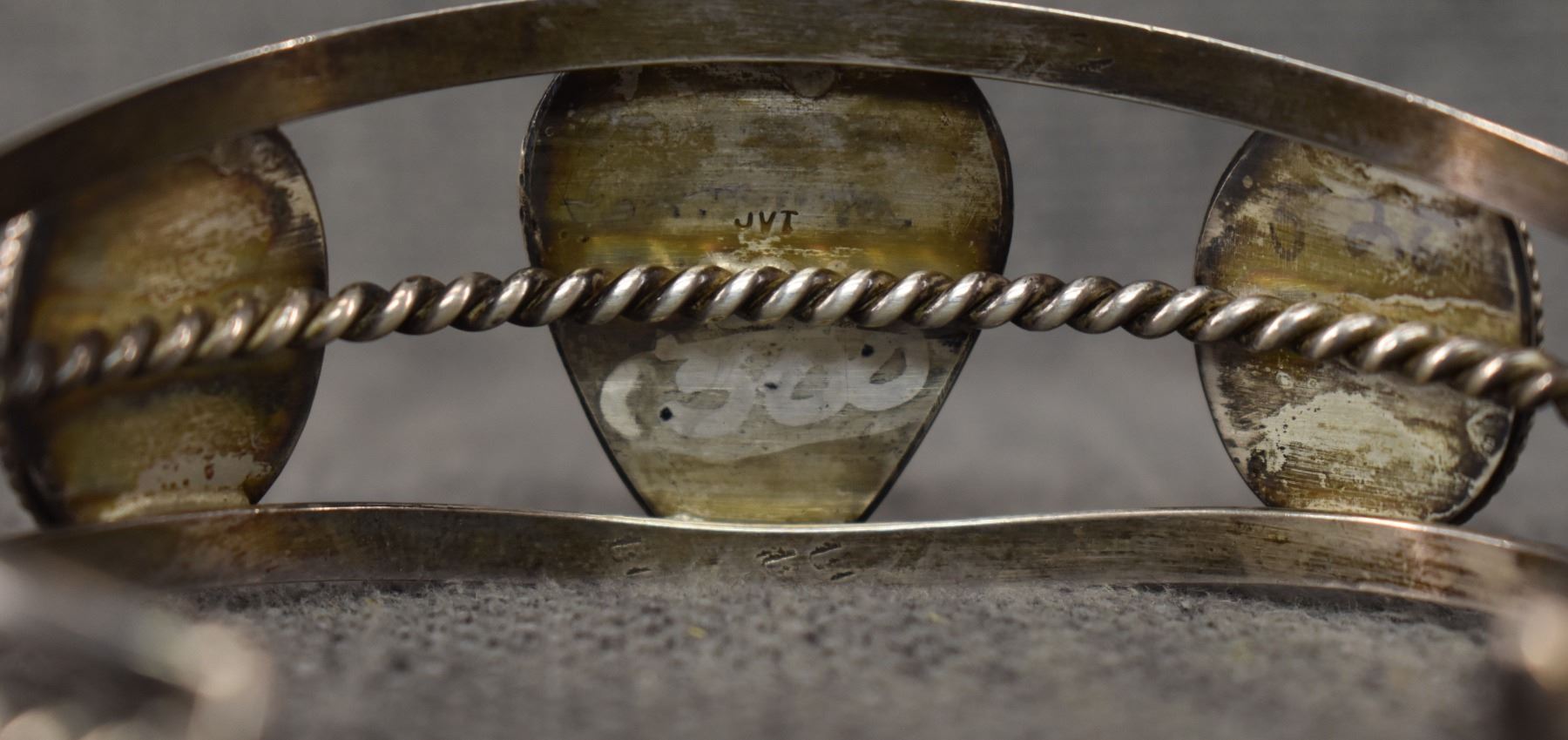 1970's Navajo. Sterling silver turquoise and shell bracelet. Signed J.V.T. 1.5'' x 6.75'' x 1.5'', total weight 55 grams